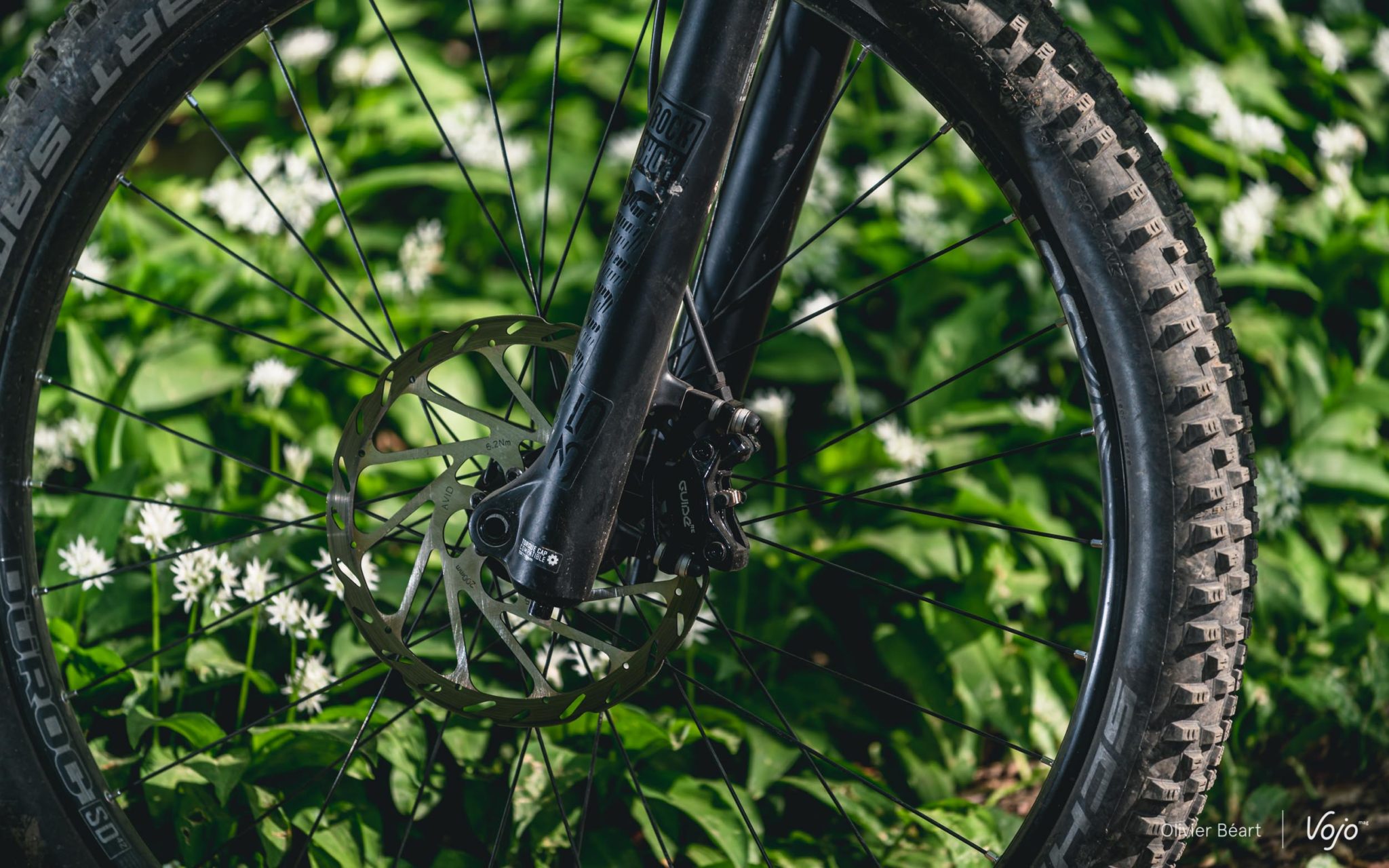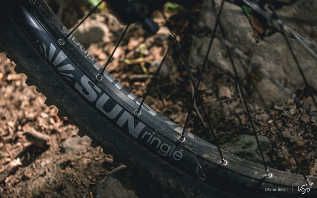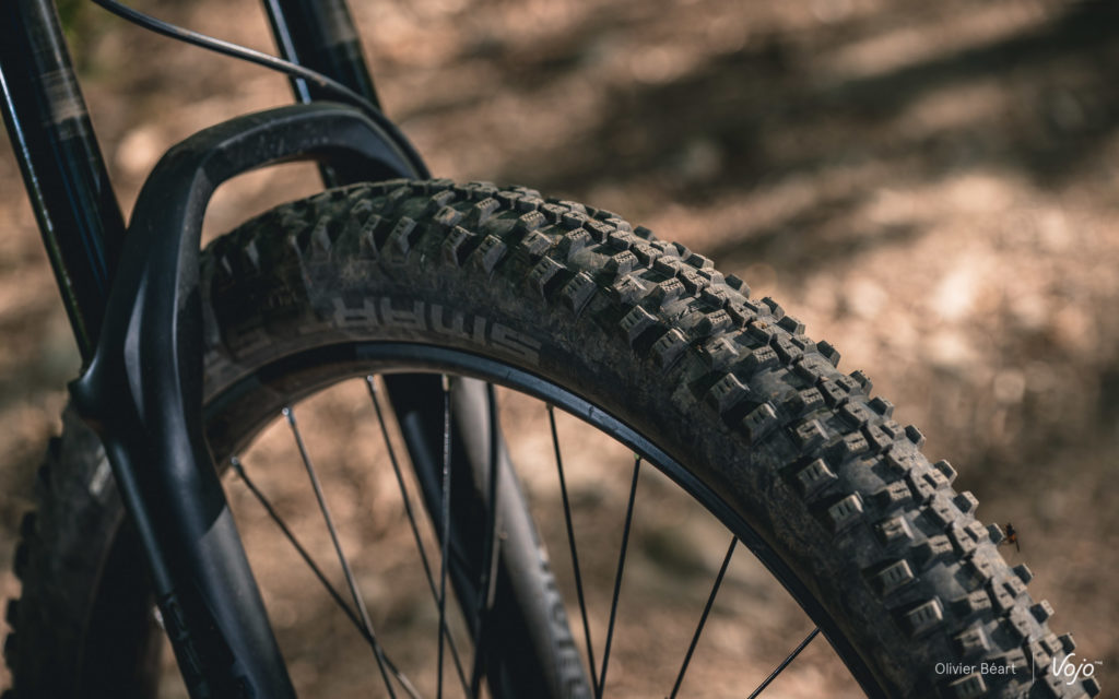 Enfin, on termine par les roues qui ont un diamètre de 27,5″ et qui sont montées avec de gros pneus « plus » en 2.8″ de section. Ici, Decathlon a clairement fait le choix du confort et de l’accessibilité en optant pour des roues plus petites avec des pneus plus gros, plutôt que pour du 29″ à pneus plus fins, plus précis mais aussi un poil plus pointus à piloter pour un novice. Les jantes provenant de chez Sun Ringlé se sont montrées solides et, comme elles sont tubeless ready, on vous conseille d’effectuer au plus vite un montage sans chambres à air avec du latex pour diminuer les risques de crevaisons et augmenter l’accroche. Les pneus Schwalbe Smart Sam Performance offrent un bon compromis accroche/rendement, mais on gagnera à les changer par un modèle plus spécifique et performant pour sa pratique (par exemple des Magic Mary).
