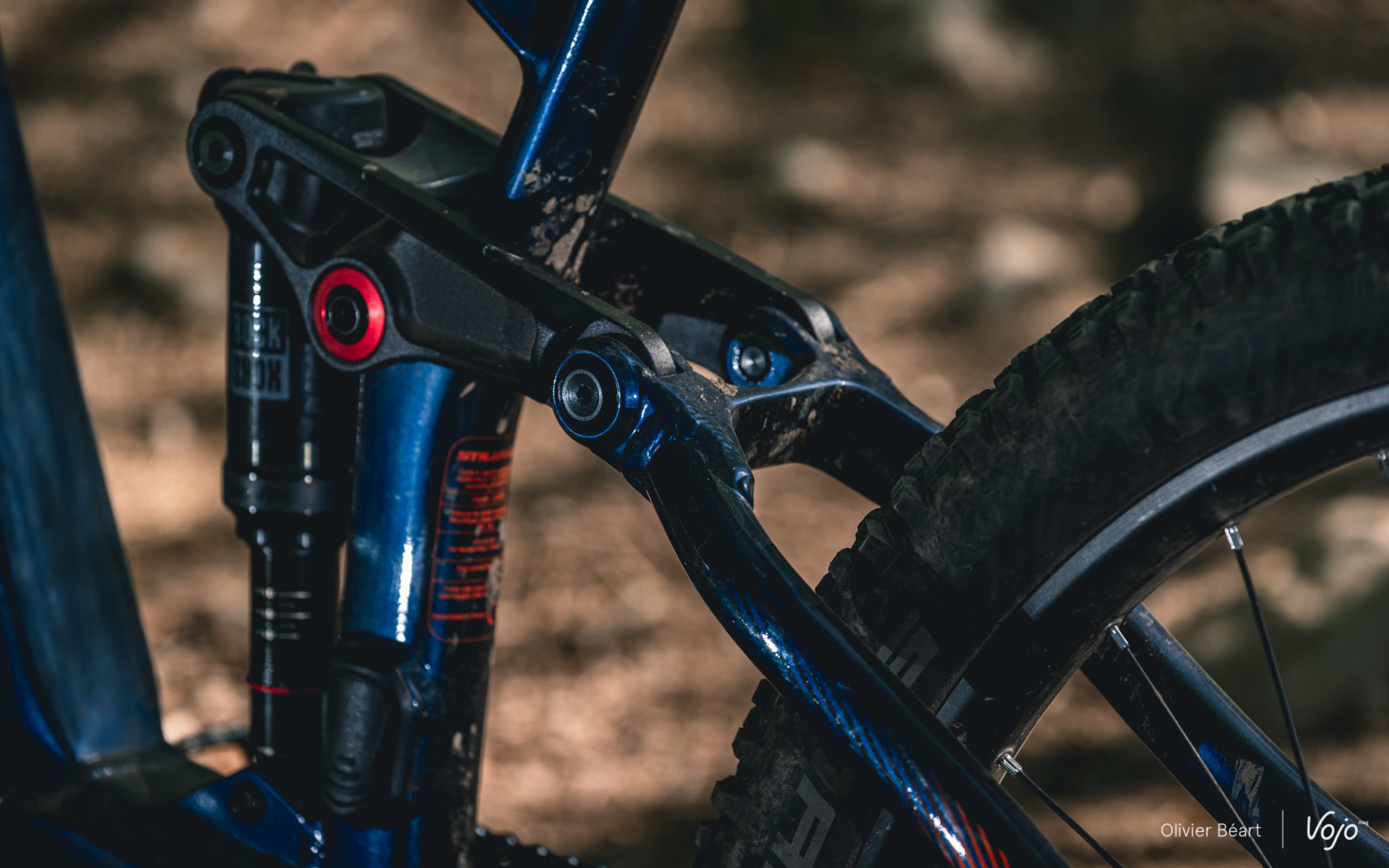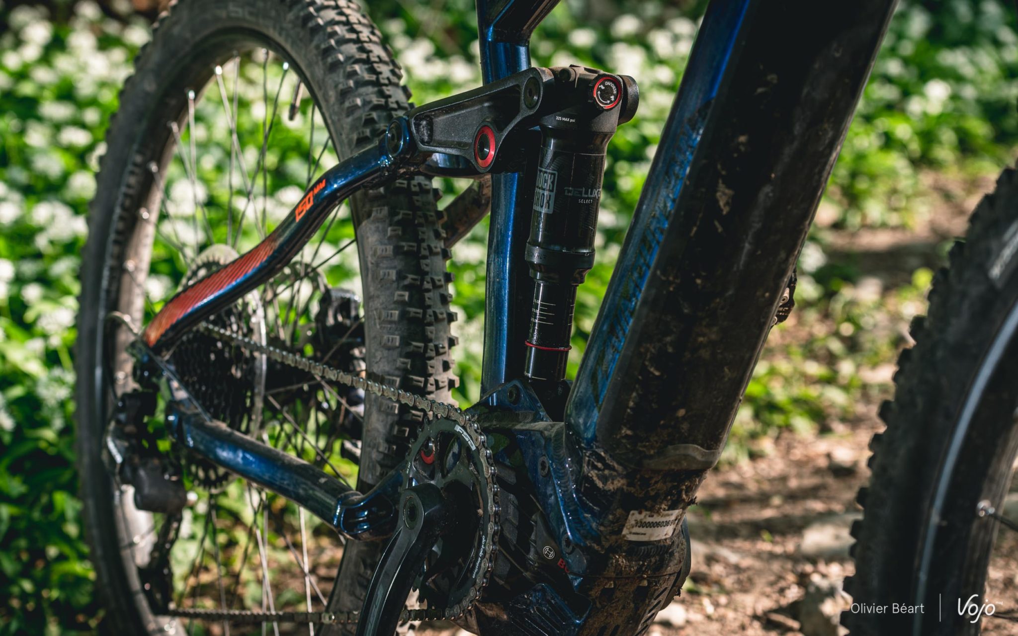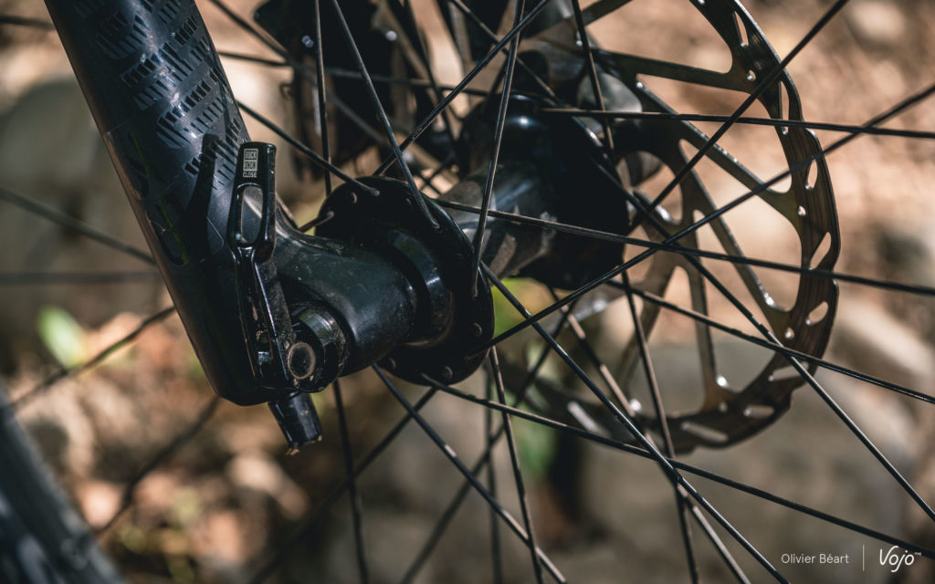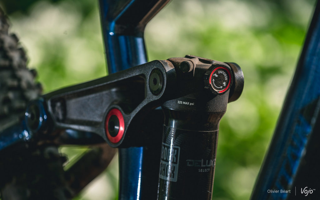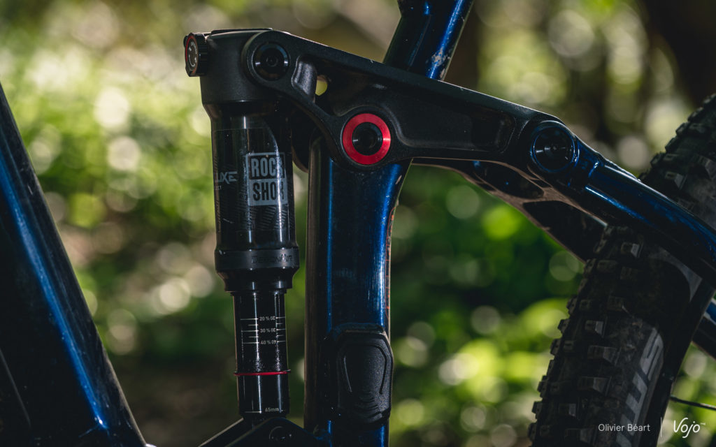 Cette suspension est ici couplée à un amortisseur RockShox Deluxe, sur lequel on remarque qu’il n’y a pas de levier permettant de le bloquer pour les portions roulantes. Si ce type d’appendice est très utile sur un vélo classique, sans assistance, et pour des pratiques typées compétition, il n’est pas du tout indispensable à nos yeux sur un VTT électrique où on gagnera beaucoup plus à laisser la suspension active en permanence. D’autant plus qu’ici, le pompage est très limité. Par contre, la plage du réglage du rebond (mollette rouge) nous semble trop limitée et sur le terrain, il nous a souvent semblé trop lent.