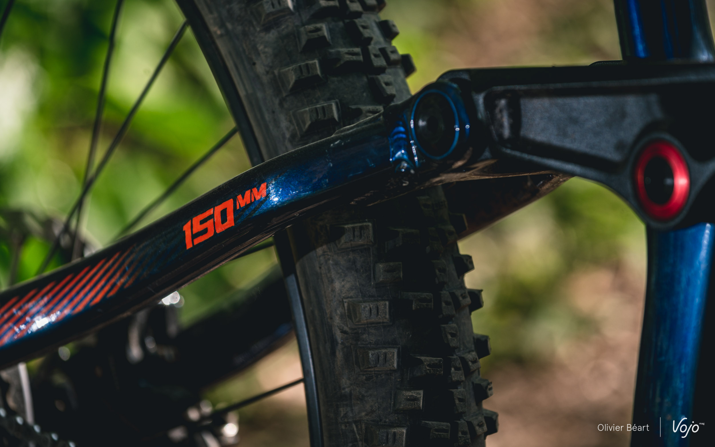 Le débattement est de 150mm, soit ce qu’il faut sur un vélo électrique pour envisager une vraie utilisation polyvalente. Vu le poids de l’engin, ce n’est pas trop pour envisager une utilisation rando/balade (pour laquelle on pourrait se contenter de 100/120mm sur un vélo classique), et c’est tout juste assez pour commencer à envisager un usage plus musclé, typé enduro et/ou montagnard. On constate aussi que tous les points de pivot sont montés sur des roulements et protégés par de jolis caches anodisés.