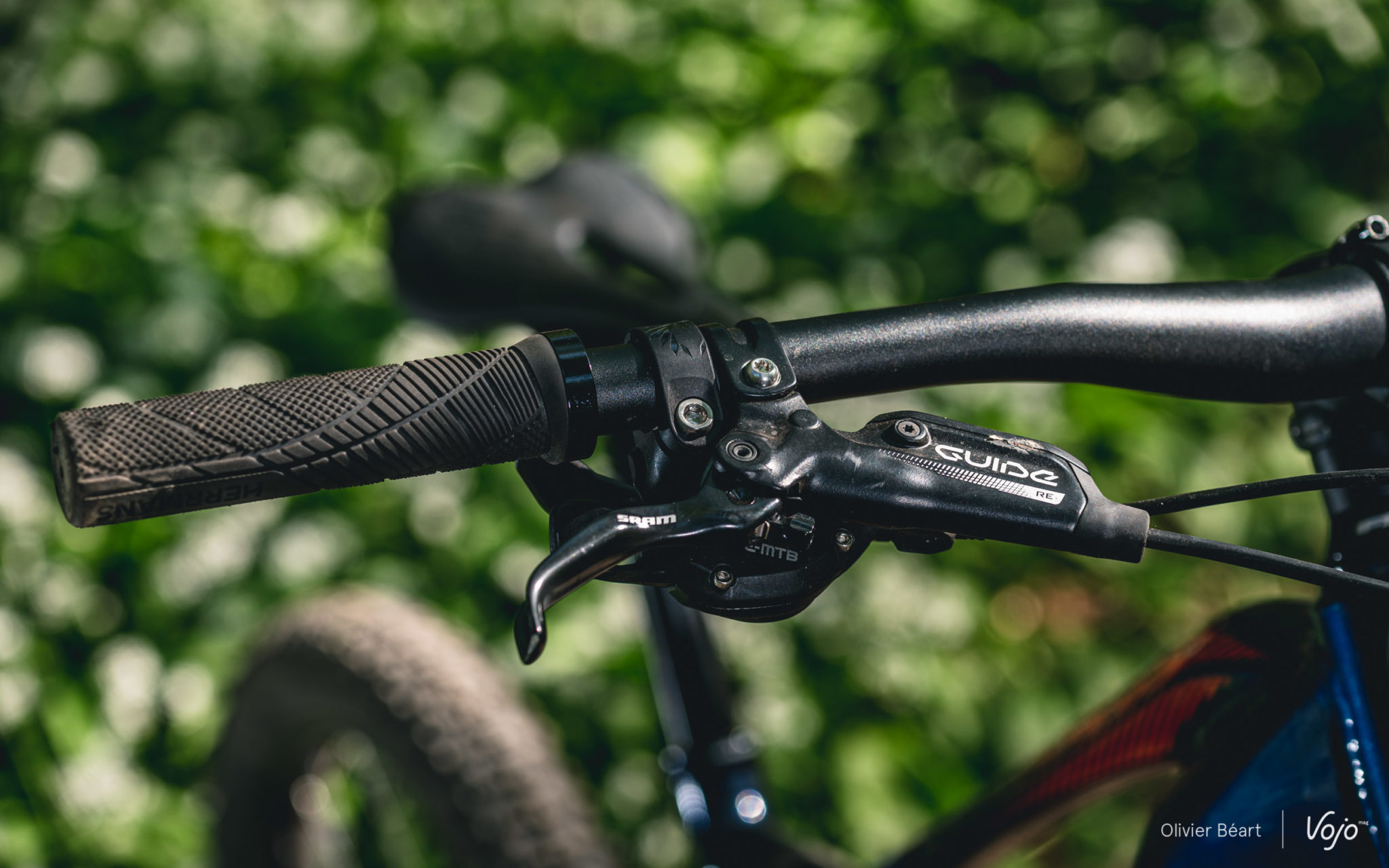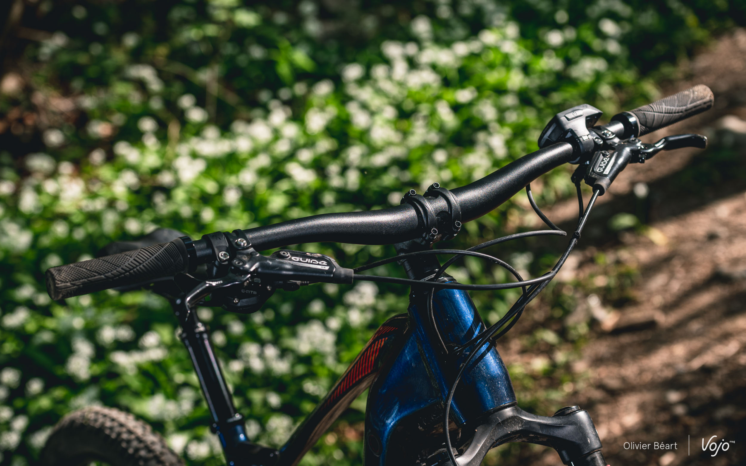 Le freinage est confié aux Sram Guide RE, spécialement dédiés aux vélos électriques. Ils sont constitués de l’assemblage d’un levier du modèle Guide de la précédente génération, avec un étrier de la série Code de descente à 4 pistons, lui aussi de la génération précédente. Bref, pas du matos dernier cri, mais force est de constater qu’avec les disques de 200mm à l’avant comme à l’arrière, cela procure un freinage puissant, sûr et aussi plutôt facile à doser. Bref, un choix malin !