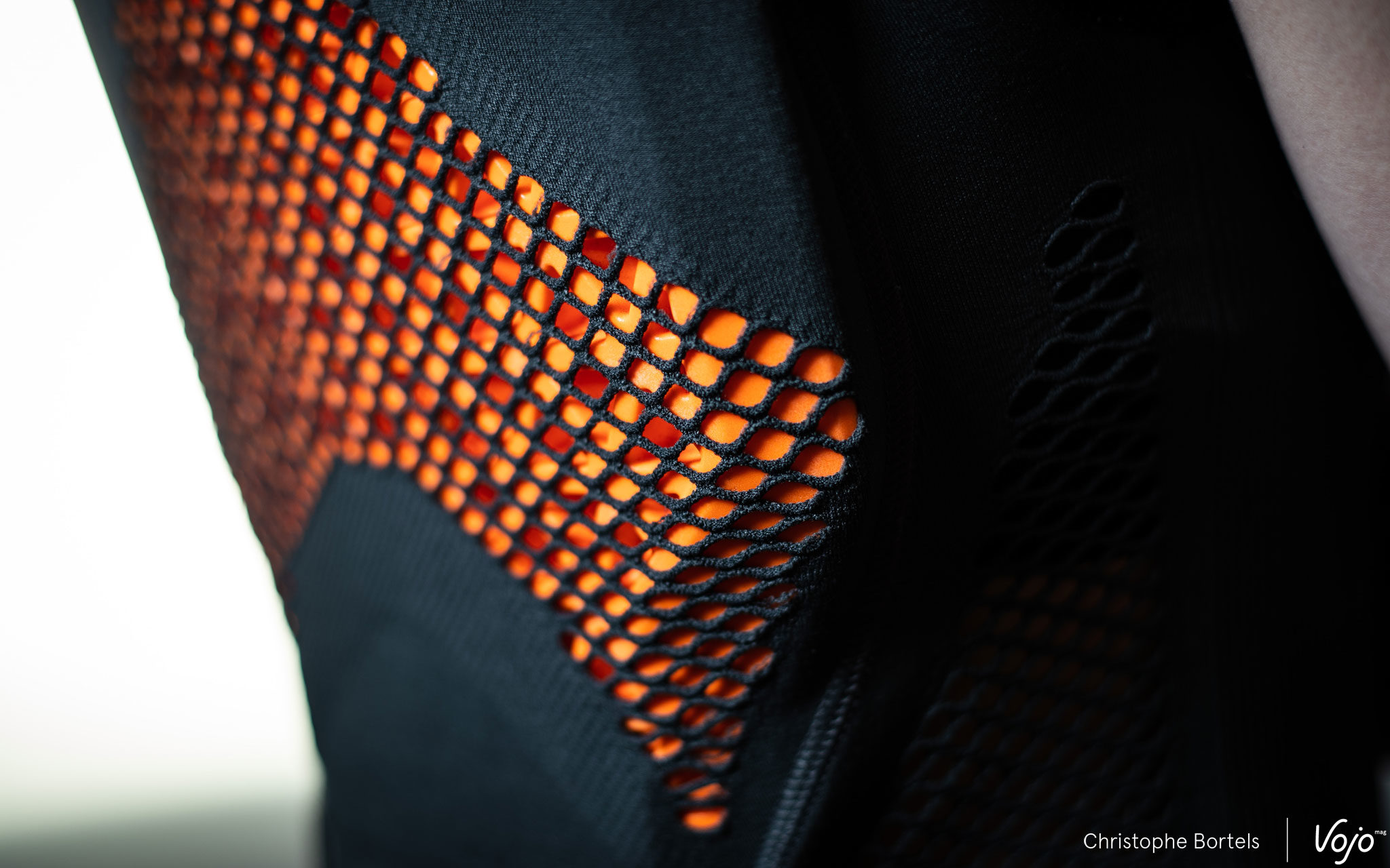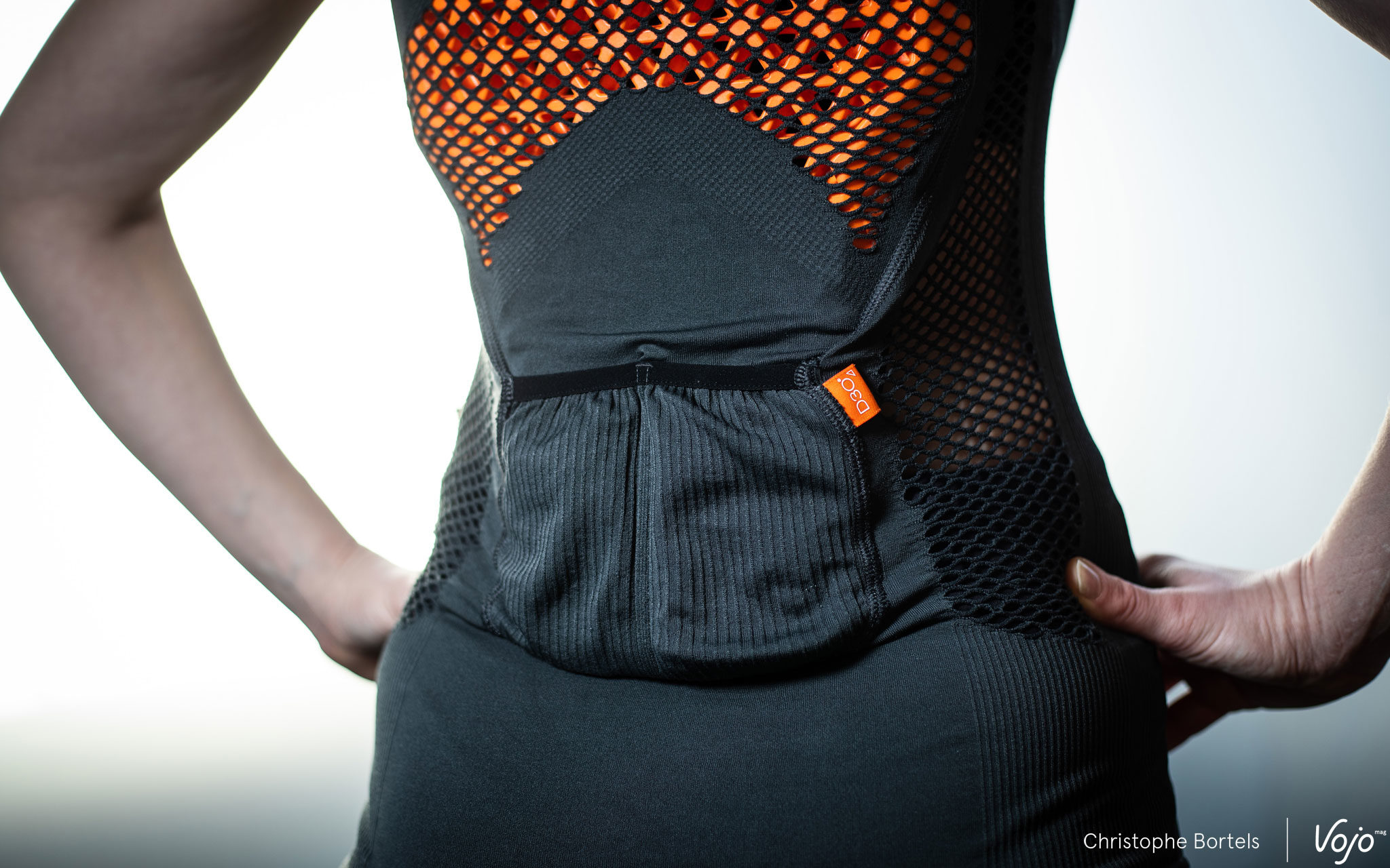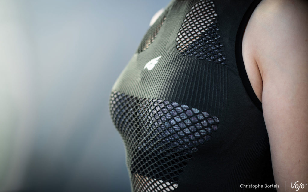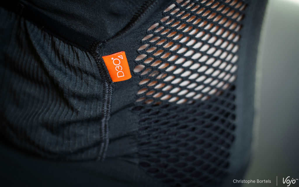 Nous sommes donc face à une dorsale « seamless », autrement dit sans couture, faite d’une seule pièce et à enfiler comme un t-shirt. Mais plutôt que de t-shirt, on devrait en fait parler de première couche technique puisque toute la philosophie du produit est là : un gilet de protection porté au plus près du corps, avec un effet seconde peau, façon sous-vêtement technique qu’on porte sous le maillot en été quand il fait chaud pour réguler l’humidité et la température corporelle. On verra plus loin que cette dorsale ne se limite pas pour autant à un usage estival.