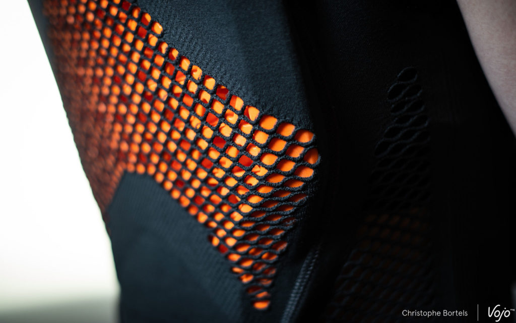 Pour la construction de son gilet, Bluegrass utilise le Dryarn, un tissu technique et particulièrement extensible développé par une entreprise italienne, ce qui permet à la marque de proposer un produit unisexe et de ne le décliner qu’en deux tailles : S/M et L/XL. La maille du tissu est classique sur la majorité du gilet, à l’exception du ventre, du haut de la poitrine, des flancs et d’une bonne partie de la zone dorsale, au-dessus de la plaque, où l’on retrouve un maillage nettement plus ouvert, dans le but de maximiser la ventilation.