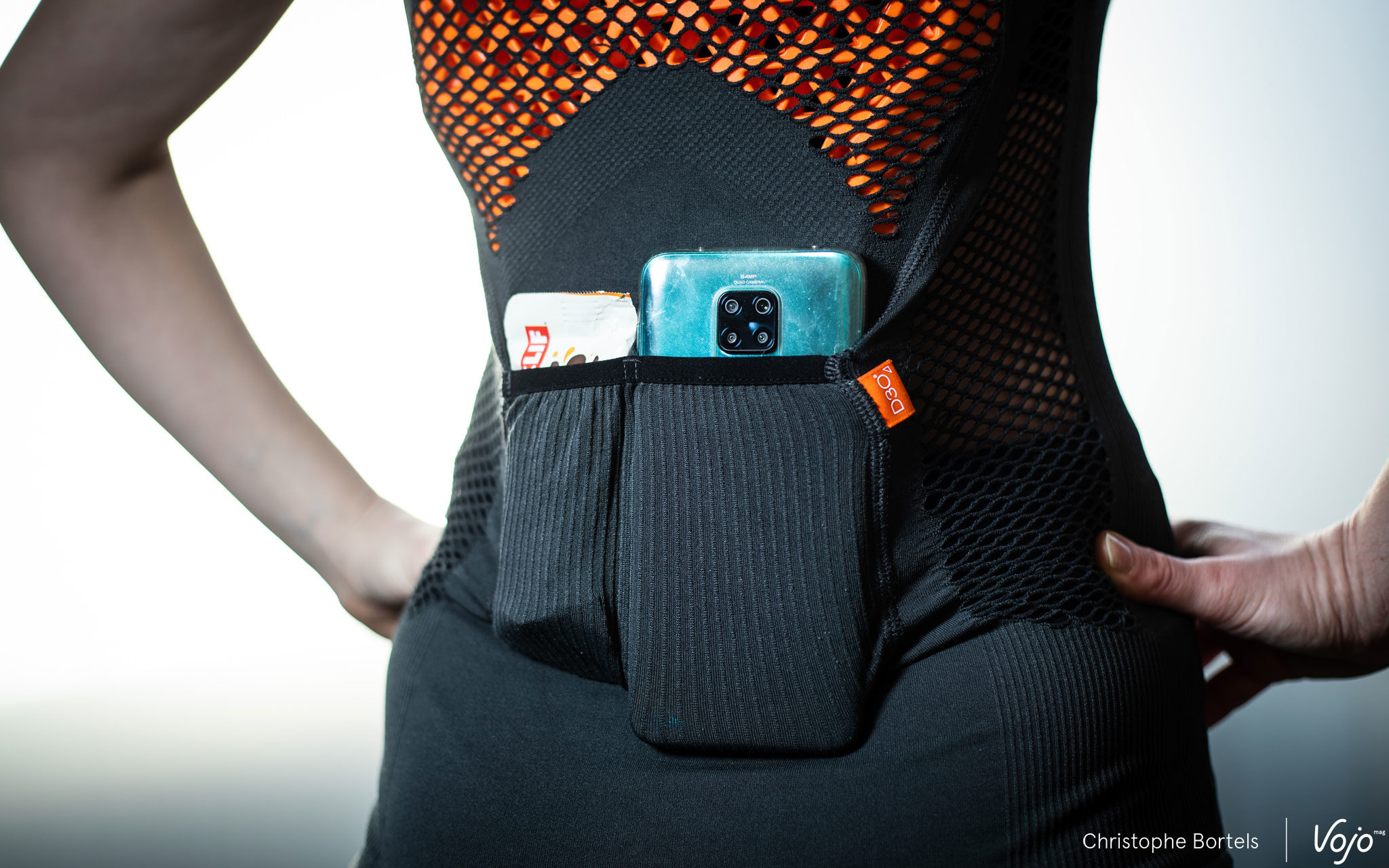 Un petit bémol tout de même : sur le terrain, l’accès aux deux poches arrière nous est rapidement apparu un peu délicat. Pour en retirer quelque chose, ça va encore (quand il dépasse de la poche), mais c’est au moment de le remettre qu’il faut faire preuve de dextérité pour retrouver la poche tout d’abord, puis pour passer au-delà de l’élastique qui en marque l’entrée. C’est d’autant plus dommage que si les poches semblent minuscules au premier abord, le tissu très extensible permet en réalité d’y mettre des objets bien plus grands qu’on ne le pense. Elles peuvent par exemple sans problème accueillir un smartphone moderne de plus de 6 pouces.
