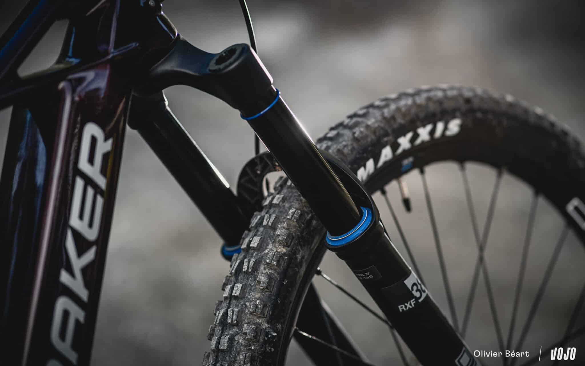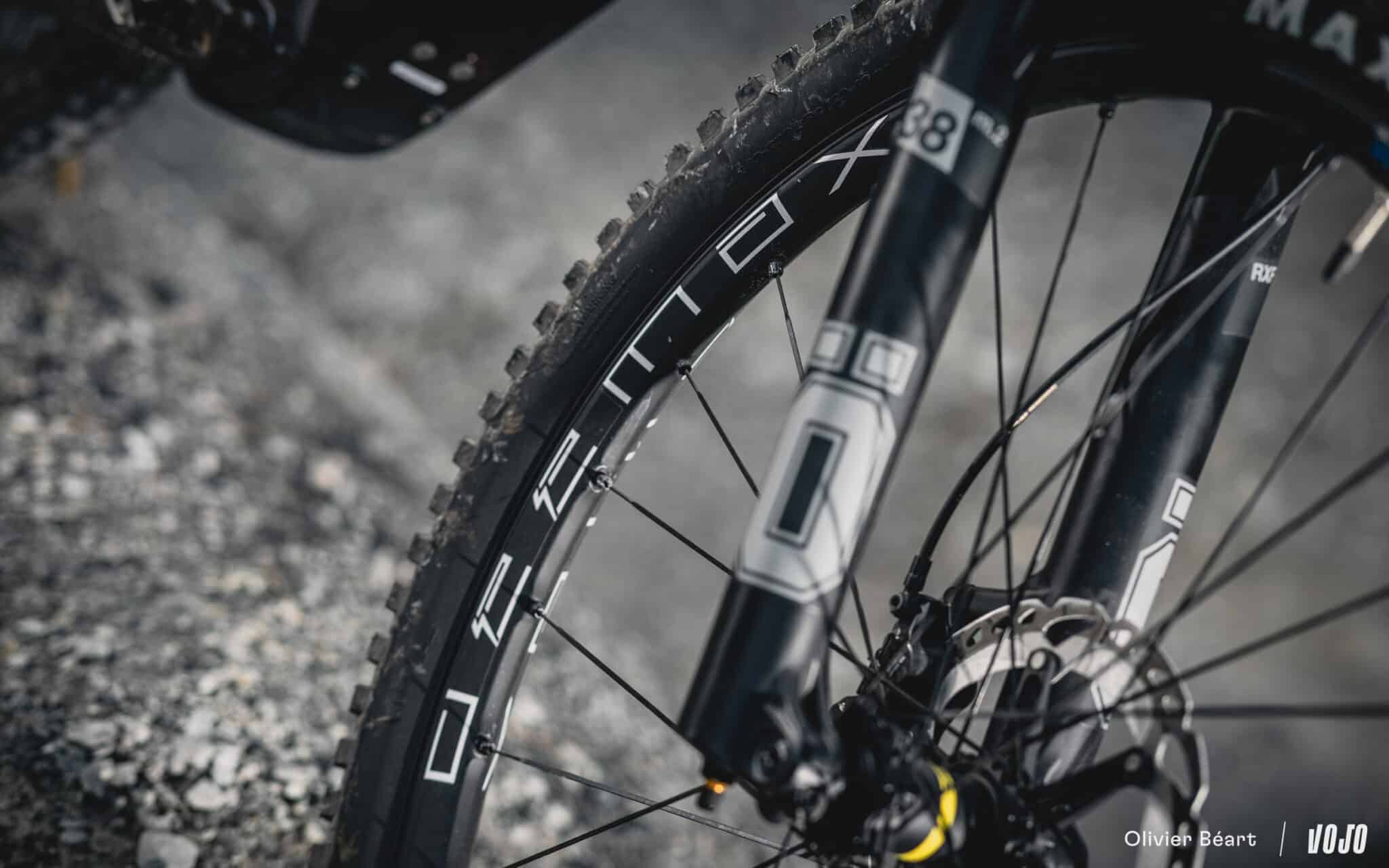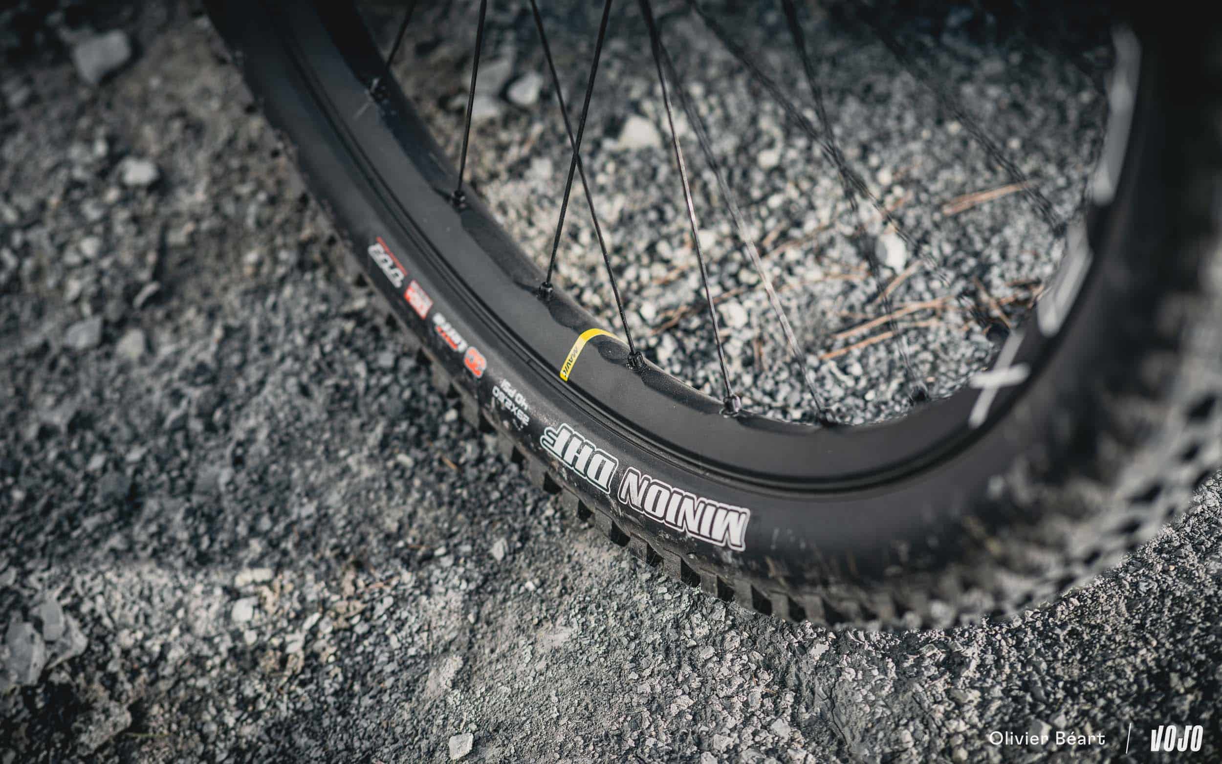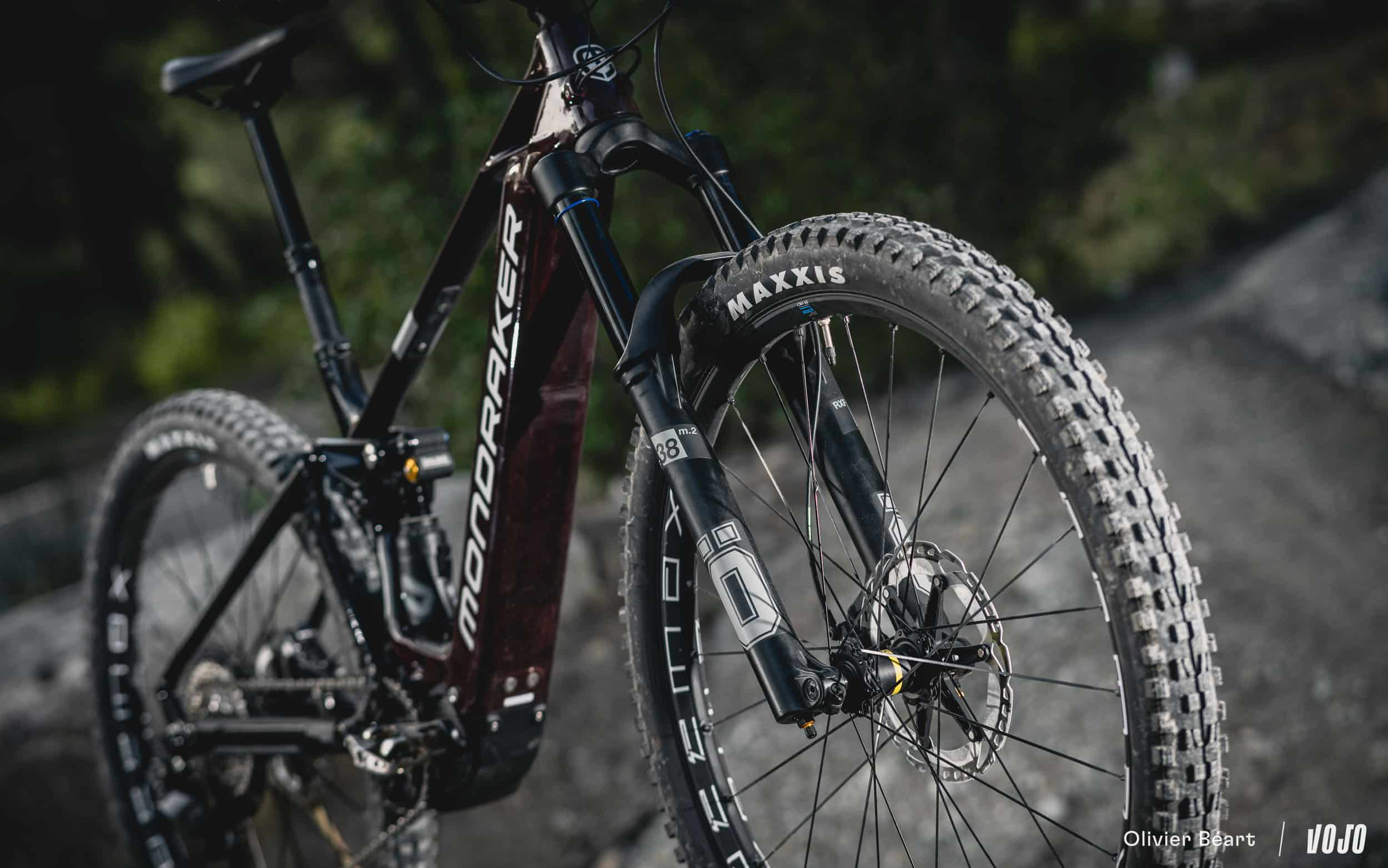 Les roues en 29 pouces sont chaussées de pneus Maxxis Minion DHR et DHF en carcasse Exo+ et section de 2.6″. La carcasse Exo+ peut sembler un peu légère pour un programme gros enduro sur terrains agressifs, mais en usage all-mountain, c’est plutôt un bon compromis et ils grèvent moins le poids et le rendement que des DoubleDown. La section de 2.6 paraît imposante sur papier, mais nous l’avons vite oubliée et nous n’avons pas trouvé le comportement flou dans les appuis.
