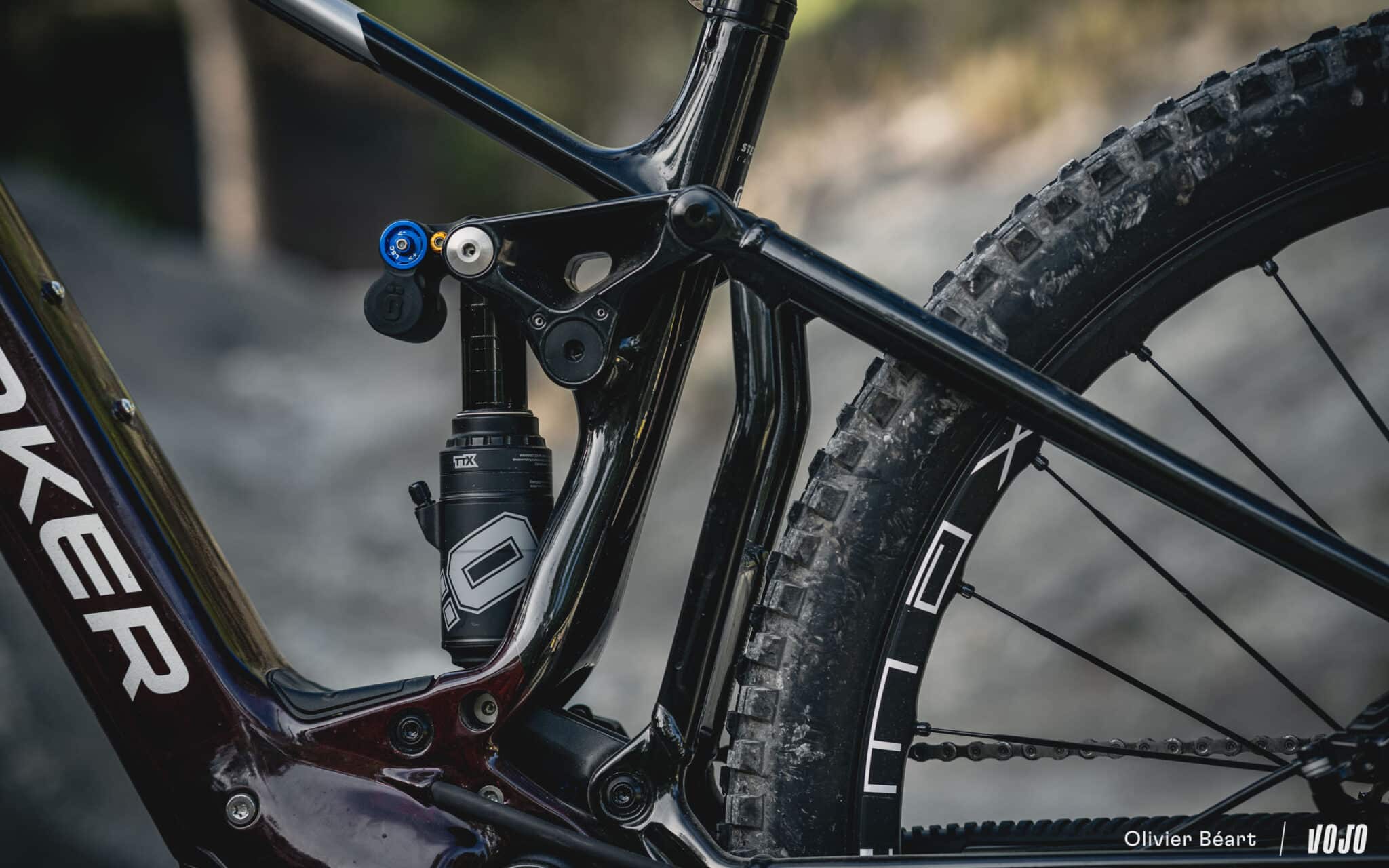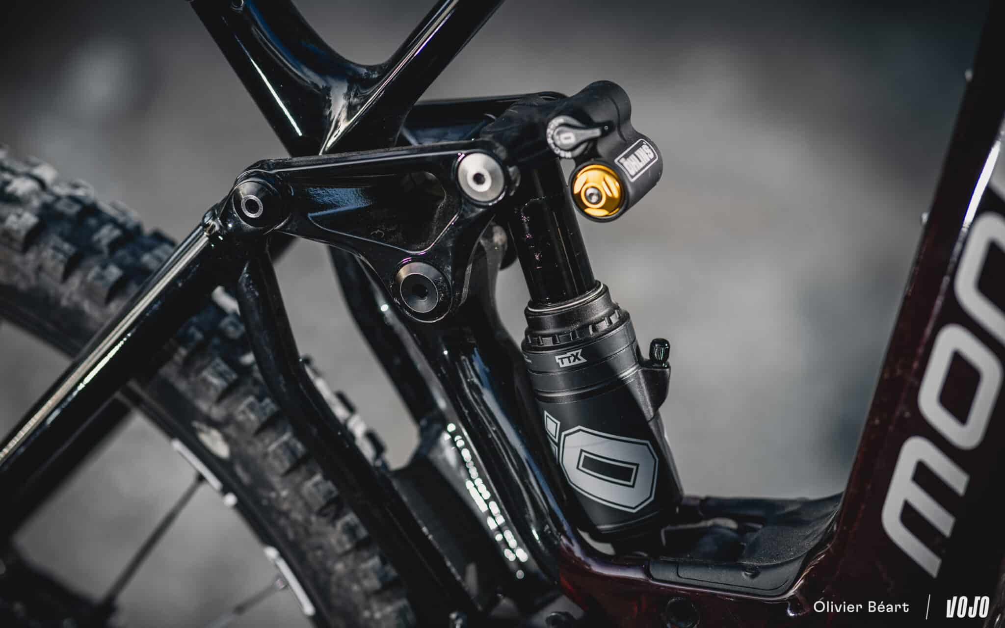 Elle est ici combinée à un amortisseur Öhlins TTX Air en format 205x65mm avec réglage des compressions basses et hautes vitesses (avec levier pour durcir la suspension pour les ascensions) et du rebond. La fixation sur la biellette supérieure est au format Trunnion pour un assemblage plus rigide et le setting hydraulique ainsi que du volume d’air a été spécifiquement défini par Mondraker et Öhlins.