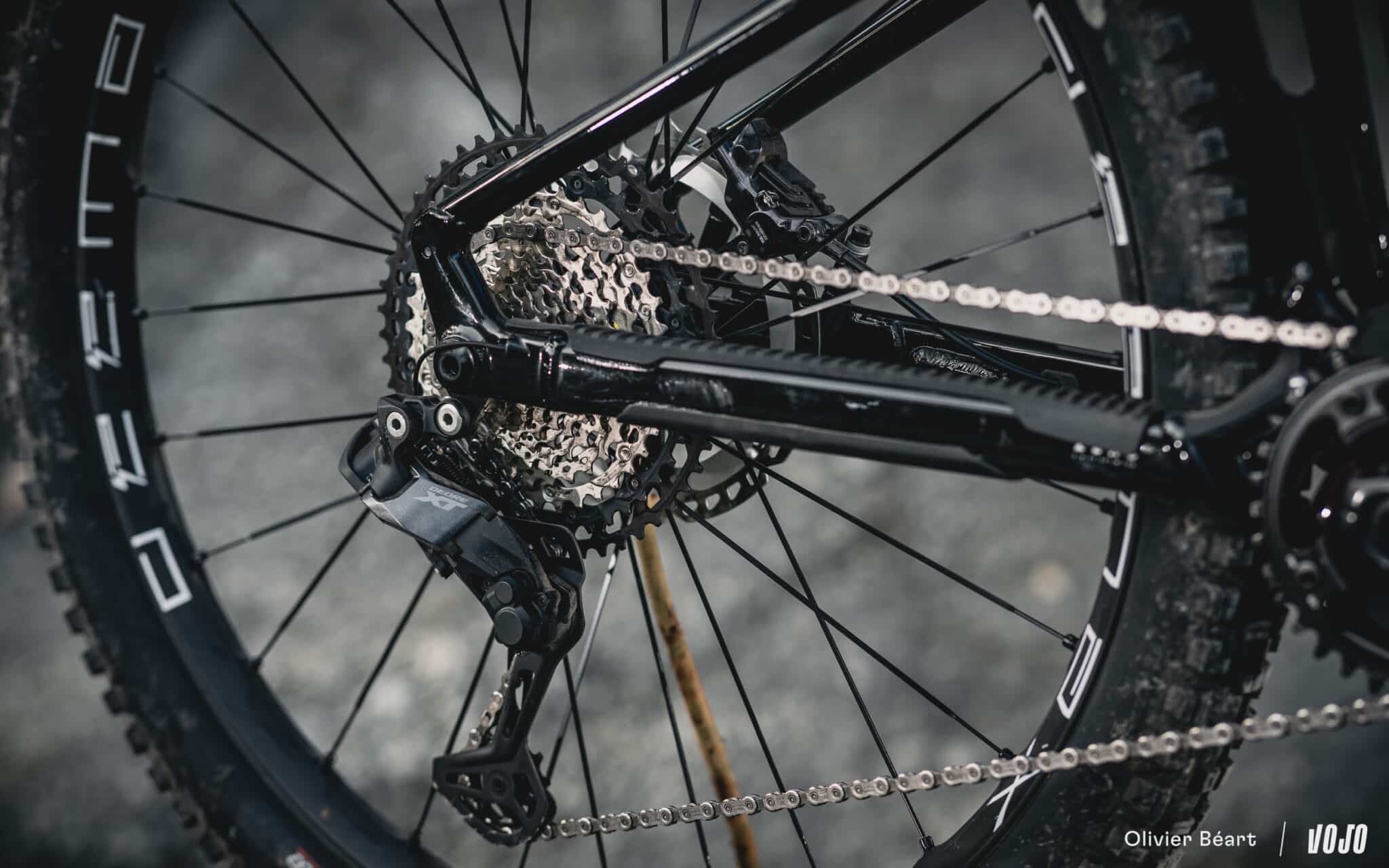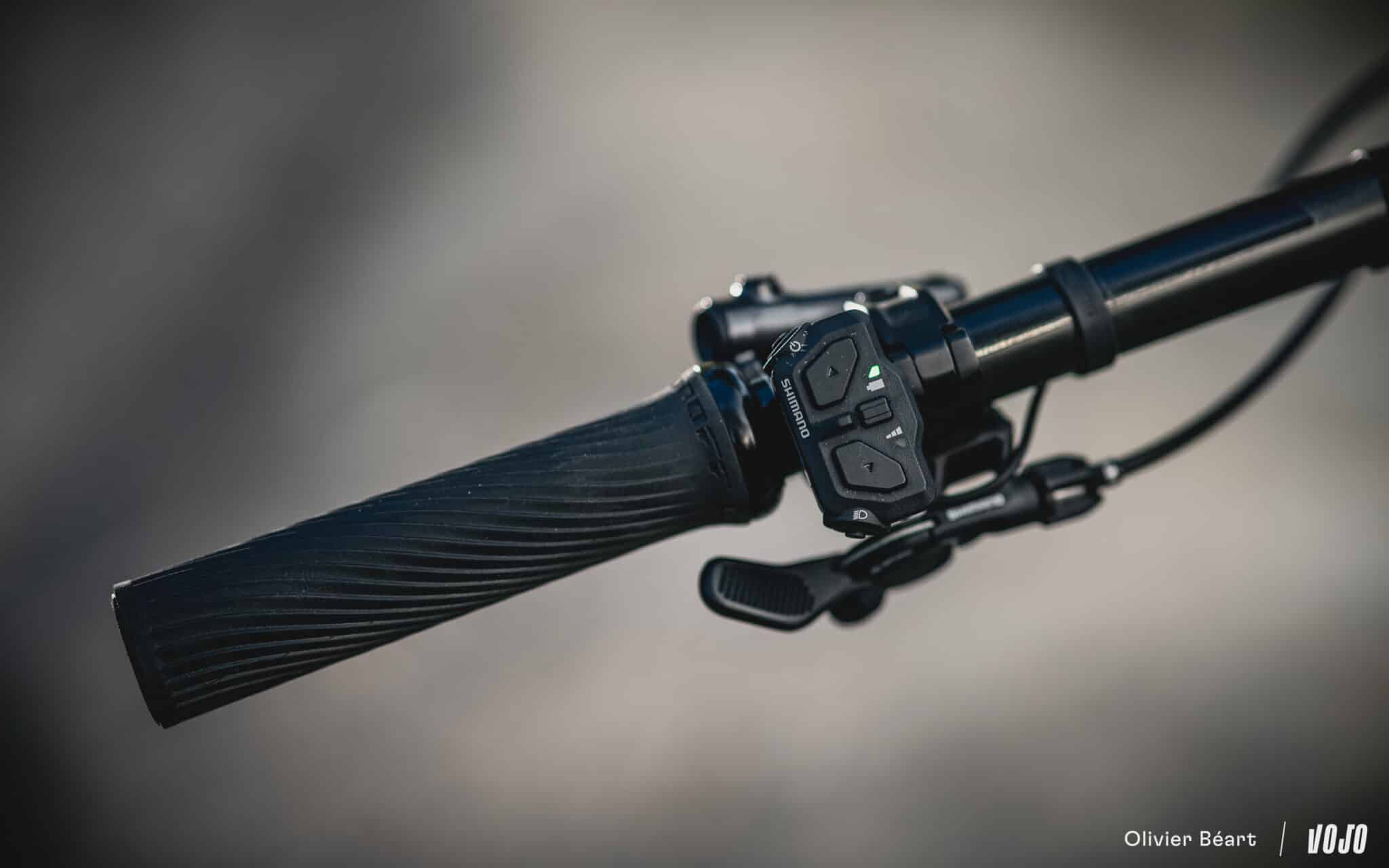 On note aussi la présence de la nouvelle transmission Shimano XT Di2. Sortie très discrètement, elle signe pourtant le retour de la transmission électronique chez Shimano, dans une version spécifiquement conçue pour fonctionner de concert avec le moteur Shimano EP801. L’ergonomie de la nouvelle commande est très agréable et le fonctionnement particulièrement doux, et on dispose également de nouvelles fonctionnalités comme le Freeshift qui permet de changer les rapports sans pédaler en laissant le soin au moteur de faire tourner la chaîne juste ce qu’il faut pour changer les rapports. Pratique en descente, histoire d’être préparé au moindre coup de cul sans devoir changer ses points d’appui. Nous avons fait une vidéo complète sur le sujet, disponible ici : Test vidéo | Shimano Di2 : le retour !