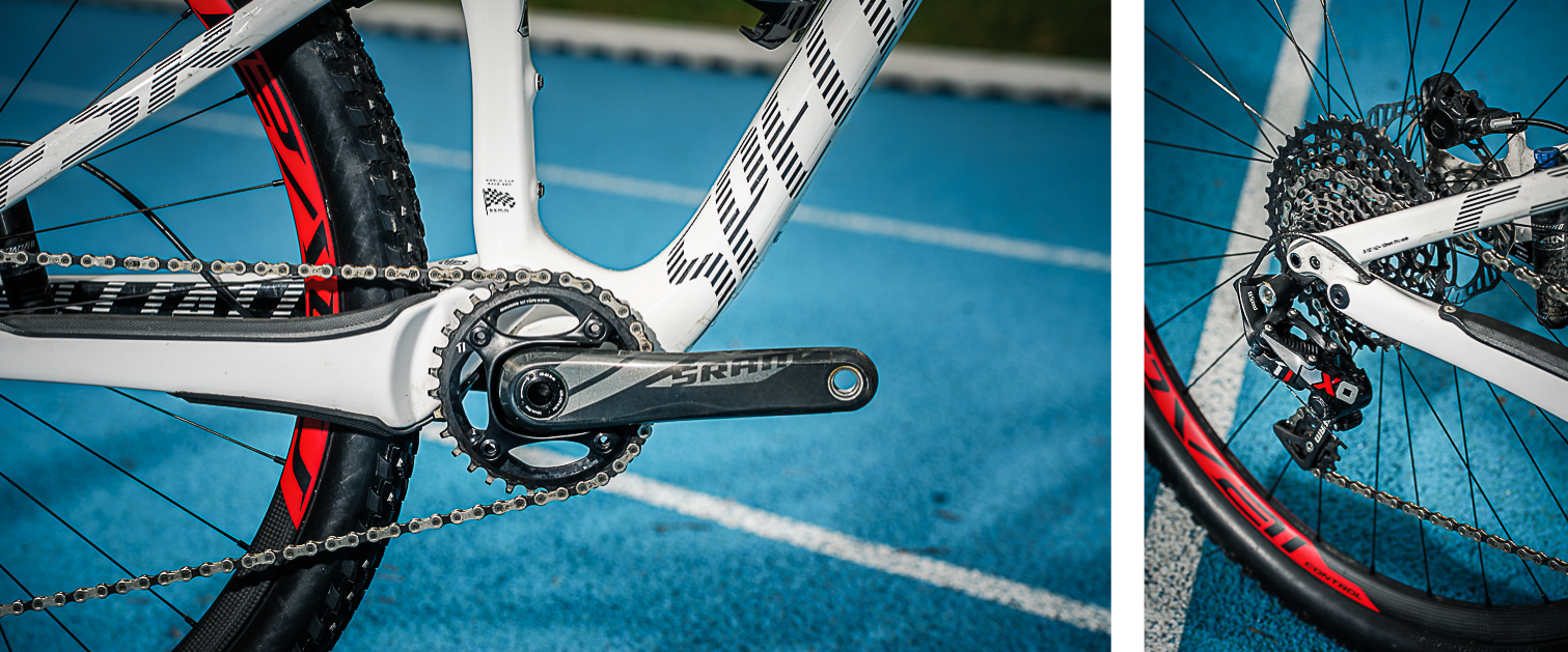 Pour le reste, l’équipement de l’Expert World Cup est assez fourni et « ready to race ». Au niveau de la transmission, vu que Shimano ne dispose encore que du très cher XTR en 1×11, c’est évidemment vers Sram que Specialized s’est tourné pour équiper ce modèle dédié au mono-plateau. On retrouve un « vrai » groupe complet XO1, y compris la cassette qui n’a pas été piochée un cran en-dessous, et les manivelles en carbone (avec plateau de 32 dents), ce qui est très important pour le poids.
