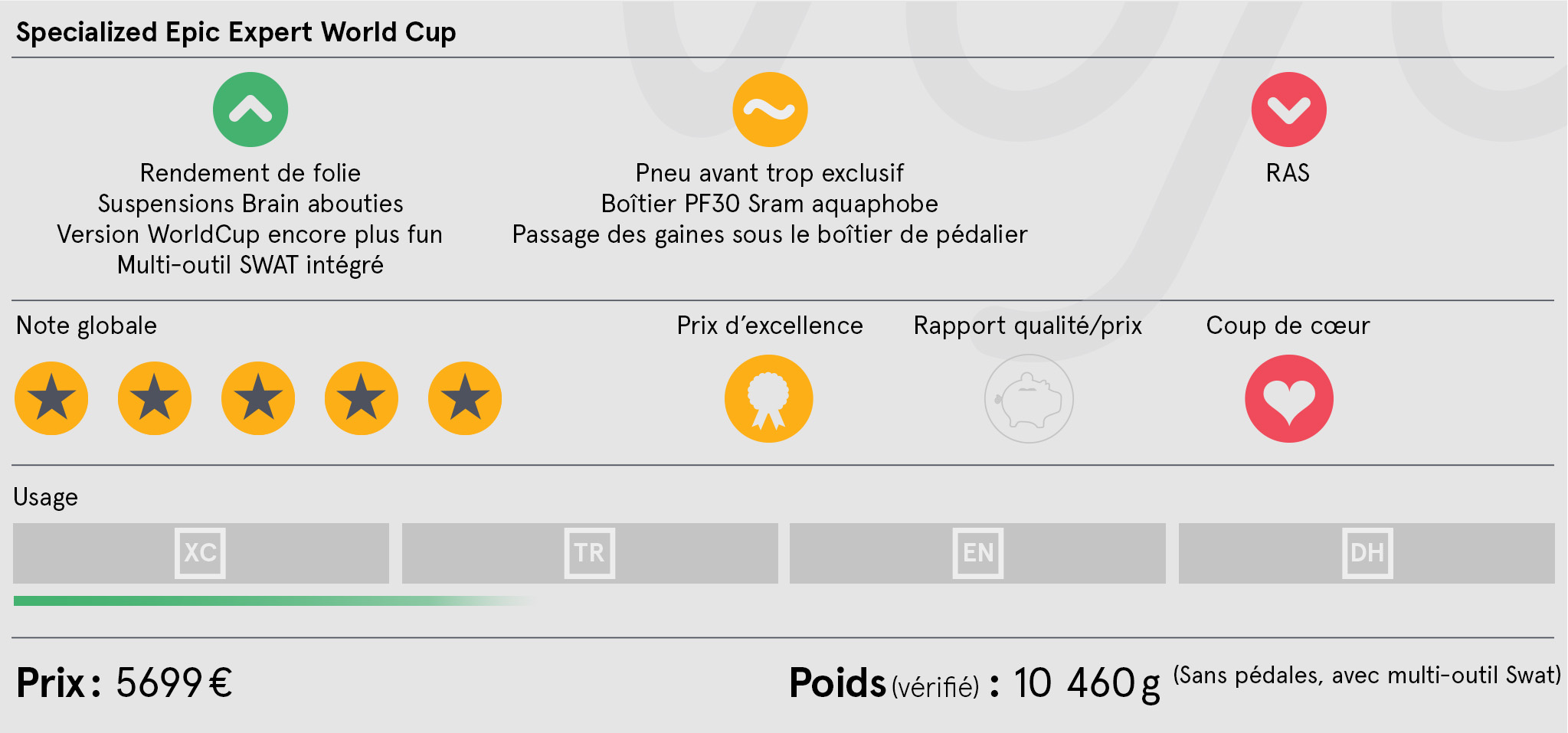 S’il y a bien un full qui incarne la compétition de XC, c’est lui : le Specialized Epic. Seul double suspendu vainqueur des Jeux Olympiques, champion du Monde, vainqueur au plus haut niveau tant en XC qu’en marathon, il se paie à présent le luxe d’être décliné dans une version encore plus extrême baptisée World Cup et destinée uniquement à un usage mono-plateau. Une bête de course, au sens le plus pur du terme, qui a bravé l’eau, la terre et le feu en notre compagnie pendant plus de 6 semaines. Verdict !