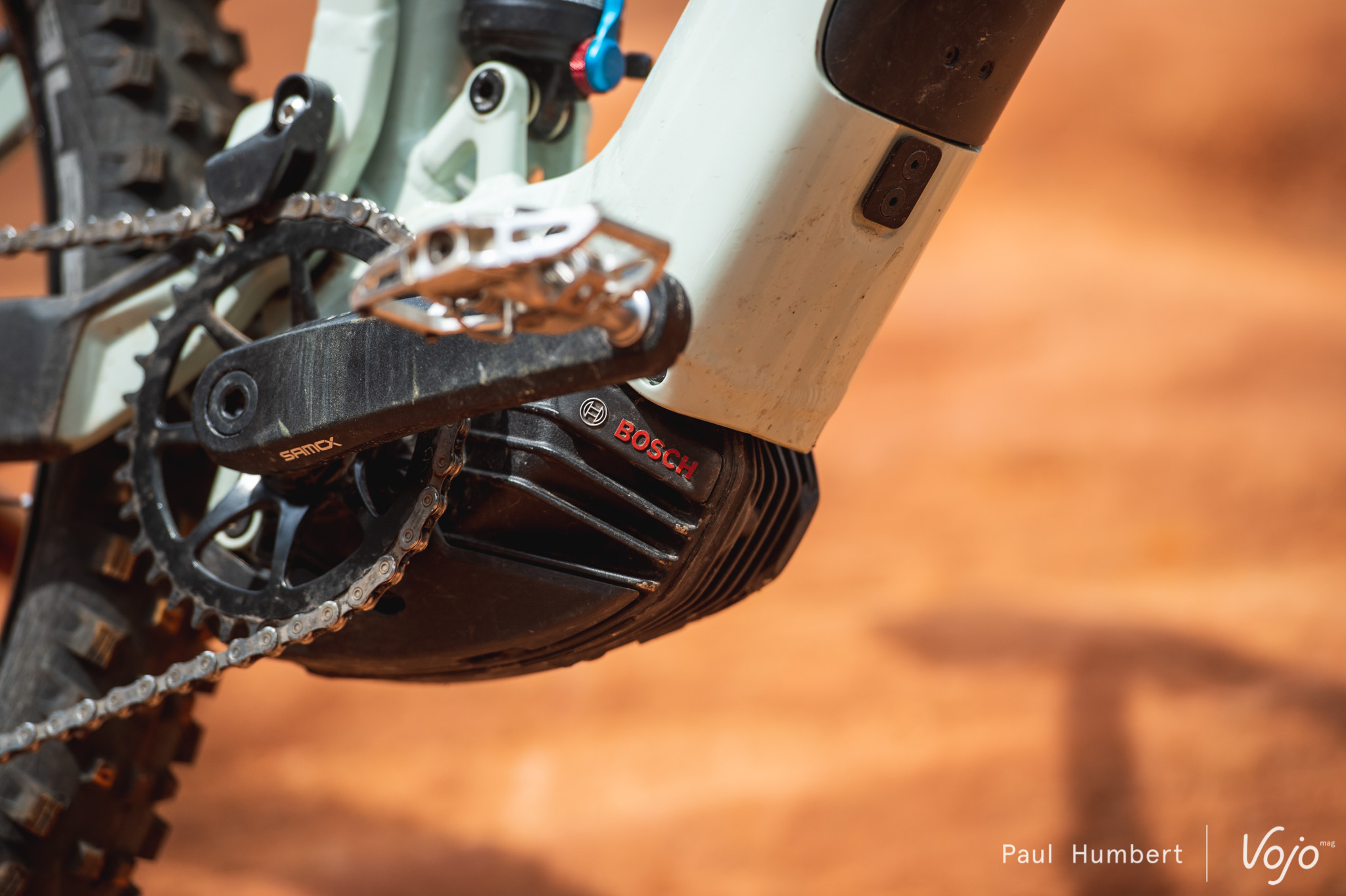 On note avec surprise l’absence de tout carter de protection autour du moteur, qui est donc laissé « nu » et exposé aux chocs et projections de pierres comme sur le Sam². On ne doute pas de la solidité du bloc moteur Bosch, mais ce choix est tout de même très rare en VTT. Visuellement, cela allège la ligne du vélo et cela met en valeur la belle intégration du moteur, par contre cela peut également être interprété comme un signe que le vélo n’est pas prévu pour du « vrai » VTT…