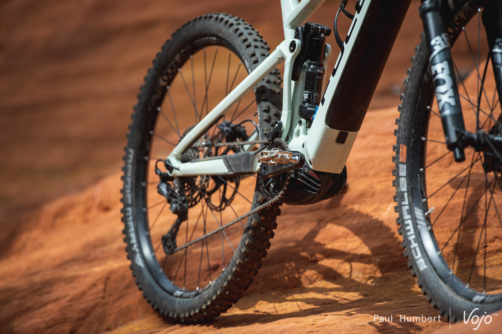 Schwalbe complète le train roulant, avec deux Magic Mary en 29×2.6, carcasse SuperTrail à l’avant et SuperGravity à l’arrière. De vrais pneus solides, au dessin en phase avec les capacités d’un VTTAE et à la carcasse suffisamment rigide pour supporter le poids du vélo (la carcasse SG est la carcasse enduro de Schwalbe, la SuperTrail est un peu plus légère et polyvalente), c’est un choix encore trop peu courant et qui mérite ici d’être salué.