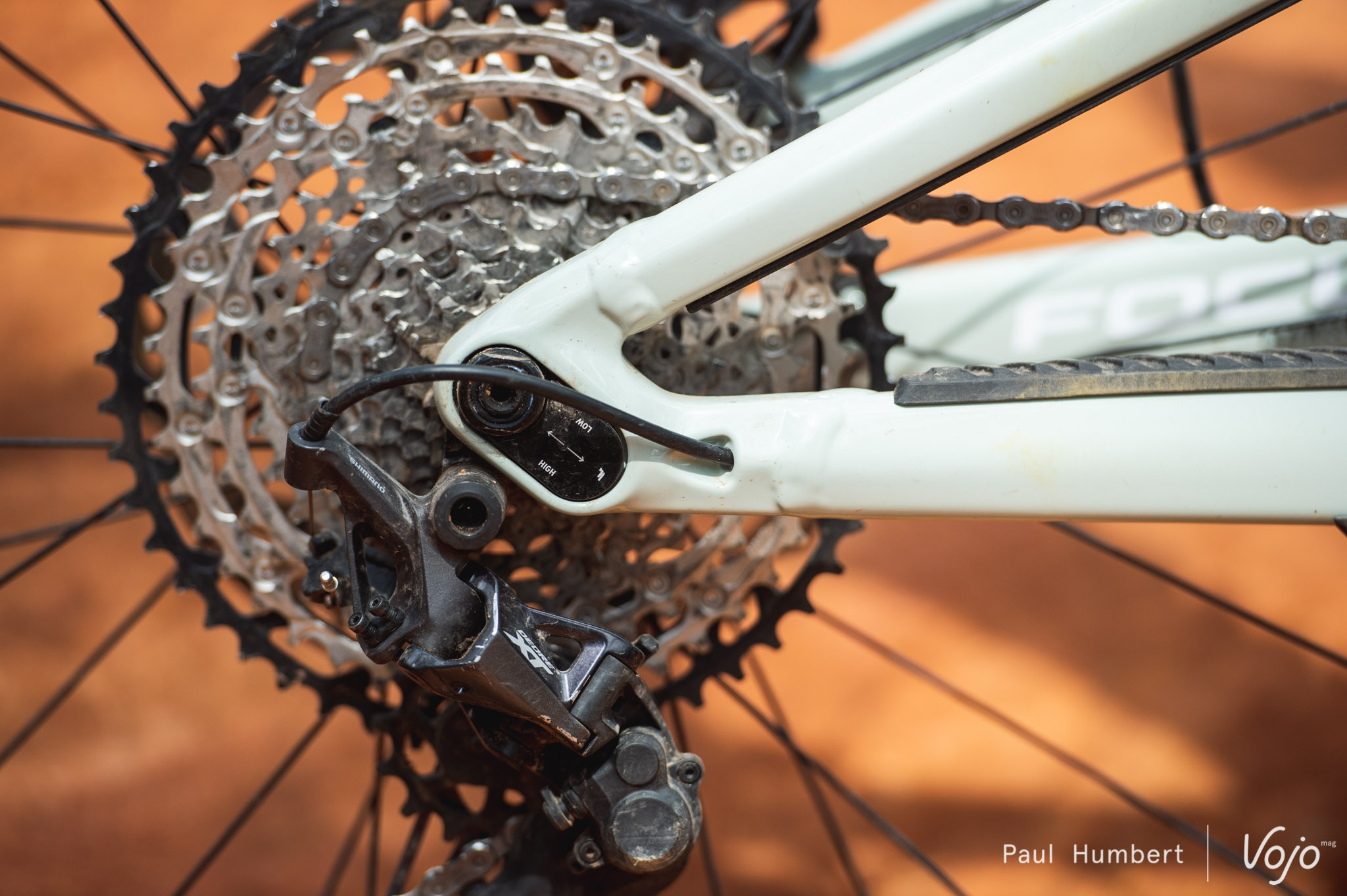 Côté transmission, Focus a opté pour du Shimano avec un mélange de Deore XT (dérailleur, shifter) et de SLX (cassette 10-51, chaîne). Rien à redire de ce côté, les deux sont réputés pour leur efficacité et leur fiabilité. On retrouve également du Deore XT au niveau des freins, avec la version 4 pistons associée à des disques de 203 mm.