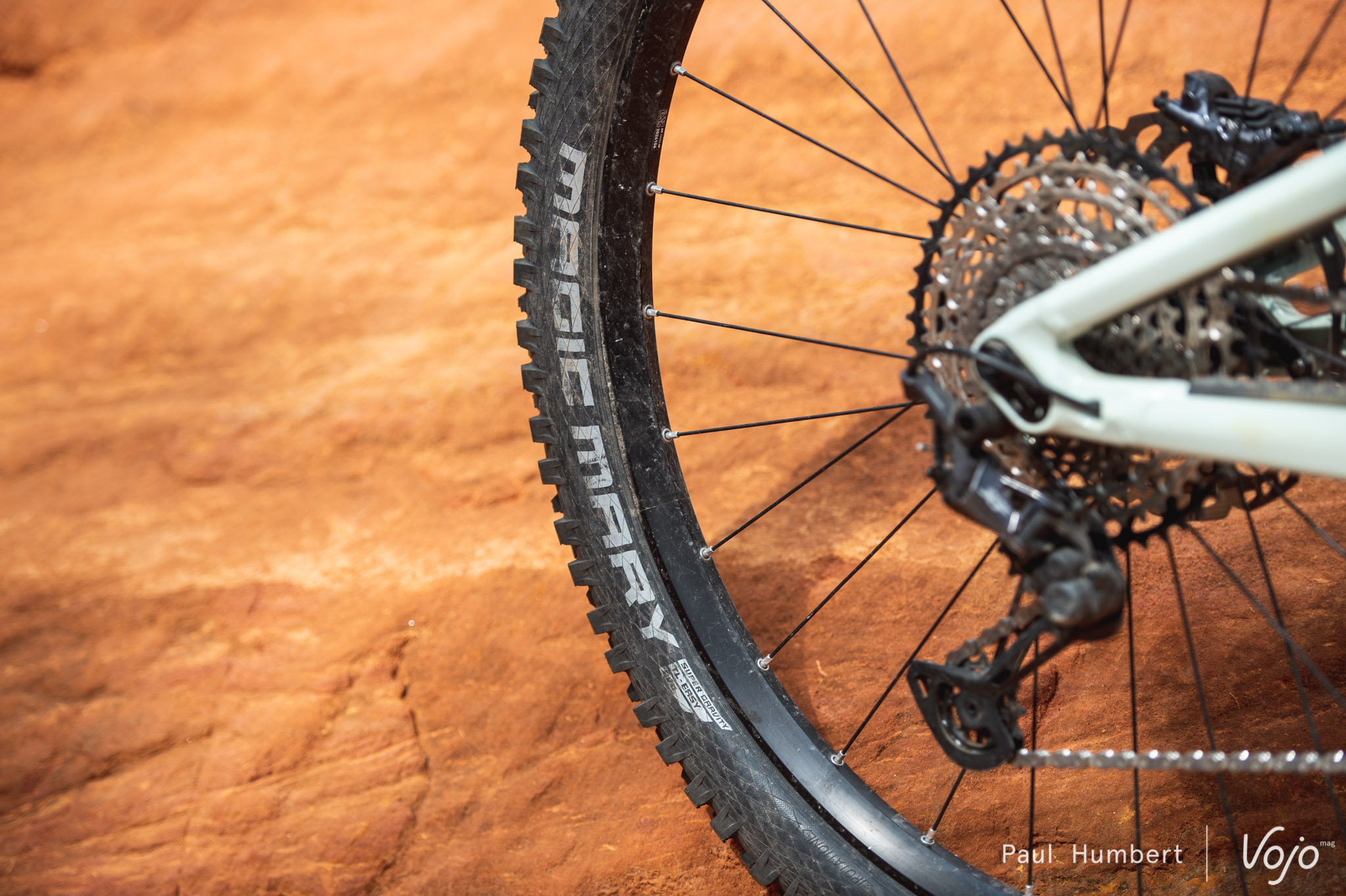 Schwalbe complète le train roulant, avec deux Magic Mary en 29×2.6, carcasse SuperTrail à l’avant et SuperGravity à l’arrière. De vrais pneus solides, au dessin en phase avec les capacités d’un VTTAE et à la carcasse suffisamment rigide pour supporter le poids du vélo (la carcasse SG est la carcasse enduro de Schwalbe, la SuperTrail est un peu plus légère et polyvalente), c’est un choix encore trop peu courant et qui mérite ici d’être salué.