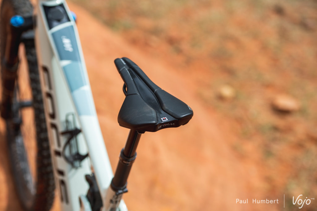 Enfin, pas de fournisseur unique ou de composants « maison » à foison pour les périphériques, qui viennent d’horizon très différents : tige de selle KS Rage, selle Proxim W350 (assez inconfortable pour une partie des testeurs), cintre Race Face Chester au standard 35 mm et en 780 mm de large, poignées BBB Cobra et tout de même une potence Focus.