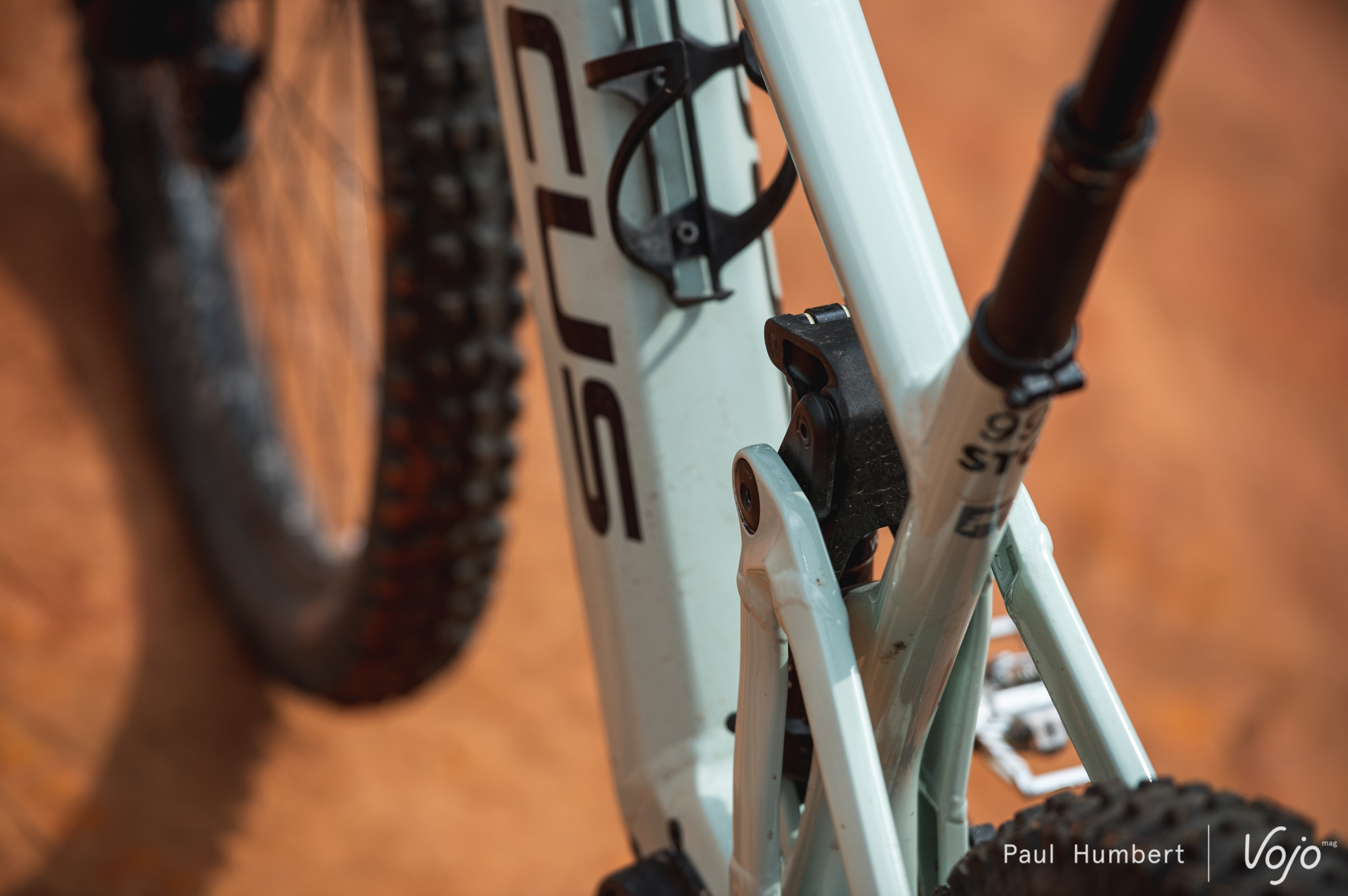 La suspension arrière se distingue vite par sa sensibilité. C’est d’ailleurs assez impressionnant à observer car le basculeur est bien visible par le pilote et on le voit s’activer au moindre petit caillou. Cela devrait, en théorie, entraîner un certain pompage, mais les mouvements du tube de selle semblent être maîtrisés et on ne rebondit pas sur la selle en permanence.