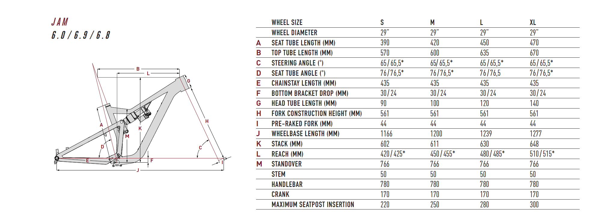 La géométrie évolue de manière significative par rapport à l’ancien Jam. Elle perd de son caractère « trail » et se tourne bien plus vers l’all-mountain, voire l’enduro léger (si on compare aux cotes des enduros modernes).