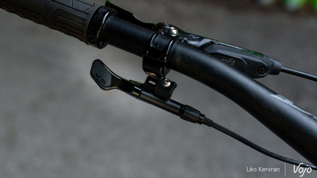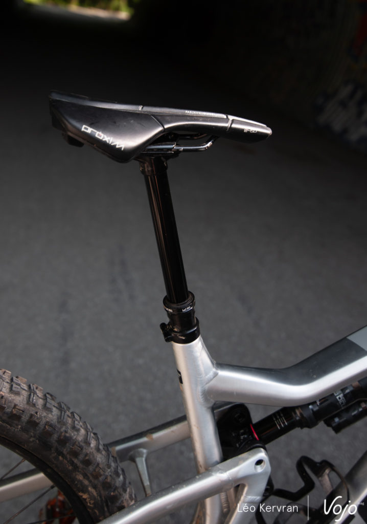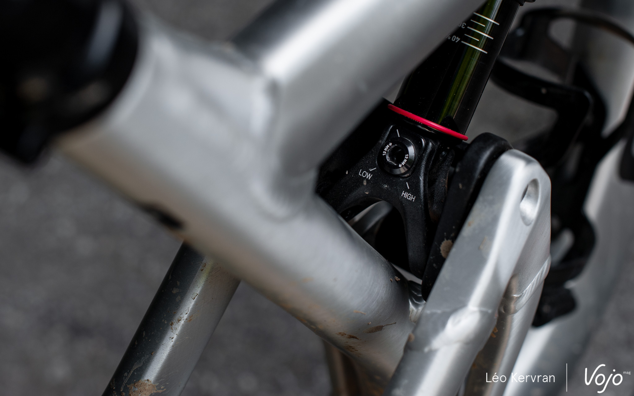 Signalons au passage que nous avons roulé le vélo presque uniquement en position Low. Passer en High permet d’améliorer un peu la position en montée, c’est vrai, mais nous avons trouvé que pour notre pratique, le gain n’était pas suffisant face à la perte en descente que cela implique. Cela pourrait aussi apporter un peu de dynamisme mais comme le vélo est lourd, ce ne serait pas très cohérent.