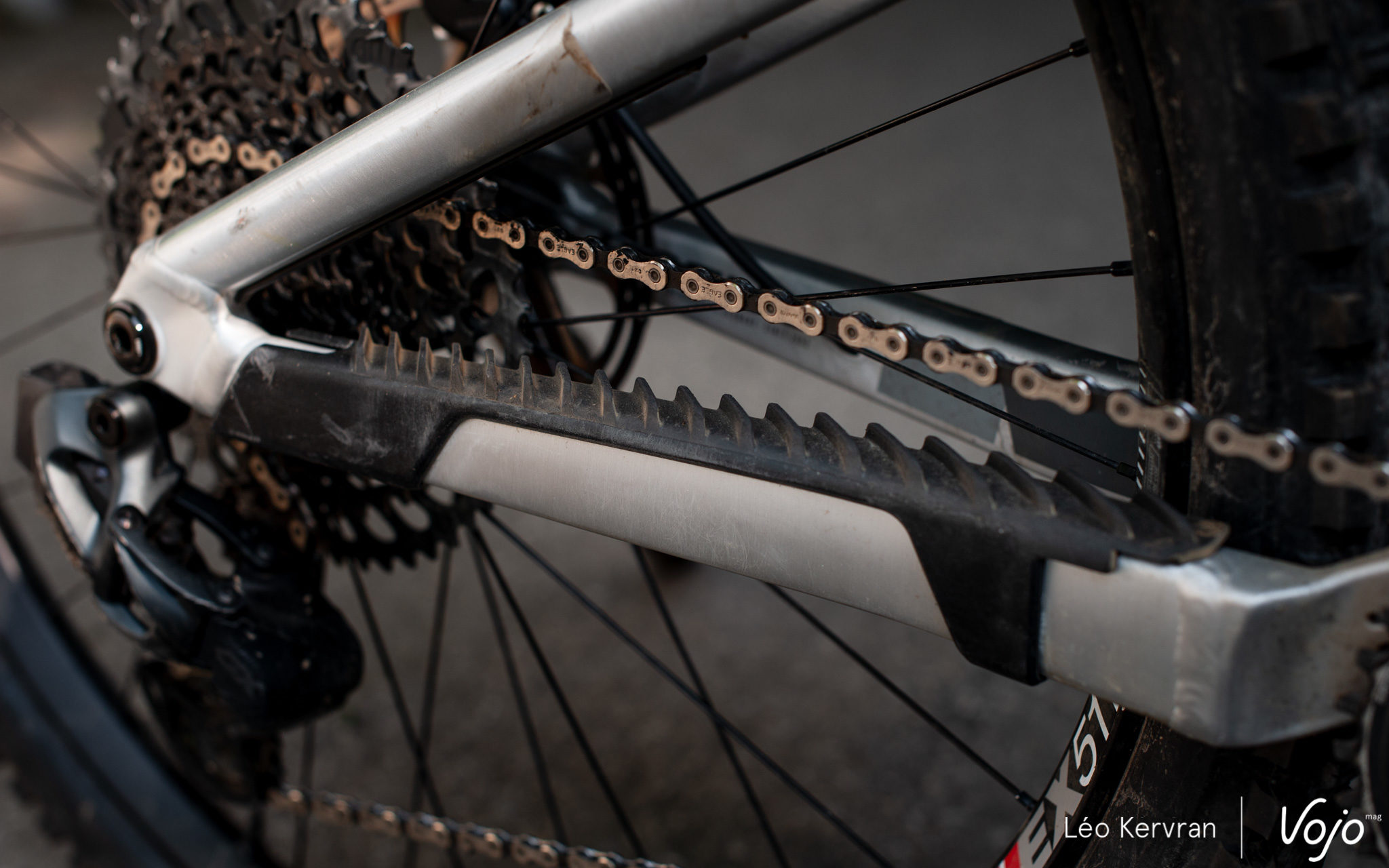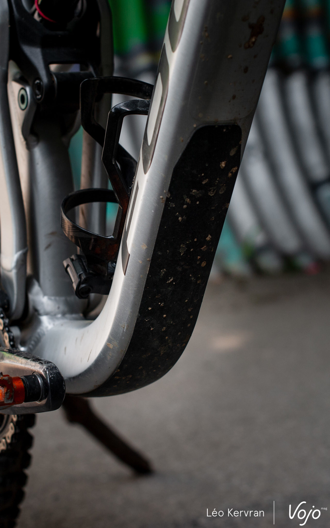 Les deux vélos étant très proches, on retrouve sans surprise les mêmes pièces et détails de finition sur le Jam que sur le Thron. Cela commence par les protections du tube diagonal et de la base côté transmission, complètes et qui inspirent confiance. Ceci dit, on vous conseille toujours de sécuriser cette de la base avec un ou deux colliers de serrage, pour éviter qu’elle ne parte à l’aventure de son côté en cours de sortie.