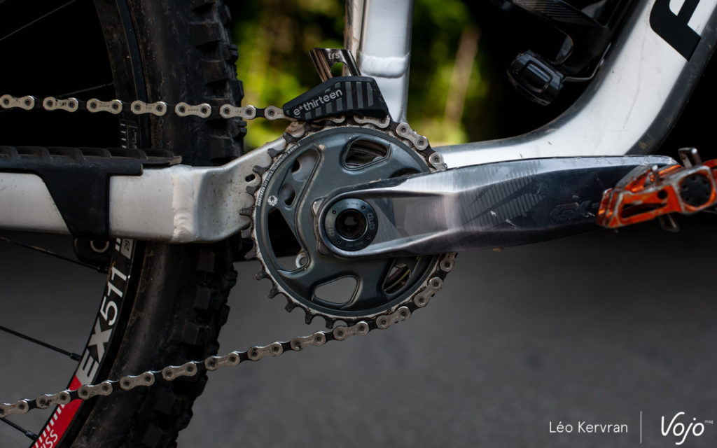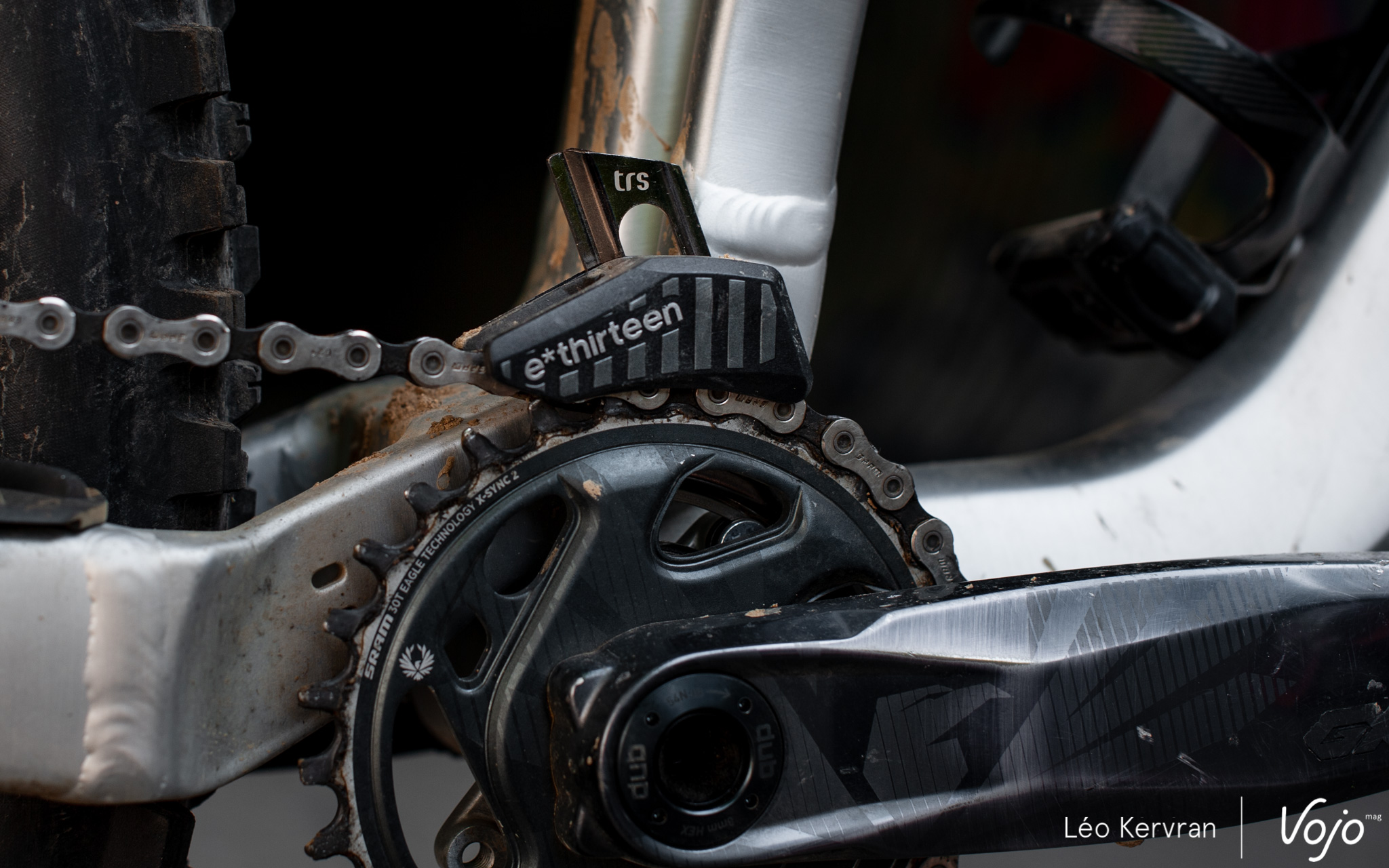 Enfin, le cadre dispose d’un support ISCG 05 pour un guide-chaîne et/ou un bashguard. Sur le Thron, il n’est pas utilisé mais sur ce Jam 6.0 LTD, Focus a monté un guide-chaîne E*Thirteen de façon à bien marquer la différence de caractère et de pratique visée entre les deux vélos.
