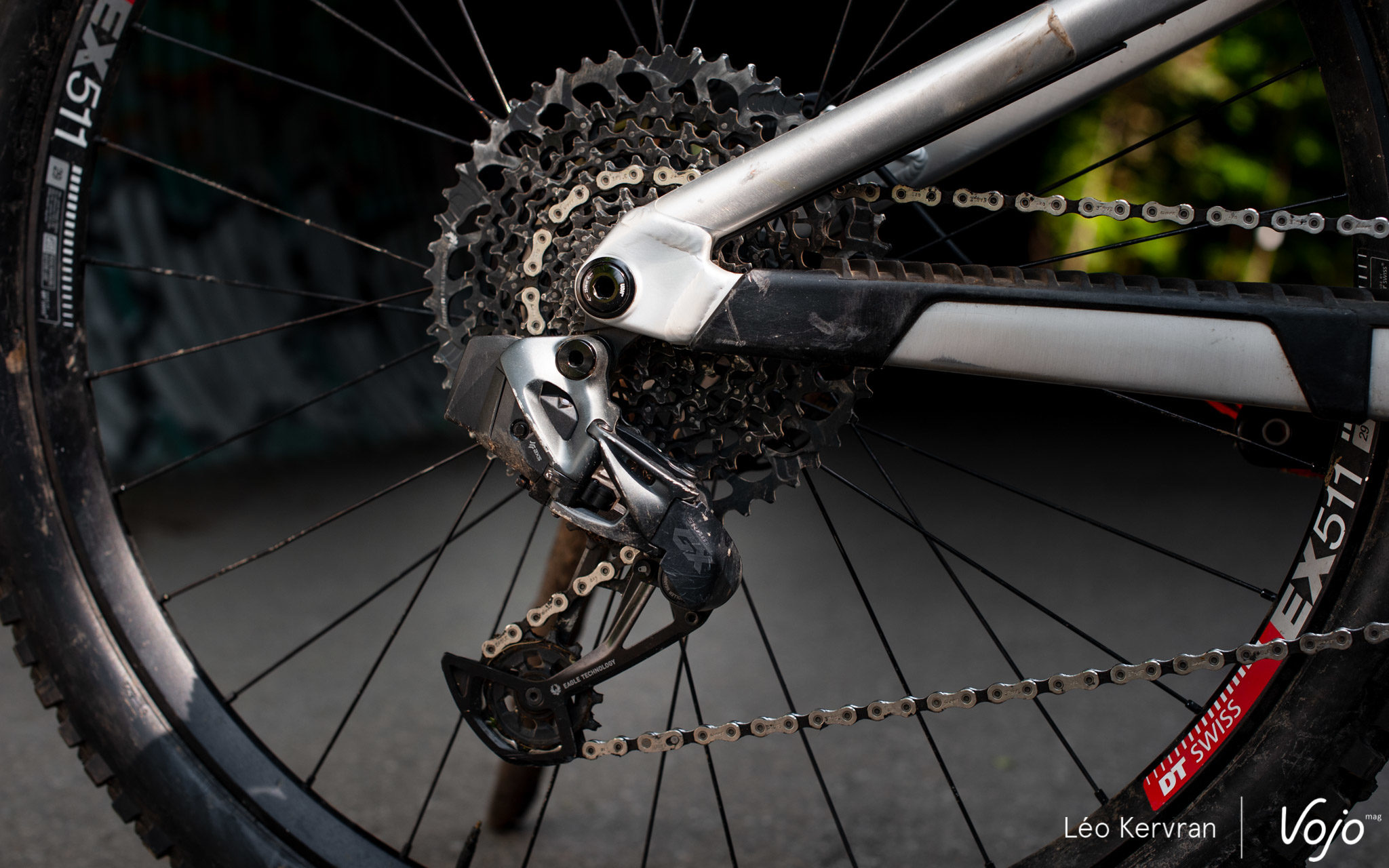 Côté train roulant, c’est un montage à base de jantes DT Swiss EX511 et de moyeux H370. De très bons composants sur le papier mais sur notre vélo de test, la qualité de l’assemblement laissait un peu à désirer et elles se sont rapidement voilées, sans que ça n’aille aussi loin qu’avec les Rodi du Thron.