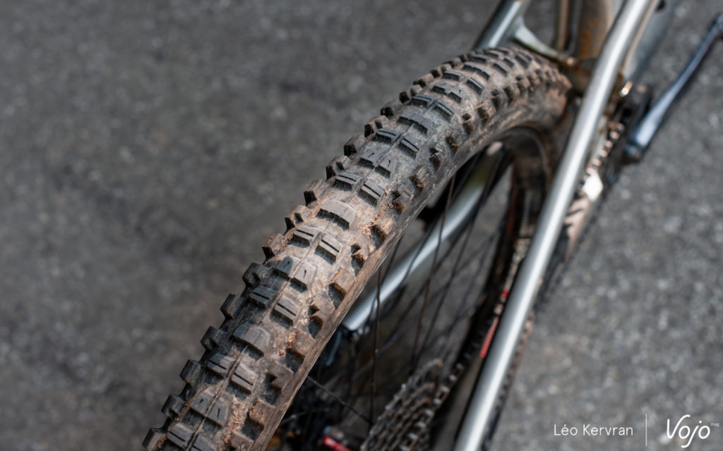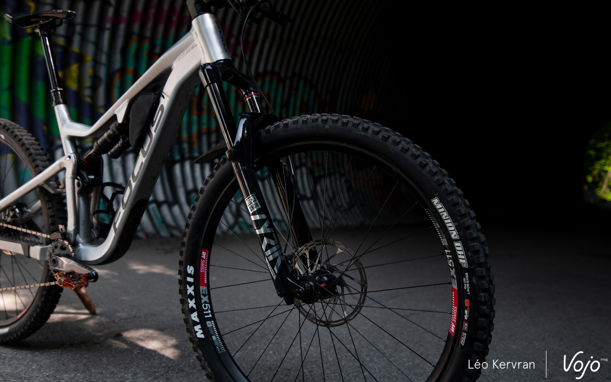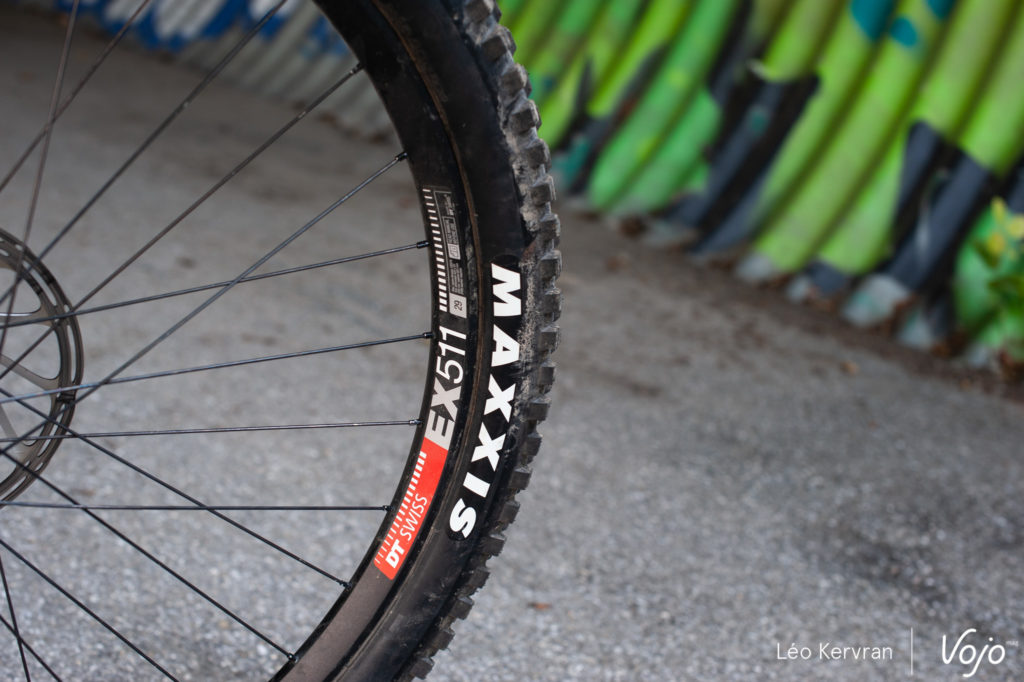 Les pneus sont les biens connus Maxxis DHF 2.5 Exo (avant) et DHR II 2.4 WT Exo+ (arrière), en gomme MaxxGrip pour le premier et MaxxTerra, un peu moins adhérente mais plus résistante à l’usure, sur le second.