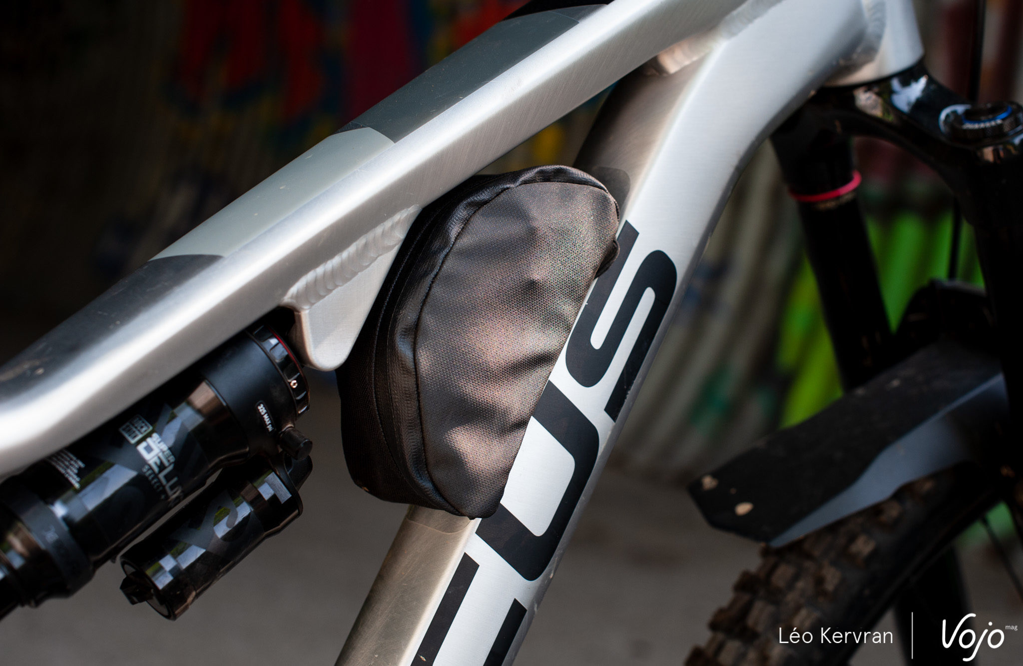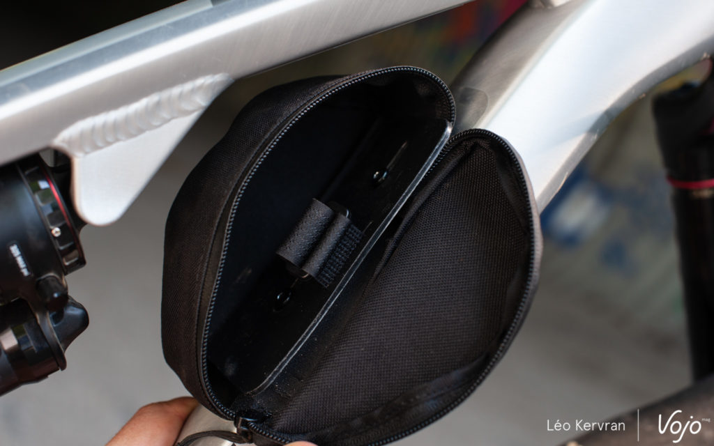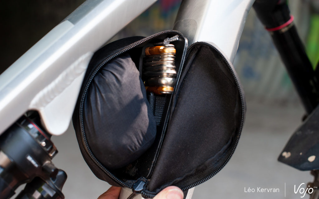 Autre fonctionnalité caractéristique des Thron et Jam version 2021, la petite sacoche montée d’origine sur le support d’accessoires. Sa taille est tout juste suffisante pour accueillir une chambre à air en tassant bien mais on peut également choisir d’y mettre quelques mèches et un multi-outils, sa paire de gants en montée lorsqu’il fait chaud, un coupe-vent très compact, son goûter… A défaut d’être joli, c’est bien pratique, et si ce n’est pas à votre goût vous pouvez toujours la retirer ou utiliser uniquement la plaque en plastique et le scratch, sans la sacoche.