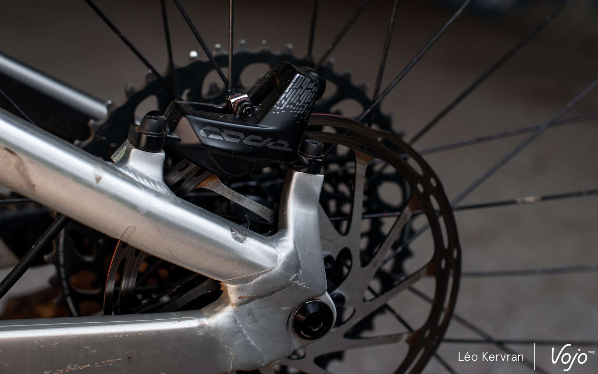 C’est encore du Sram au niveau des freins, avec des Code R en disques de 200 mm à l’avant et 180 à l’arrière. Bon, comme toujours, cela ne plaira pas à tout le monde, mais les performances peuvent être au rendez-vous, sous condition d’un entretien régulier.