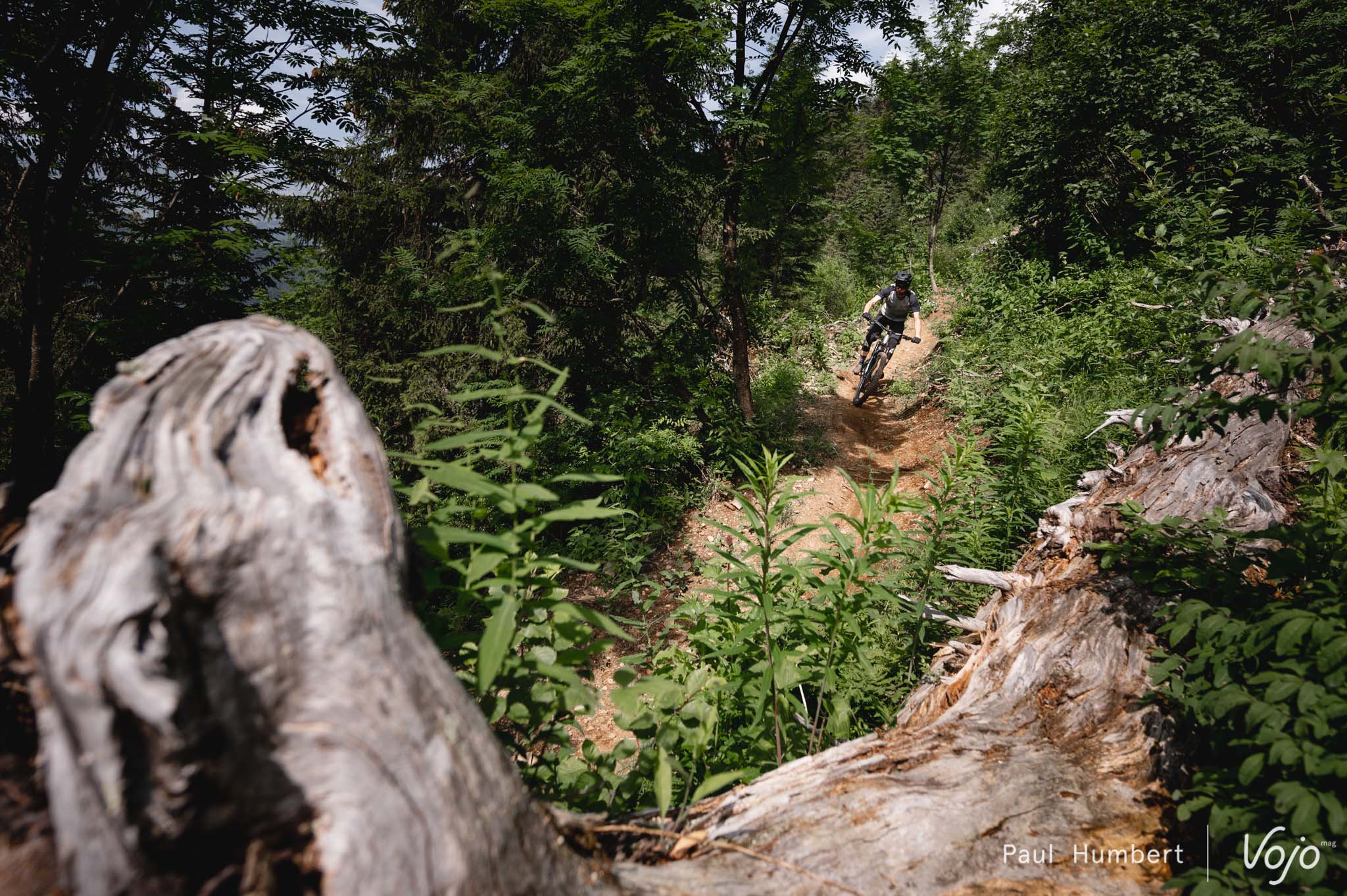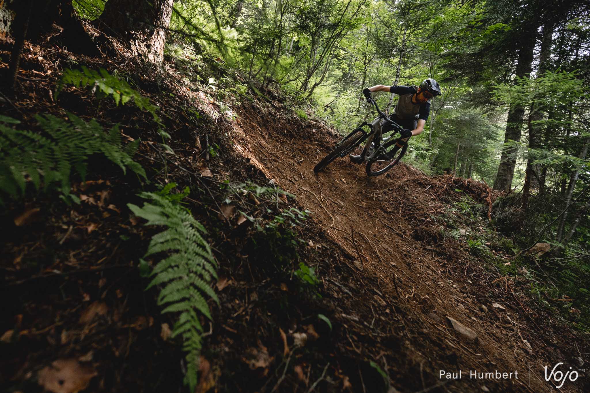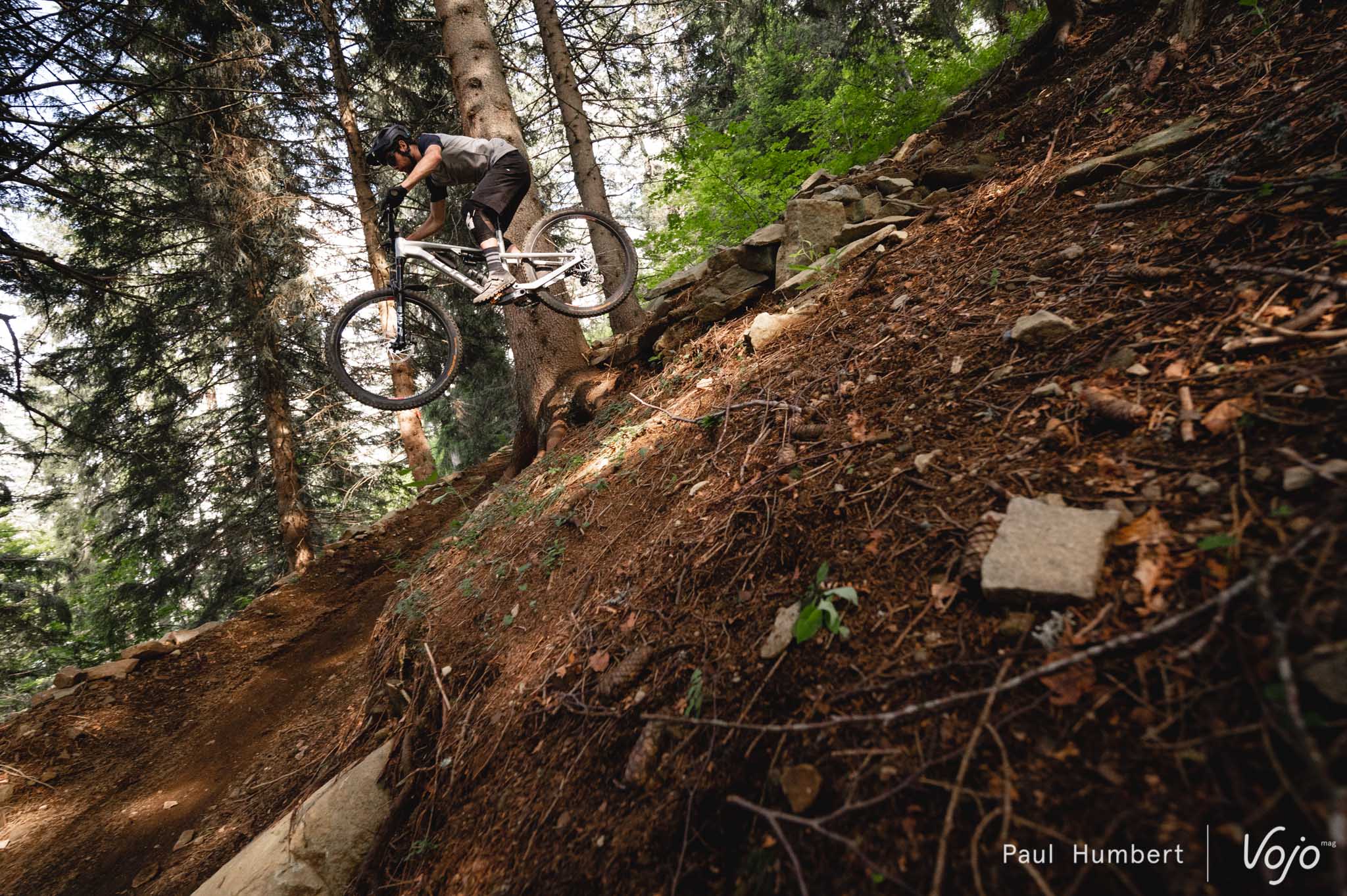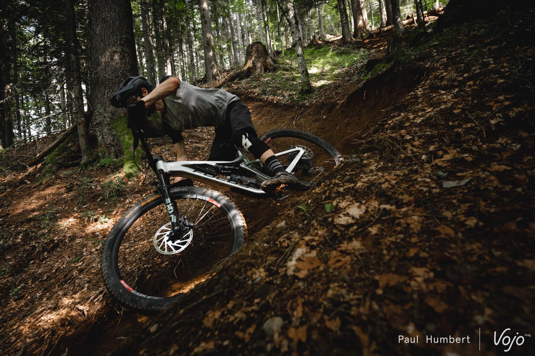Toutefois, le vélo reste tolérant en toutes circonstances. Ses réactions sont prévisibles et lorsque les choses s’emballent, on a toujours le temps de calmer le jeu avant de se faire éjecter. Même chose lorsqu’on se lance sur des sauts, il faut faire preuve d’un minimum de précision sur les appels compte tenu des bases courtes, mais en réception, le vélo tolère étonnamment bien les atterrissages un peu hasardeux (comme celui qui a suivi cette photo, un poil court).