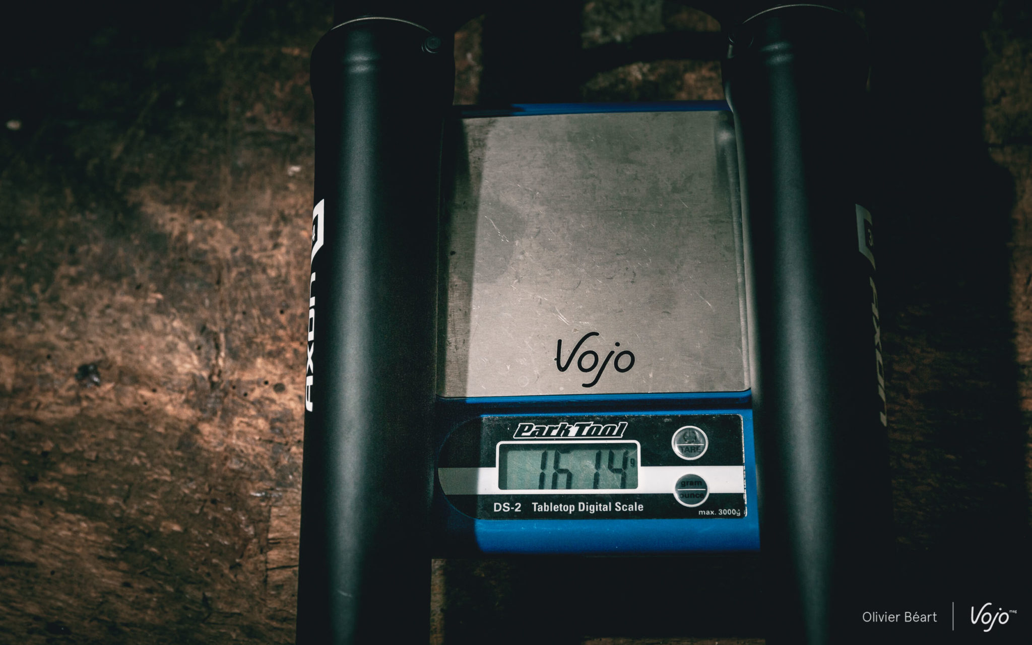 Au final, le résultat sur la balance est de 1615g pour la SR Suntour Axon 34 Werx avec pivot coupé à 160mm, soit quasi exactement le même poids que sa concurrente directe, la Fox F34 Step Cast, même s’il faut ajouter 35g ici pour l’expandeur indispensable vu la présence du pivot carbone. Il est intéressant aussi de constater que c’est quasiment le même poids que la Sr Suntour Axon Werx avec plongeurs de 32mm que nous avions testée (et beaucoup appréciée) il y a quelques années. Cette dernière était dotée d’un châssis en carbone, mais d’un ensemble té/pivot en aluminium. A noter aussi qu’il n’existe pas vraiment d’équivalent chez RockShox actuellement, même si la SID joue dans la cour des fourches à plongeurs de 32mm plutôt rigides et pas super légères. Formula, avec sa fourche 33, joue aussi les intermédiaires, même si elle est peu courante en XC.