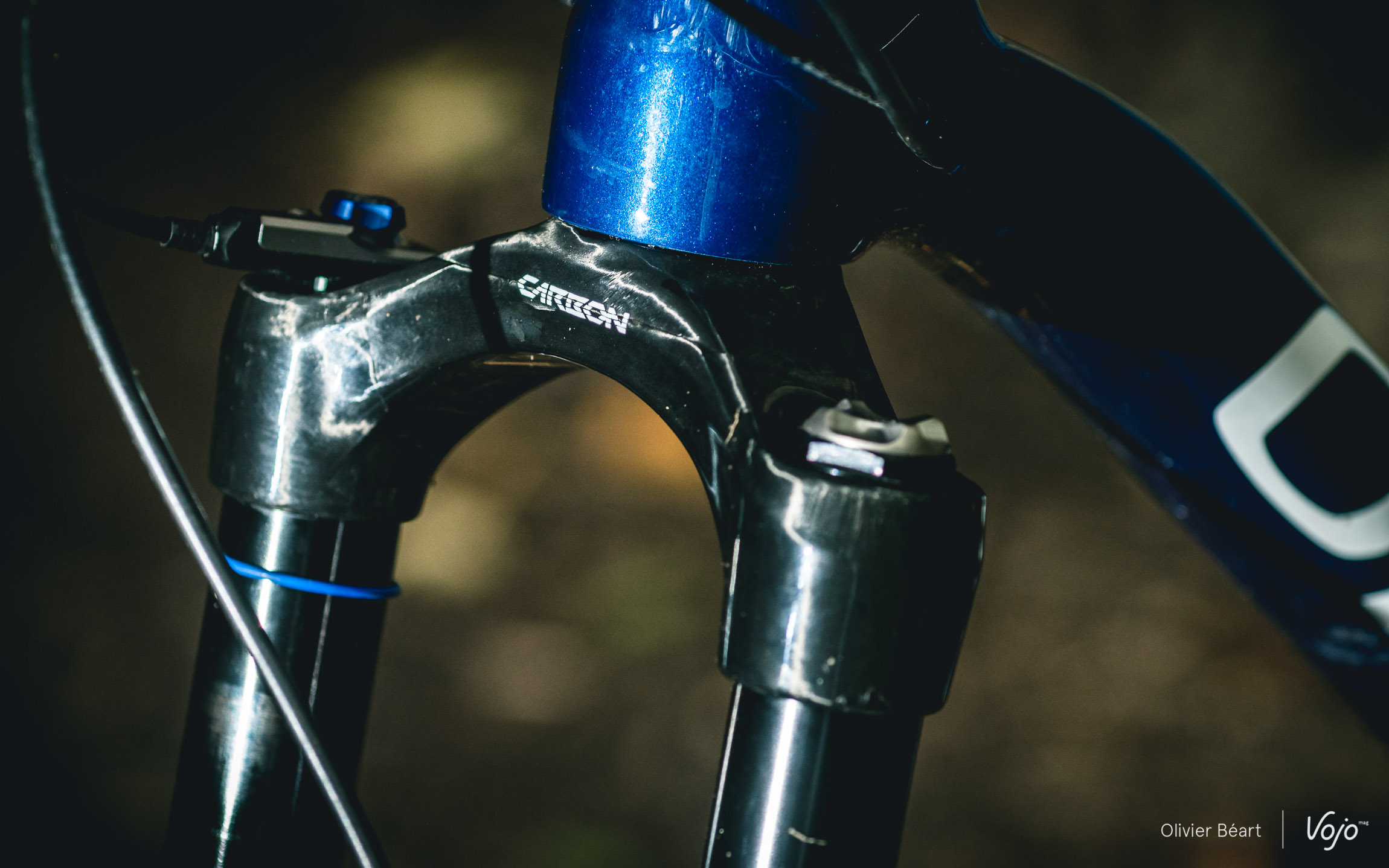 Chez Fox, l’ensemble fourreaux est optimisé pour gagner pas loin de 200g par rapport à une F34 classique. Ici, chez Suntour, la démarche est la même pour le diamètre, mais c’est surtout l’ensemble té/pivot qui a été repensé et qui est ici en carbone (alors qu’il reste en alu chez Fox).