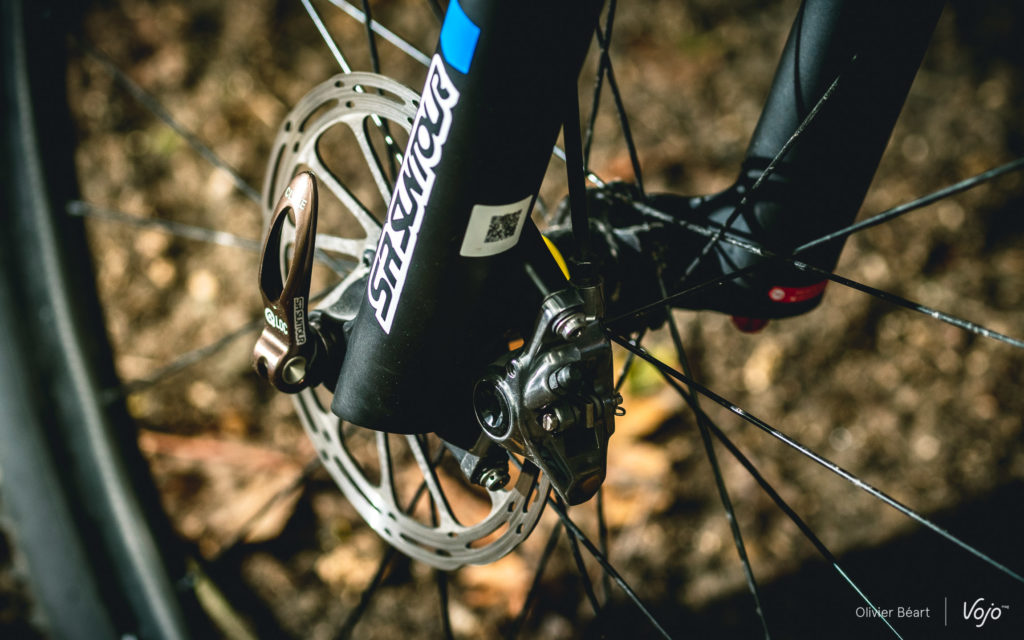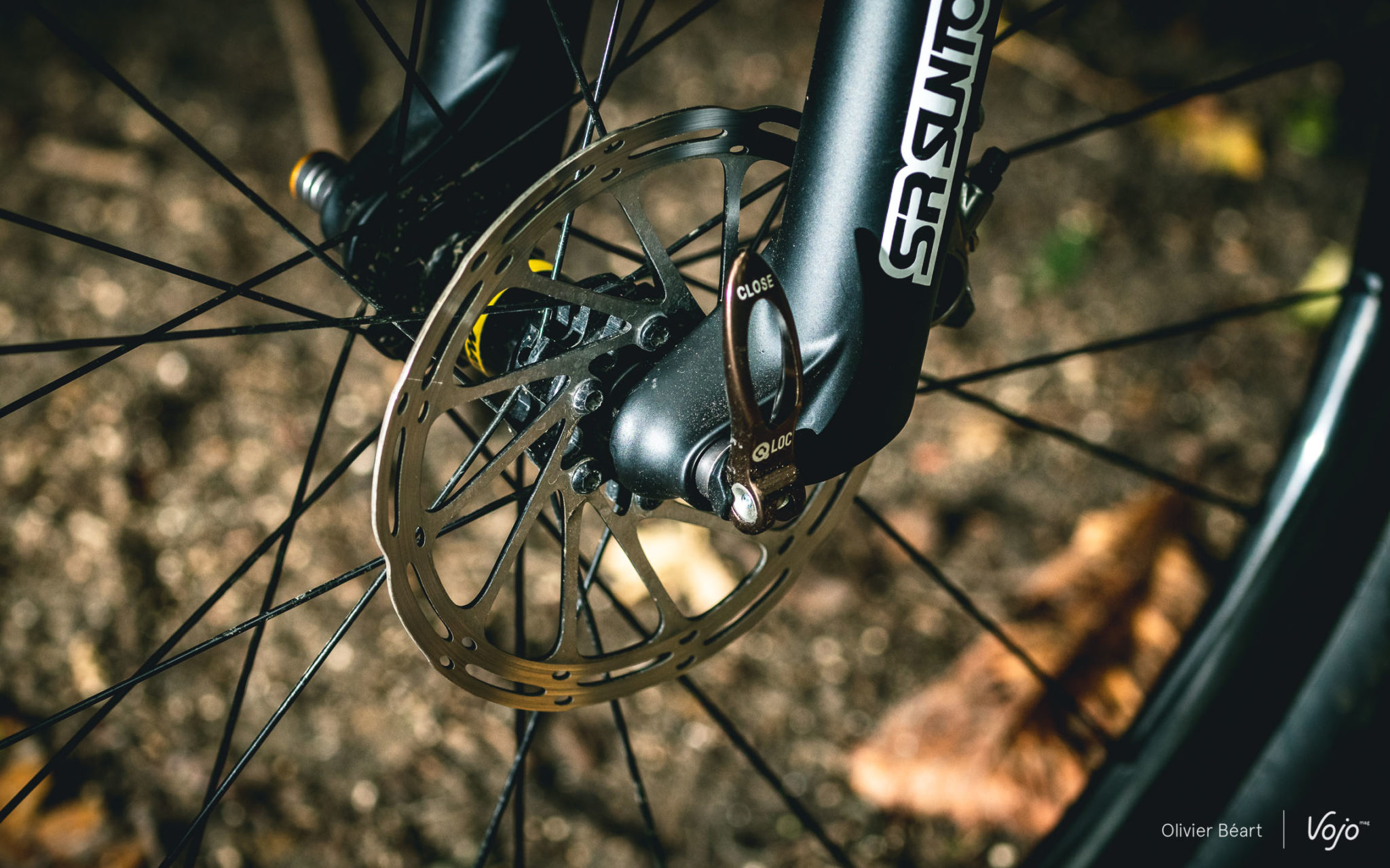 Autre originalité : le blocage de roue Q-Loc2 propre à la marque et qui se passe de pas de vis. A gauche, on retrouve bien un levier, mais une fois celui-ci ouvert, il ne faut rien dévisser. On a simplement libéré un expandeur situé du côté droit, qu’il suffit d’extraire d’une petite pression de la main. Il faut un petit temps d’adaptation pour bien comprendre comment ça marche, mais une fois qu’on a le truc, c’est ultra rapide.