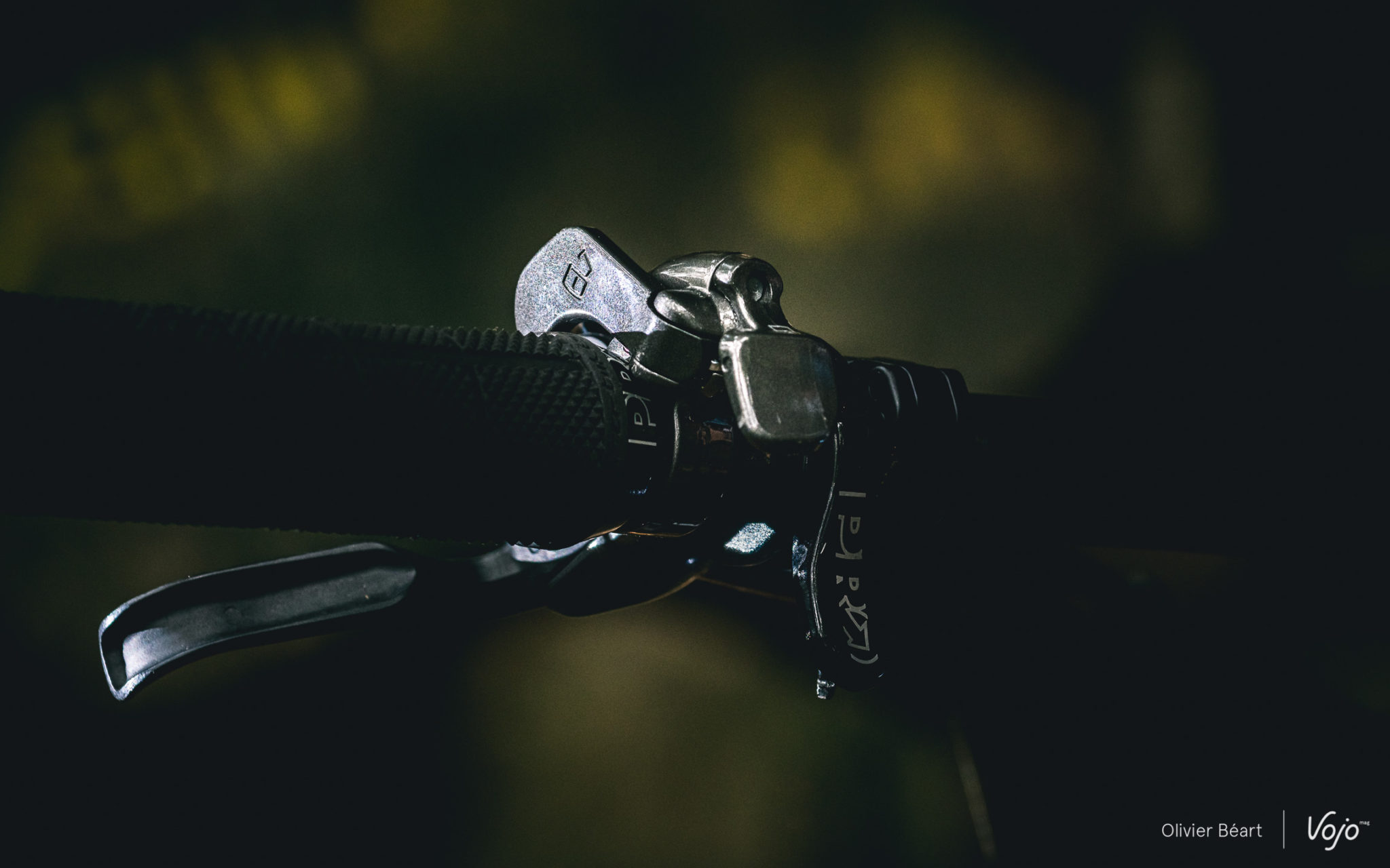 La SR Suntour 34 Werx dispose d’une commande de blocage au guidon, avec le même mécanisme que celui déjà utilisé sur le modèle à plongeurs de 32mm qui existe depuis plusieurs années. Tant le mécanisme situé sur la fourche (avec une came crantée et un petit engrenage en plastique) que la commande au guidon font un peu « cheap » sur une fourche de ce niveau de gamme, mais force est de reconnaître que cela fonctionne vraiment très bien et que le levier est très agréable à manipuler. On utilise le pouce pour fermer le circuit hydraulique et l’index pour le rouvrir. Bien vu. On regrettera juste qu’elle ne soit pas dotée d’une petite charnière qui permettrait de la mettre sur le cintre sans devoir retirer les grips.