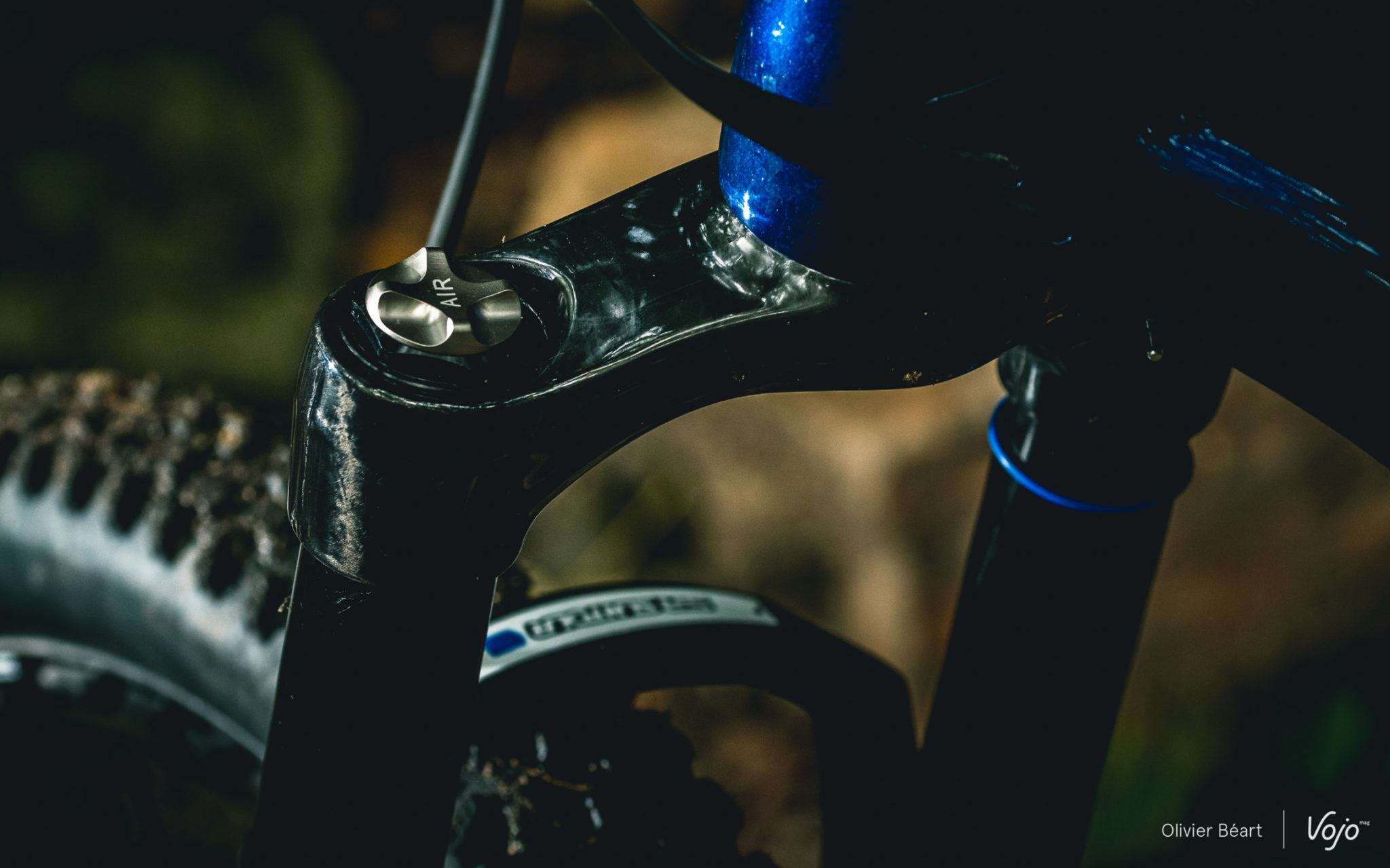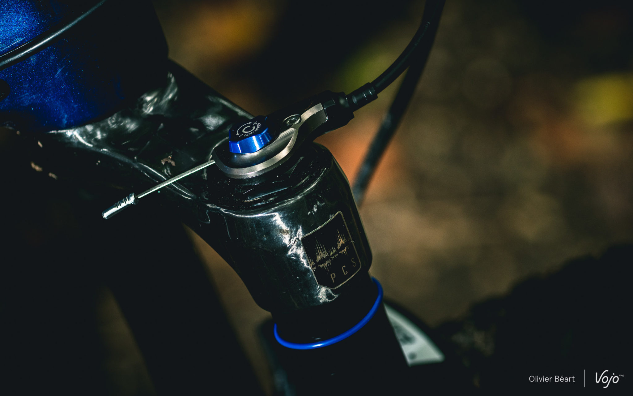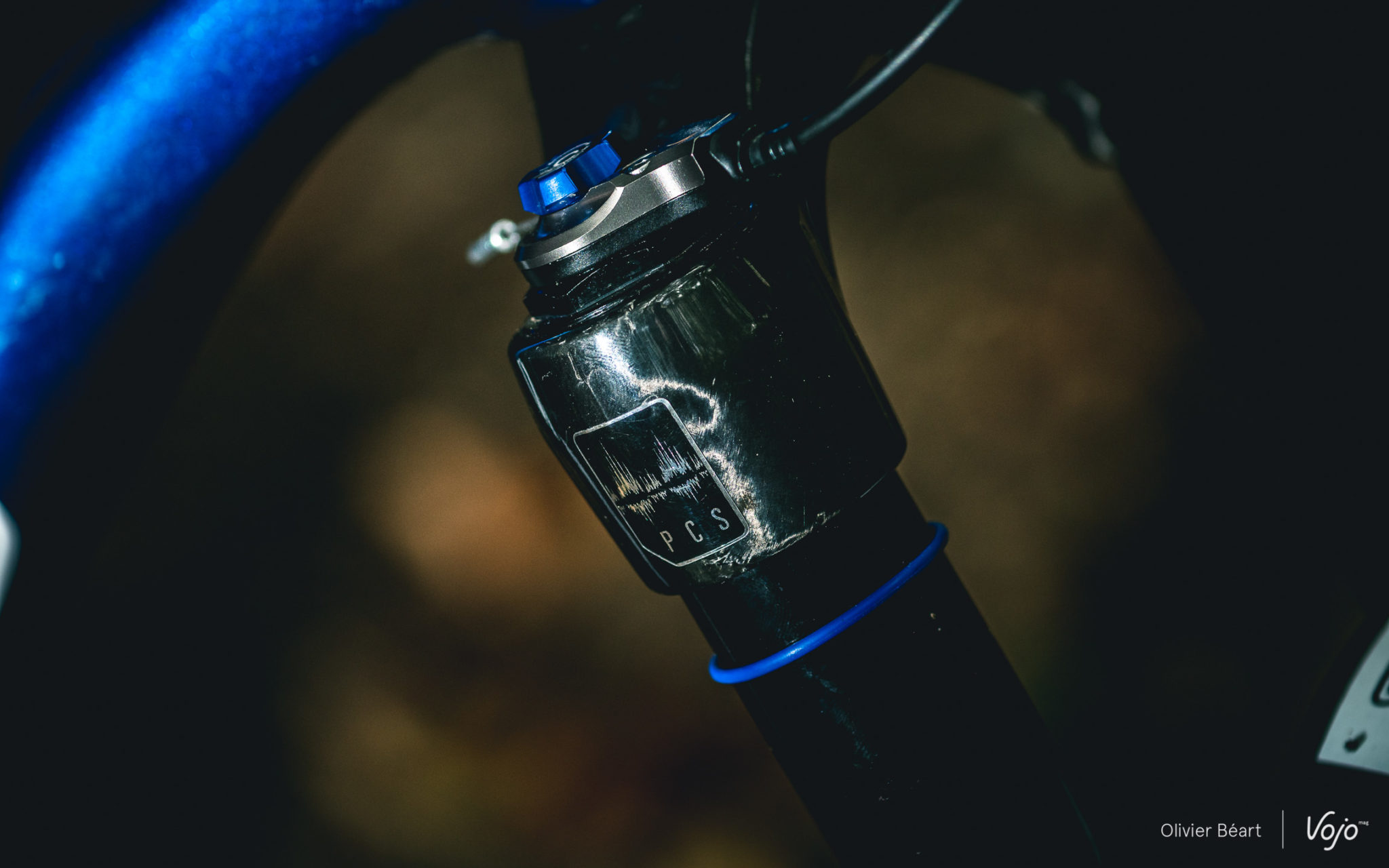 A l’intérieur, on retrouve une cartouche fermée du côté hydraulique, avec le système PCS propre à la marque. Elle offre un réglage du rebond tout à fait classique, mais aussi un réglage de la compression lente assez efficace et bien utile sur une fourche typée XC pour réduire les oscillations au pédalage sans avoir nécessairement recours tout le temps au blocage. Du côté de la partie air, le ressort négatif n’est plus un ressort hélicoïdal comme par le passé, mais une deuxième chambre d’air dont la pression s’équilibre automatiquement avec la chambre positive. Au niveau de la pression justement, c’est assez simple puisqu’une bonne base consiste à partir de son poids en psi. Vous serez ensuite peut-être tentés d’augmenter un peu vu l’onctuosité naturelle de la fourche.