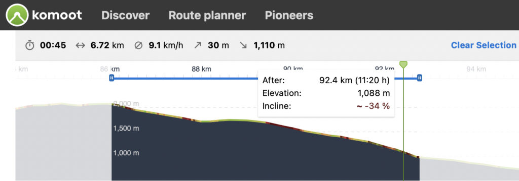 Par contre, une fois ce rodage effectué sur plusieurs sorties, c’est avec une pleine confiance que nous avons abordé les pentes montagnardes de la MB Ultime. Mais nous avons été surpris par un parcours bien plus technique qu’attendu et aussi particulièrement boueux, puisque cette première édition a été accompagnée par d’abondantes précipitations. Pour des descentes durant parfois plus de 20 minutes, notre choix d’un disque de 160mm à l’avant n’était certainement pas optimal. Nous avons senti le liquide Dot 5.1 bouillir et les plaquettes crier pour supplier qu’on leur donne un peu de répit alors que la boue abrasive venait les torturer. Bref, difficile d’imaginer pire traitement pour des freins de XC ! Et pour vous donner une petite idée, voir ci-dessous le profil d’une descente « type » de cette MB Ultime avec plus de 30% de pente moyenne !