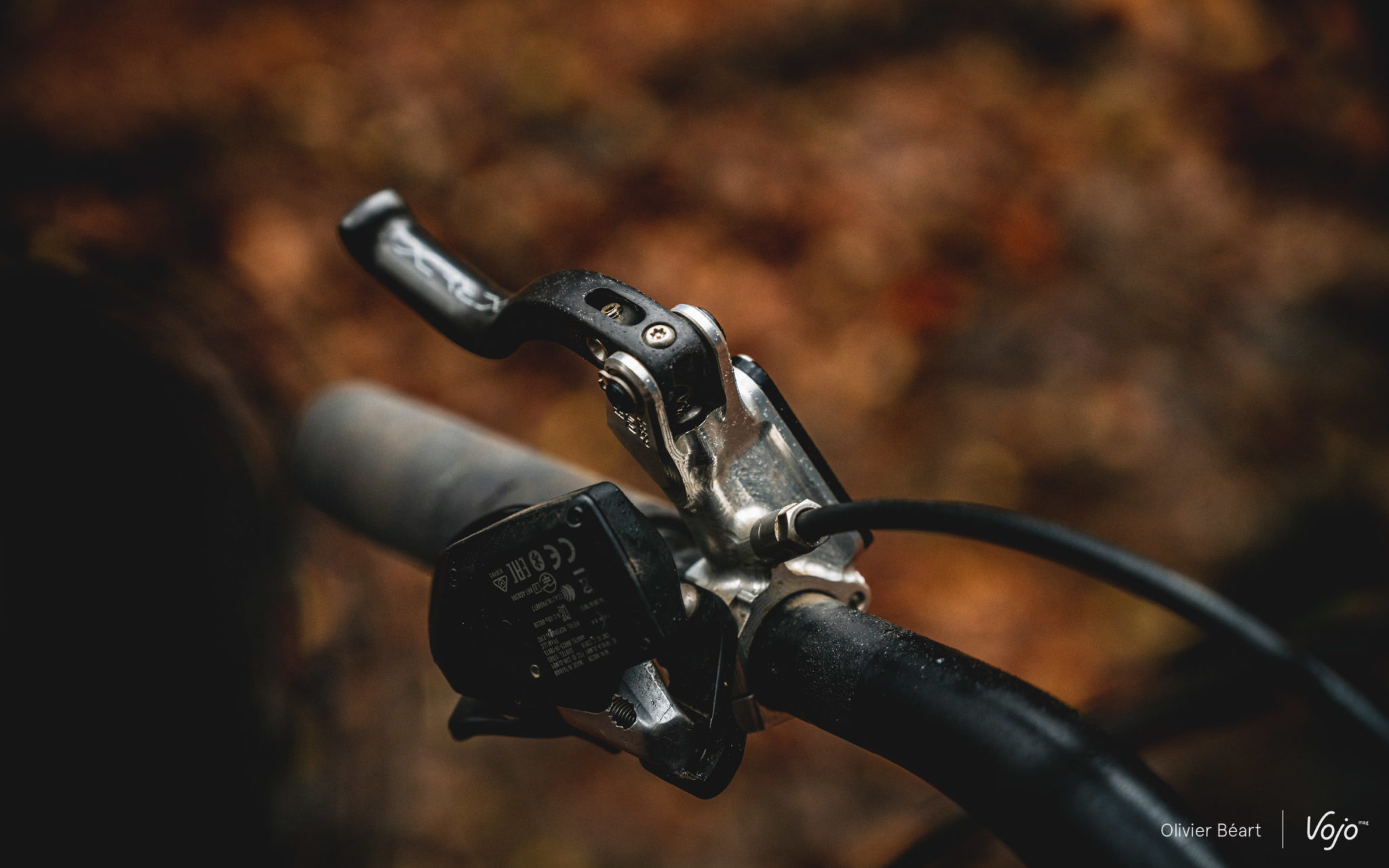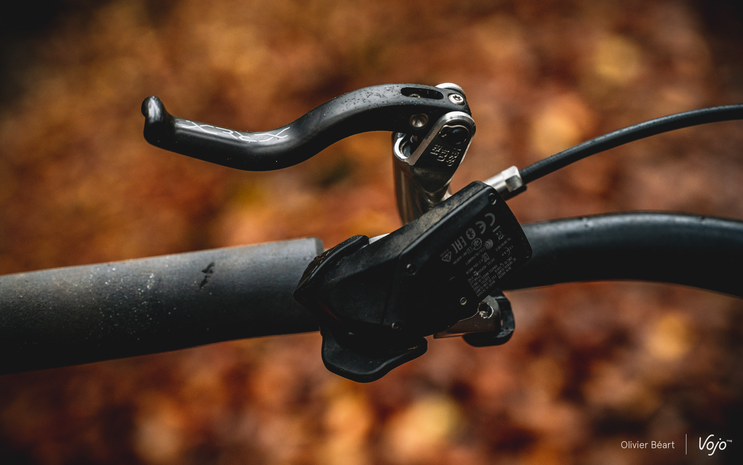 C’est une position à laquelle nous n’étions absolument pas habitués avec notre shifter AXS. Vous pouvez compenser un peu en faisant tourner la poignée de frein elle-même ou en montant le « rocker paddle » de Sram qui a une ergonomie un peu différente du levier AXS « basique », mais vous devrez de toute façon vous habituer un peu. On s’y est fait assez rapidement, mais on ne peut que regretter qu’il n’y ait pas d’ajustement possible à ce niveau, contrairement aux solutions Shimano (i-Spec) et Sram. Signalons tout de même que, à la longue, nous avons remarqué que cette position fixe nous a fait plus utiliser le bouton arrière du shifter AXS. Avait-on mal monté notre levier de vitesse AXS pendant tout ce temps ?