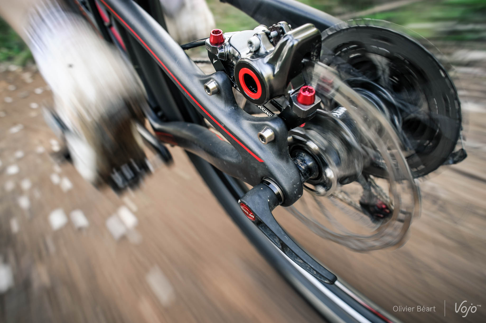 Magura avait créé une belle surprise lors du remplacement des Marta par les premiers MT8, apparus il y a trois saisons. C’est surtout leur levier entièrement en carbone qui a fait sensation à l’époque. Même si de petits soucis de jeunesse sont venus marquer leurs débuts, les MT8 ont su se faire une belle place parmi les freins hyper légers mais efficaces. Pourtant, Magura a jugé que ce n’était pas encore assez. Qu’il y avait moyen de faire mieux niveau puissance, modulation, gestion de la chaleur et onctuosité du levier. C’est ainsi qu’est née la génération MT Next cette saison, avec la refonte de la gamme existante, du MT2 au MT8, et l’apparition de deux nouveaux modèles à 4 pistons, les MT5 et MT7. Au niveau du levier, même si l’allure globale reste similaire aux « anciens » MT8, les changements sont nombreux. La forme du corps du maître cyclindre a été complètement revue. C’est encore plus flagrant sur cette version SL présente sur les MT8, puisqu’elle est 100% carbone, alors que les MT6 et inférieurs utilisent un mix carbone/thermoplastique injecté. Cela permet d’affiner encore plus les parois du MT8 et de faire ressortir ses galbes. Rarement l’adage « form follows function » n’aura été plus approprié. Grâce à cette construction, le levier des MT8 est probablement parmi les plus légers de la production actuelle, avec un poids qui ne dépasse pas les 20% de l’ensemble du frein (hors disque et visserie). Pourtant, Magura annonce également une rigidité et une solidité nettement supérieures aux concurrents en aluminium et magnésium. Il est vrai que nous avons, bien malgré nous, fait souffrir le levier de frein arrière dans une chute, où nous avons vu le vélo faire un magnifique vol-plané avant d’atterrir directement sur le levier juste devant nos yeux écarquillés. Bilan: seul un tout petit morceau de l’extrémité du levier est râpée. Pour le reste, RAS, même si ça fait toujours mal à voir, surtout à la 2e sortie! On veut donc bien croire les dires de la marque allemande. Pour être complet, signalons également l’apparition de deux mollettes de réglage. La première, située vers le bas du levier, est simplement une version « sans outil » du réglage de la garde présent sur la première version, mais qui nécessitait l’emploi d’une clé Torx T25. La seconde, sur le haut, est une nouveauté. Elle permet de régler le point de contact des plaquettes. Comme les leviers sont symétriques, elle est amovible et peut se retourner afin, si besoin, d’inverser ses freins (on ne vous le conseille pas forcément, mais si un jour vous revendez vos MT8 à un anglais…) Du côté de l’étrier, il y a aussi du changement. L’allure reste similaire, avec cette sorte de petite « queue de canard » typique à l’arrière, mais l’étrier donne l’impression d’être un poil plus massif. Bien qu’il garde ses pistons en matière synthétique de 22mm de diamètre, le corps a été redessiné pour plus de rigidité et une meilleure évacuation de la chaleur, synonymes de plus de puissance. Les plaquettes sont de 4e génération et d’office organiques pour des performances optimales. Les « Sintered », réputées plus durables, ne sont plus proposées. Il est vrai qu’elles montent plus vite en température et que même les précédentes versions organiques de Magura ne s’usaient pas vite du tout. Ce changement n’a donc rien d’inquiétant sur le long terme. On se réjouit par contre de voir que le système MagnetiXride est reconduit. Il permet de se passer de ressort pour maintenir les plaquettes contre les pistons, grâce à un petit aimant logé dans les pistons. C’est pratique quand on change de plaquettes à l’atelier, mais aussi sur le terrain puisqu’on ne risque pas d’emmêler ce petit bout de métal dans les disques lorsque les garnitures sont en fin de vie (je vois à votre regard que vous avez déjà vécu ça!). Sur la balance, ces modifications font prendre un peu d’embonpoint aux MT8. S’il n’y a pas de changement du côté des disques Storm SL (pesés ici en 160 et 180mm), ainsi que la visserie (en alu pour les étriers et en acier pour les disques), nous avions pesé les précédents MT8 à 180g pour l’avant et 192g pour l’arrière, soit 31g de moins que la dernière mouture. Les MT8 2015 pesant au total 662g tel que montrés ci-dessus. Un surpoids pleinement justifié Si on devait aujourd’hui comparer les MT8 à d’autres freins du marché, ce serait inévitablement aux Shimano XT, XTR Trail, voire au Saint. Qui sont tous plus lourds, voire carrément beaucoup plus lourds (nous n’avons pas encore testé les nouveaux XTR en version XC). Et qui n’offrent pas non plus autant de modularité que les MT8, même si la puissance pure est très proche. Nous ne sommes pas persuadés non plus de l’intérêt des deux mollettes de réglages sans outil de la garde et du point de contact. Ce dernier n’est pas très sensible (il faut vraiment y prêter très attention pour sentir la différence) et pour la garde, sur un frein qui se veut léger, les vis T25 des précédents modèles nous suffisait amplement. Enfin, tant qu’à parler de Torx, nous sommes toujours réservés quant aux vis de fixation des étriers en alu. Leur look très brut de fonderie n’a rien d’intéressant et l’empreinte pour la clé a tendance à se marquer, après seulement quelques serrages. Nous les avons d’ailleurs remplacées par d’autres vis en titane et alu pour la fin du test (voir photos d’action). Si vous pensez que light peut (et doit!) rimer avec puissance, ainsi qu’avec solidité, les MT8 sont faits pour vous. Et si vous pensez aussi que la puissance n’a de raison que si elle est mâitrisée, vous allez les adorer et vous leur pardonnerez quelques détails qui, nous l’espérons, seront rapidement corrigés par Magura.