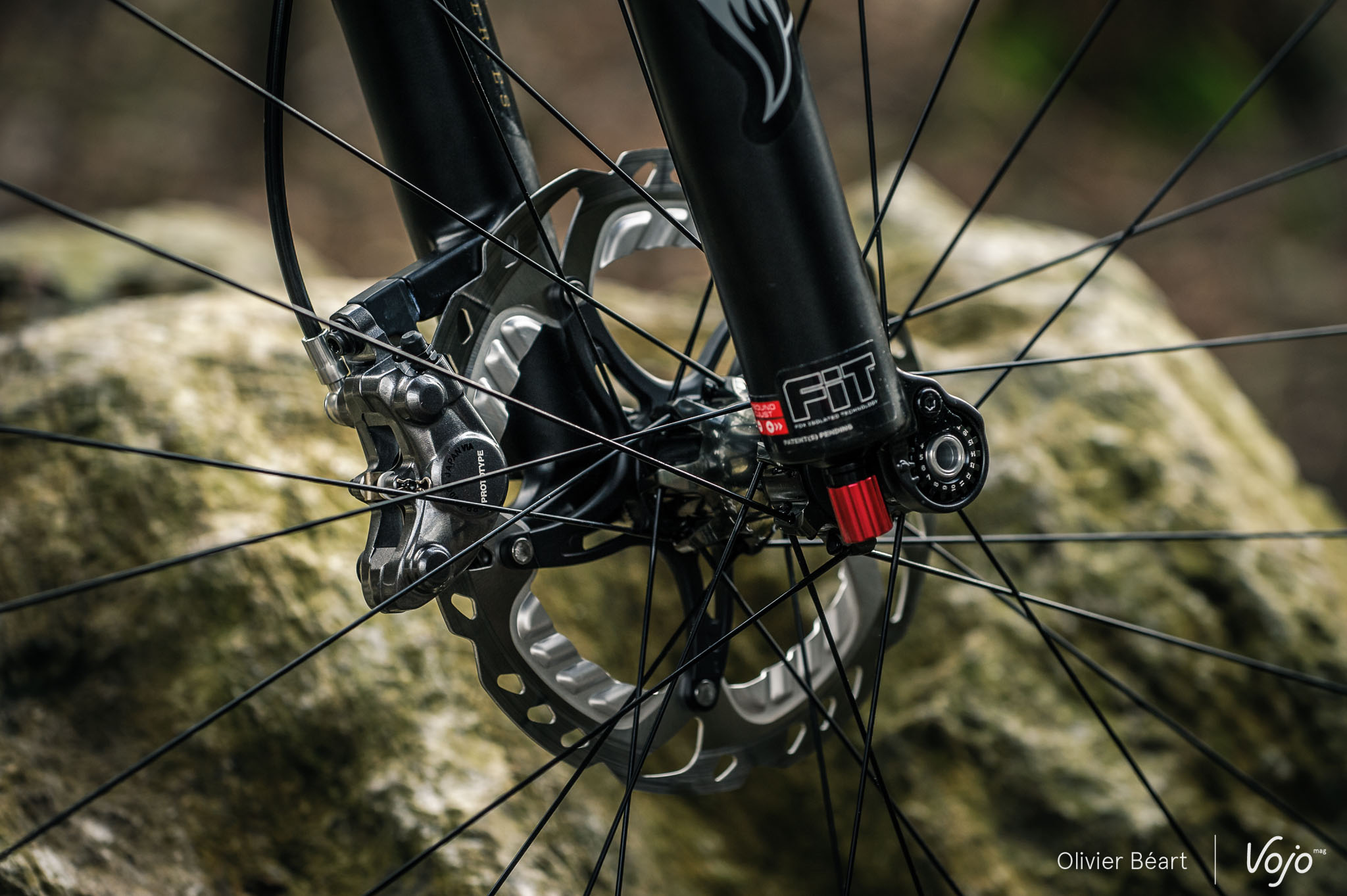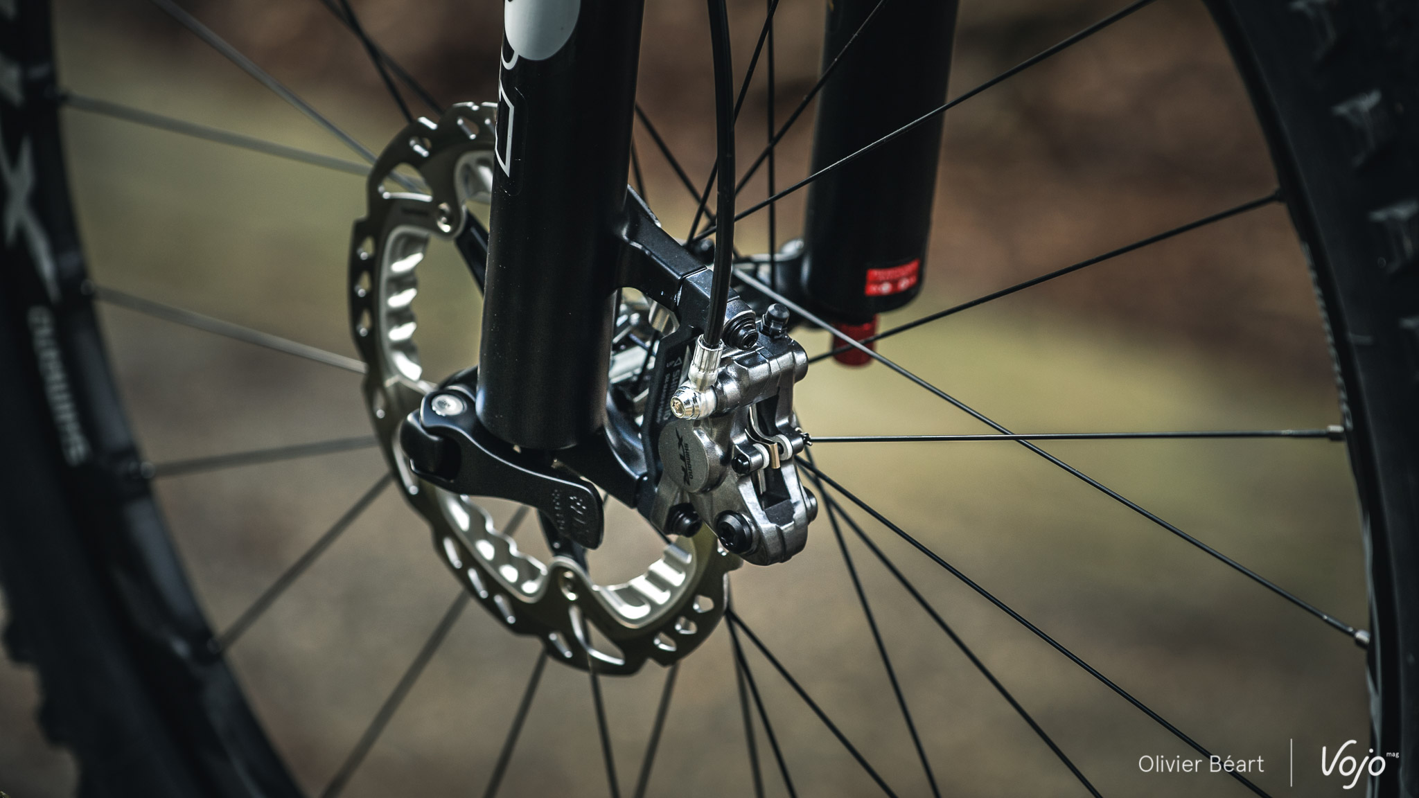 Pour vraiment éprouver le frein au niveau de sa puissance, nous avons fait le choix de rouler non seulement en 180mm comme sur la première paire défectueuse, mais aussi de passer sur un disque de 160mm à l’avant comme à l’arrière. Si cette solution ne conviendra pas aux pilotes lourds pour qui un poil plus de puissance sera indispensable, pour des crosseurs de 70 à 80kg, un petit disque suffit amplement. Car nous avons cette fois enfin entre les mains un vrai bon frein constant, facilement dosable et à la puissance adaptée au programme pour lequel il est conçu.