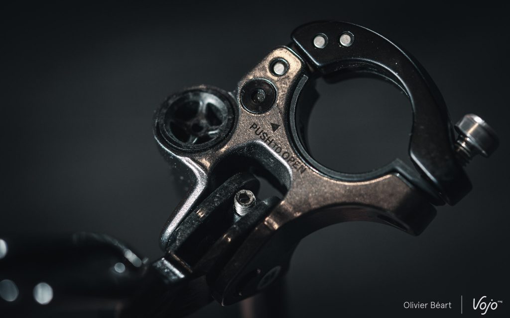 Le montage de nos nouveaux freins XTR M-9000 est toujours aussi facile. Trouver le bon alignement se fait en quelques secondes, tout comme le placement sur le cintre grâce aux colliers fins. Le dispositif de sécurité imposant d’appuyer avec une petite pointe pour ouvrir ledit collier n’est pas très pratique et ne nous semble pas indispensable mais il s’agit d’un détail (photo ci-dessous).