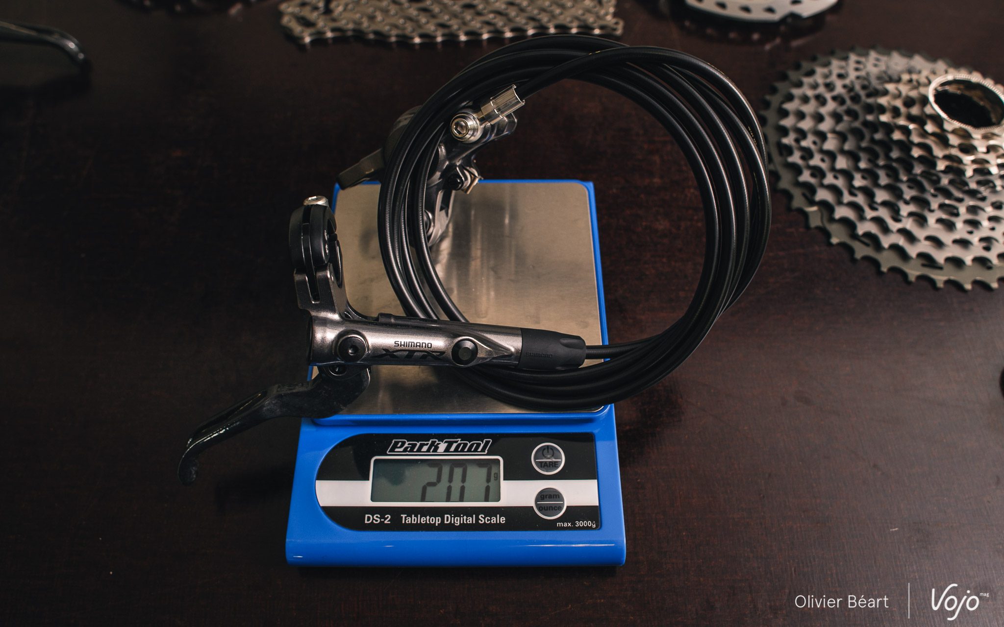 Il faut dire que côté poids, les freins Shimano XTR Race font fort. Avec un ensemble avant à 190g (levier/étrier), on est face à un des modèles les plus légers du marché ! Le même ensemble Magura MT8 est à 199g, un Sram Level ULT pèse 215g et un Hope X2 Race est aussi à 200g. Seul Formula fait mieux avec le R1 Racing qui tourne autour de 170g. On avait rarement connu Shimano en tête de la course au poids, mais on ne peut que s’en réjouir.