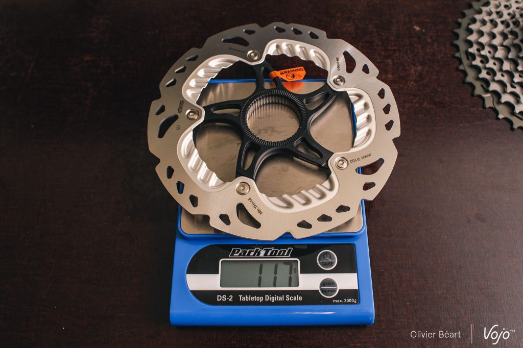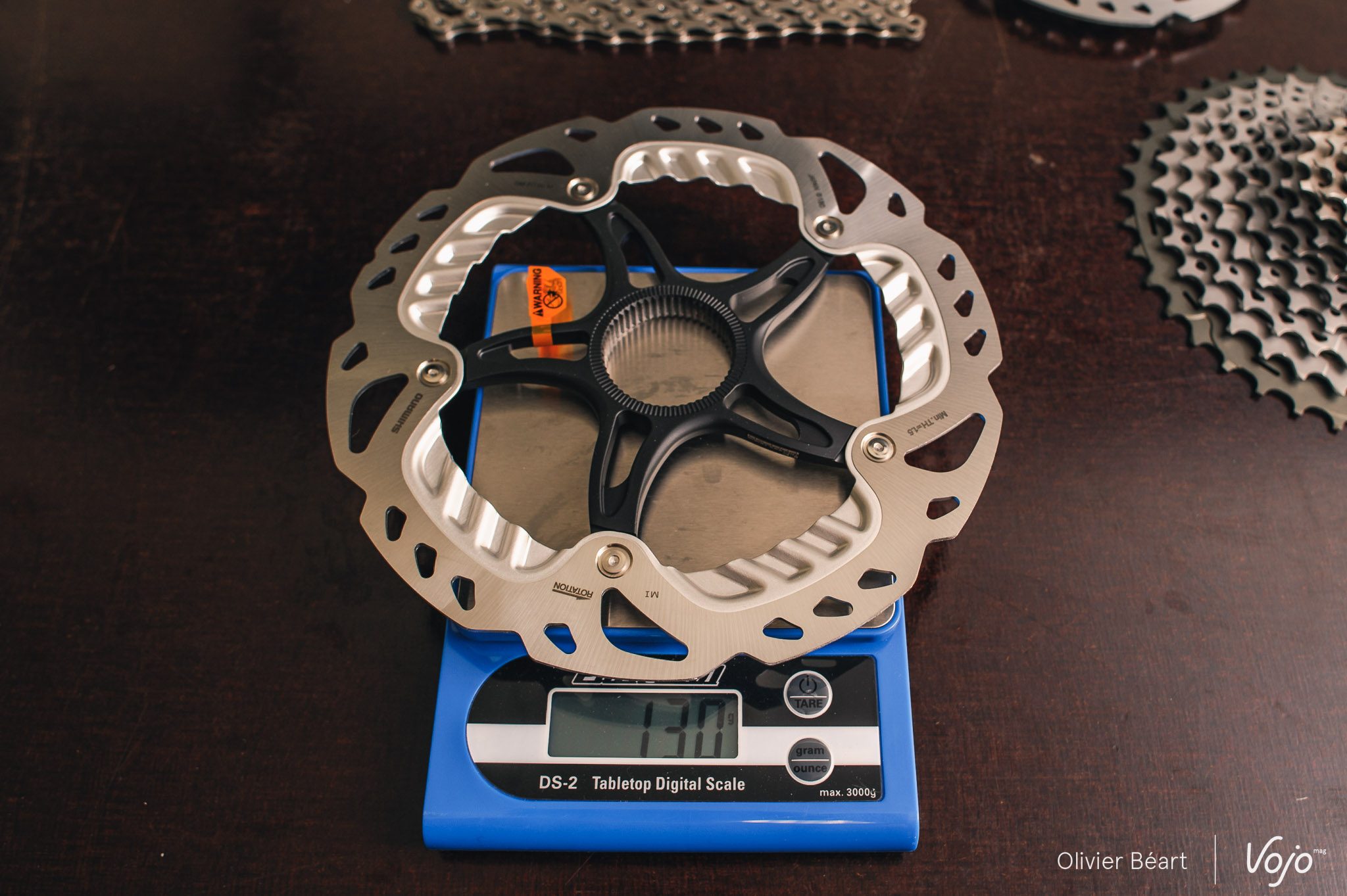 Dans le cas qui nous occupe ici, avec 130 et 116g en 180/160mm, signalons tout de même que les derniers modèles Centerlock sont plus légers que par le passé et se rapprochent du poids de disques classiques. Ils sont aussi dotés de petites « ailettes » en aluminium en bordure intérieure de la piste de freinage pour aider au refroidissement.