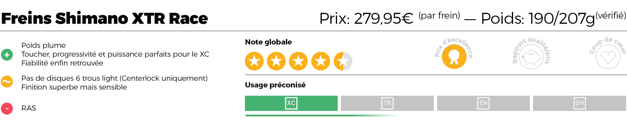 Après un gros loupé sur sa première génération de freins XTR, Shimano a bien redressé la barre. On peut regretter qu’aucun rappel officiel n’ait été lancé même si la sécurité des utilisateurs n’était pas en danger et s’il semble que tous les propriétaires de la première version ne se sont pas plaints des mêmes soucis que nous. Mais il apparaît néanmoins que la marque échange sans difficulté les freins de première génération dont la défectuosité est avérée. Aujourd’hui, on peut enfin apprécier les qualités de ces freins particulièrement légers mais dont les performances sont parfaites pour un usage XC/Marathon exigeant. Espérons qu’il n’y ait plus de ratés à l’avenir, histoire que les freins Shimano retrouvent l’image de fiabilité et de performance qu’ils avaient jusque là.