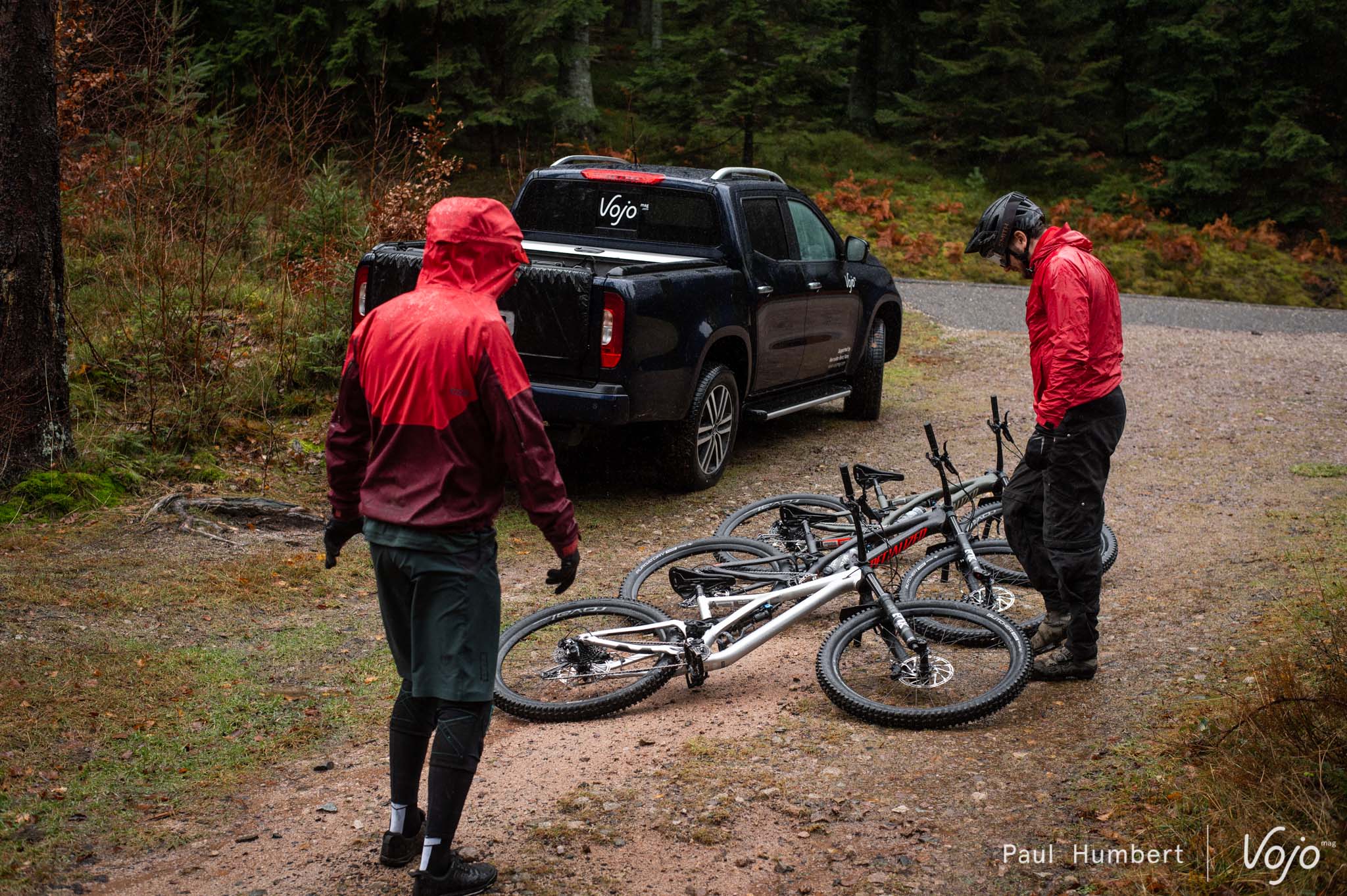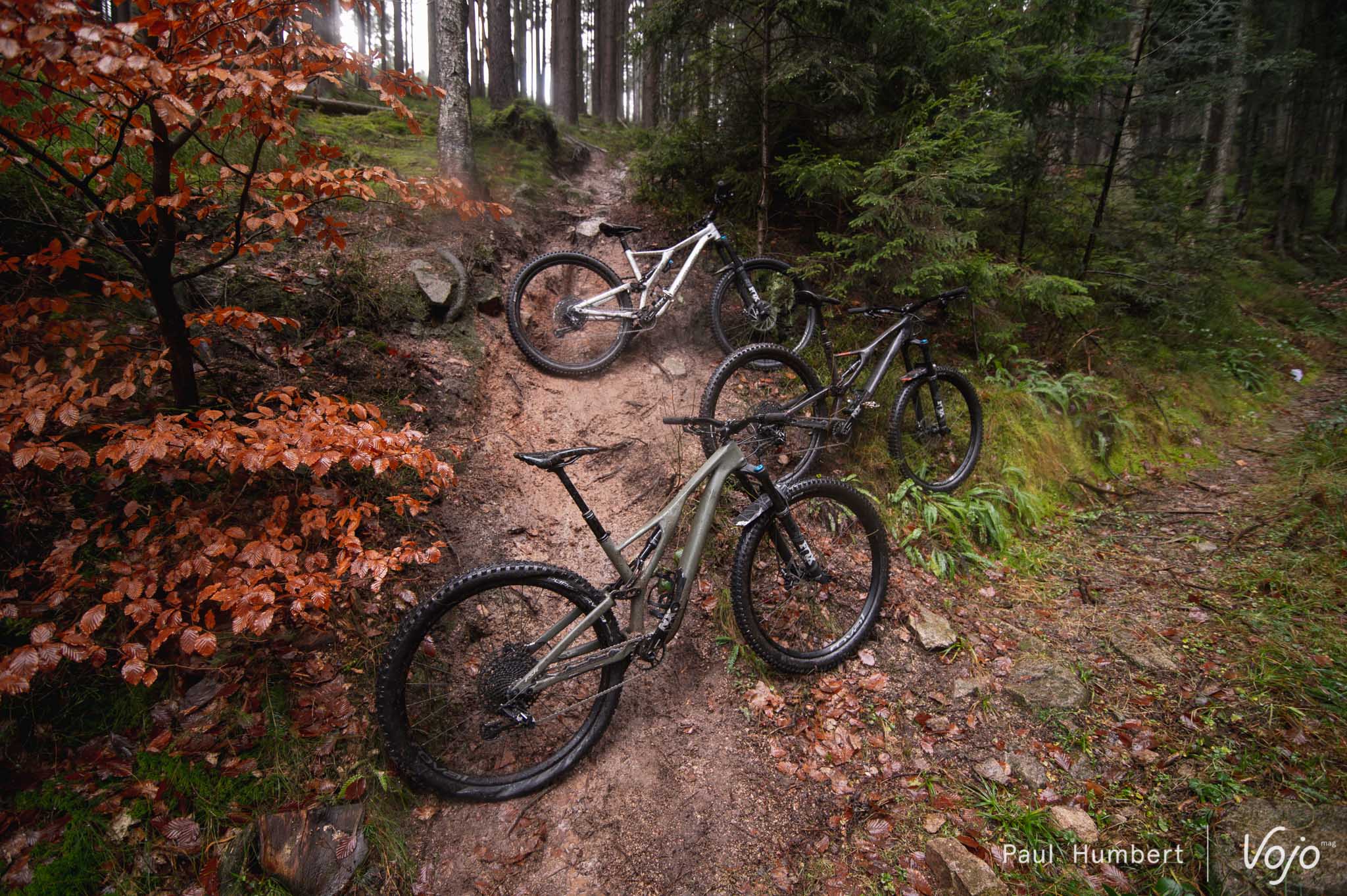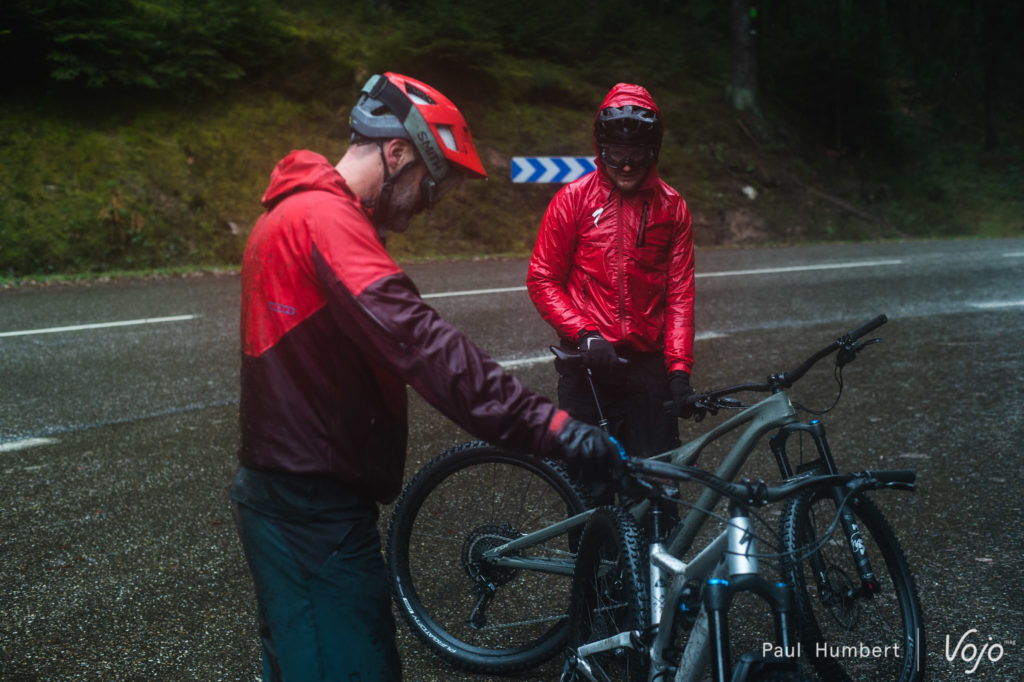 Chacun a roulé le vélo pendant plusieurs semaines « à la maison », sur ses trails de référence, mais nous nous sommes aussi retrouvés tous les trois en Alsace, du côté du Mont Ste-Odile, pour une journée d’échange des vélos et de limage d’une seule et même piste au guidon des trois machines, histoire de voir de manière plus nette des différences et de tester les vélos des autres. Cette journée s’est déroulée sous une pluie battante, mais le terrain bien drainant a permis malgré tout de bien cerner les capacités de chaque machine.