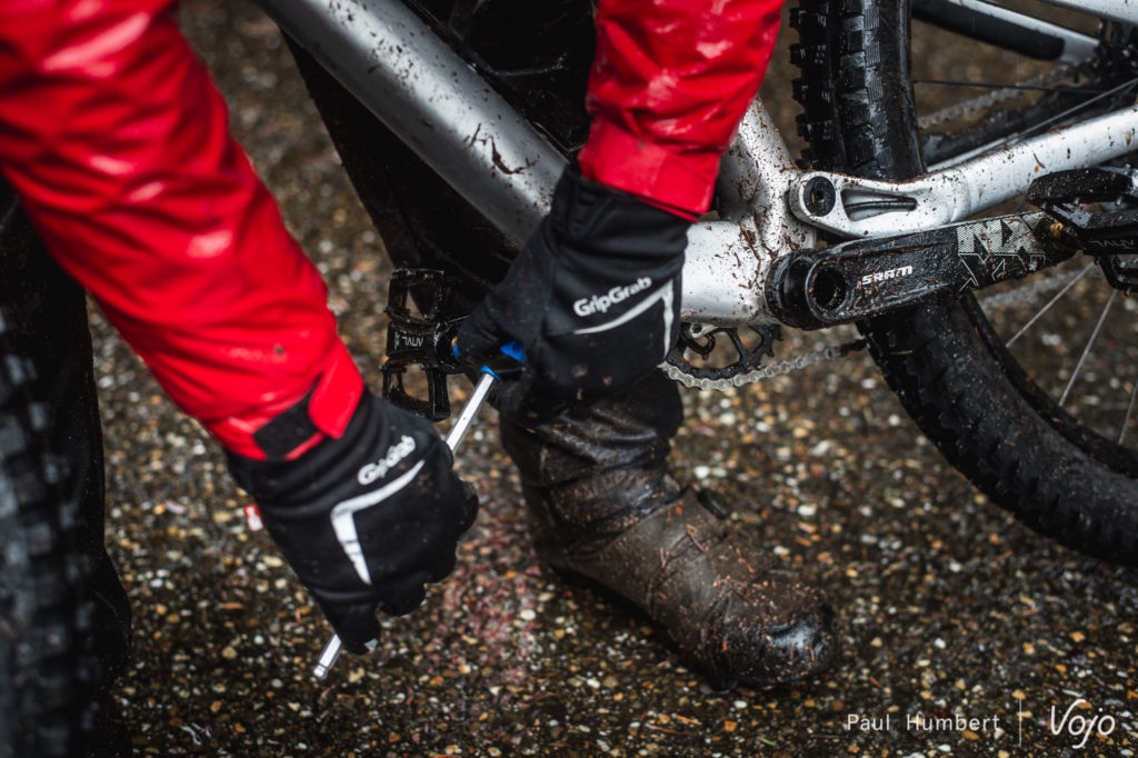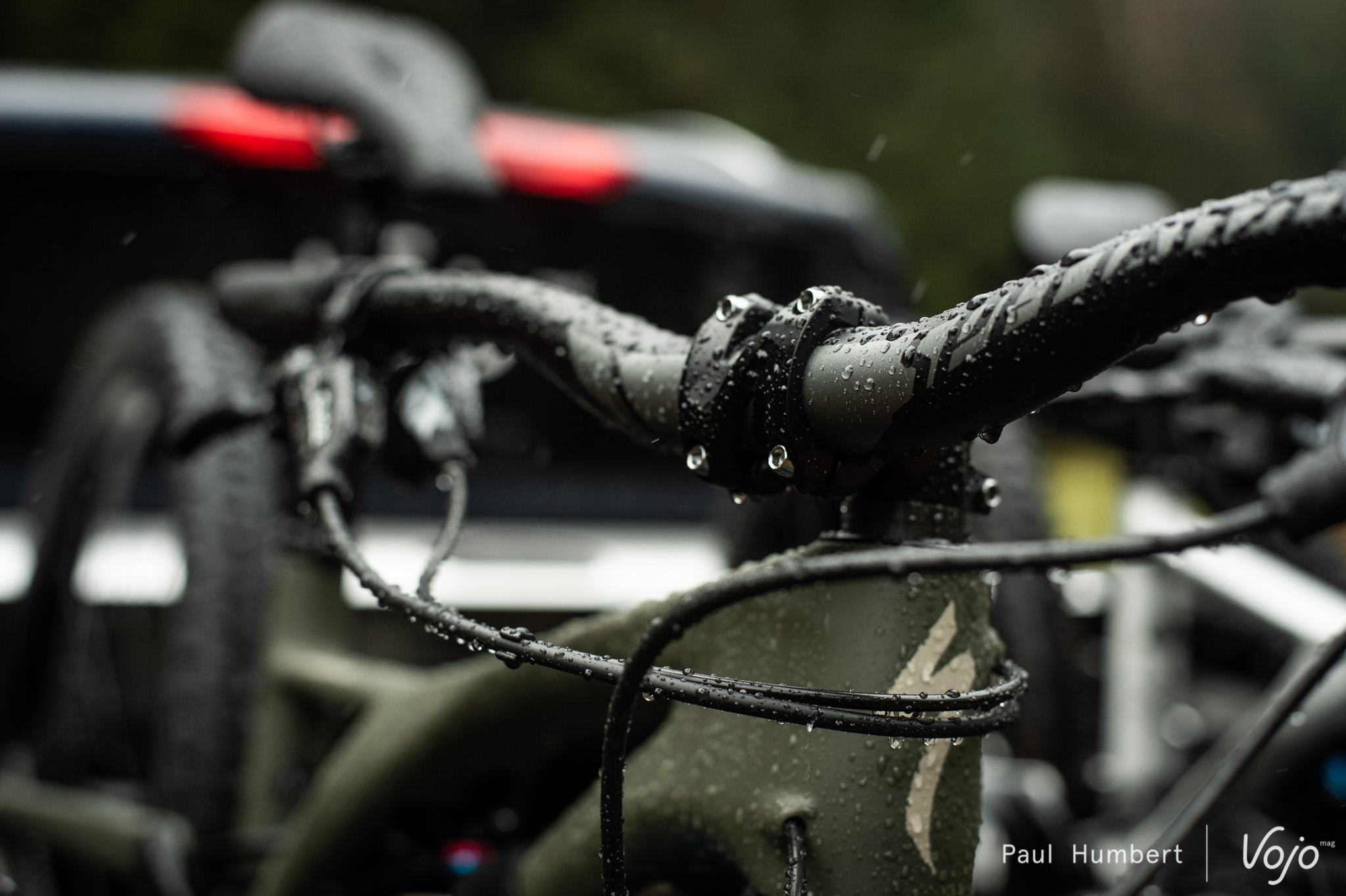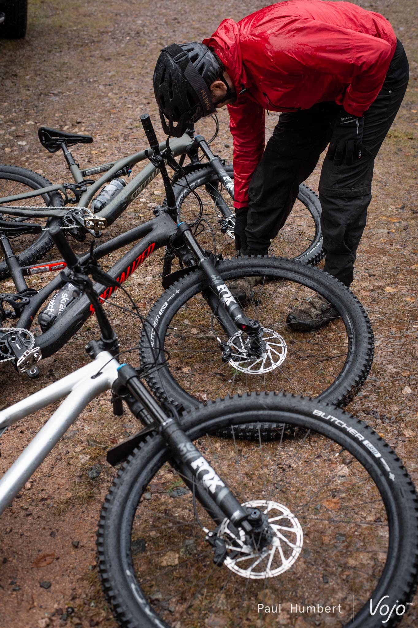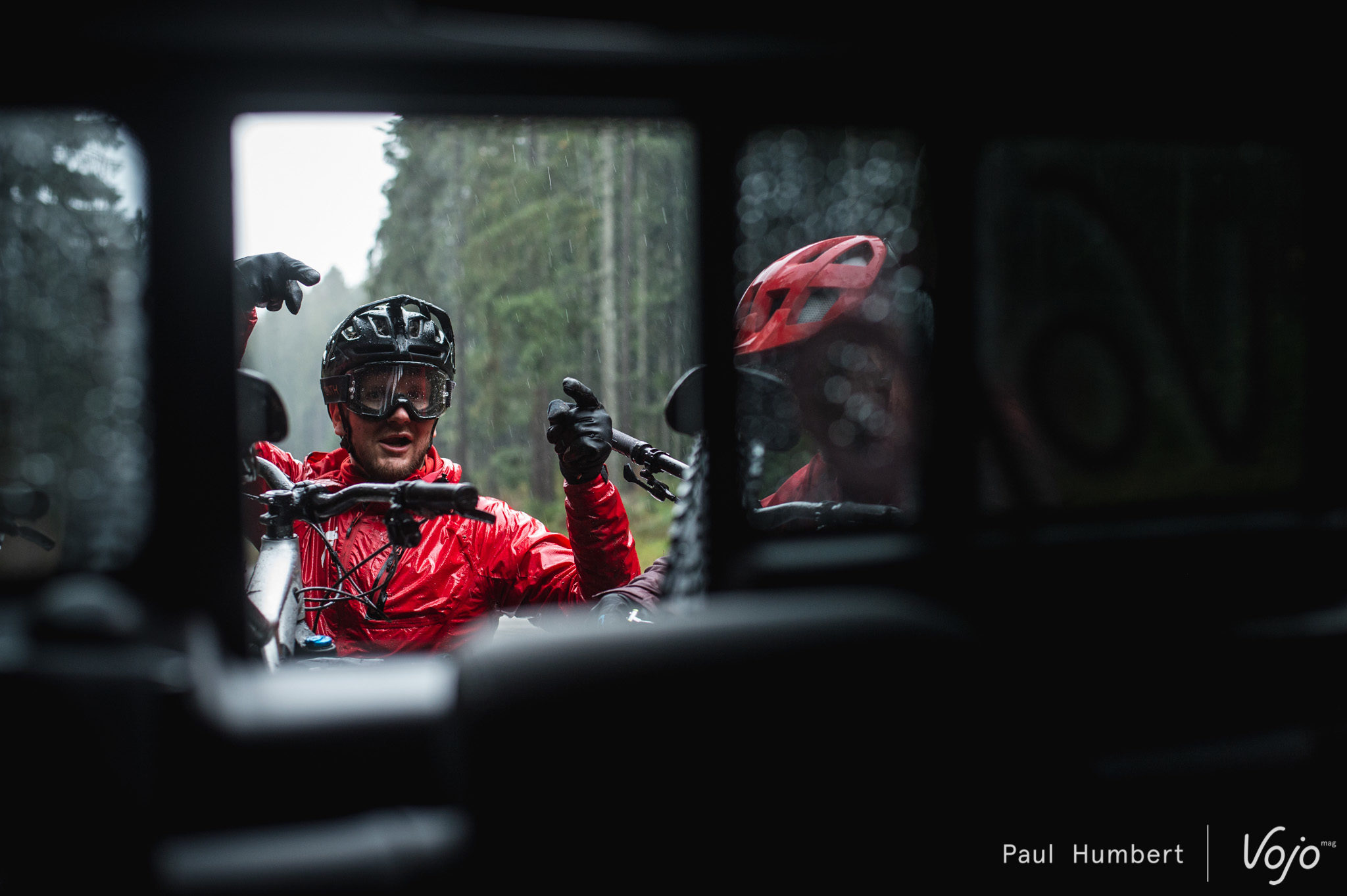 Chacun a roulé le vélo pendant plusieurs semaines « à la maison », sur ses trails de référence, mais nous nous sommes aussi retrouvés tous les trois en Alsace, du côté du Mont Ste-Odile, pour une journée d’échange des vélos et de limage d’une seule et même piste au guidon des trois machines, histoire de voir de manière plus nette des différences et de tester les vélos des autres. Cette journée s’est déroulée sous une pluie battante, mais le terrain bien drainant a permis malgré tout de bien cerner les capacités de chaque machine.