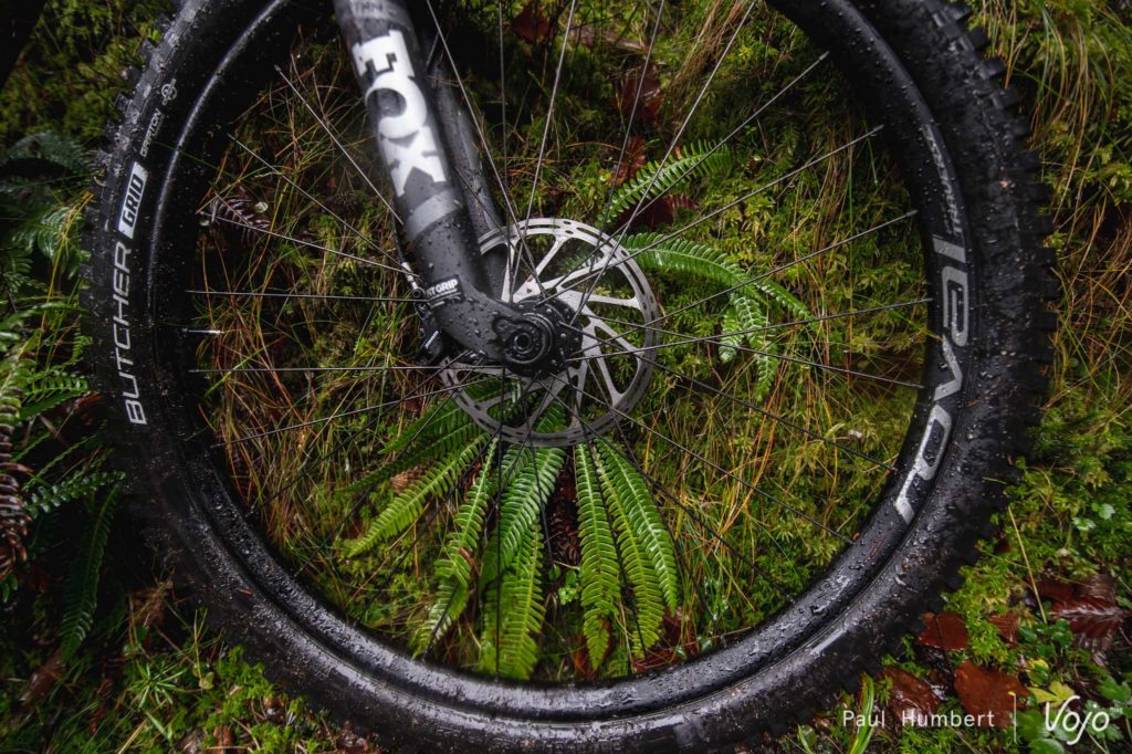 Les roues Roval en alu sont les mêmes sur les trois modèles. Il s’agit de la version entrée de gamme, assez lourde mais solide et agréable, et dotée des mêmes jantes que sur les modèles plus haut de gamme. Seuls les rayons et les moyeux diffèrent. Les jantes sont en 30mm de large sur tous, mais Specialized a fait des choix de pneus différents : Butcher avant et Purgatory arrière (un peu plus roulant) sur les ST et LT, et Butcher partout sur l’Evo. Plus important : le ST est en 2.3, quand les deux autres sont en 2.6 de section. Habituellement nous aimons beaucoup ces pneus, mais ici nous avons connu un nombre de crevaisons assez inhabituel et les flancs nous ont paru bien souples, surtout sur l’Evo qui incite à piloter plus vite et agressivement.