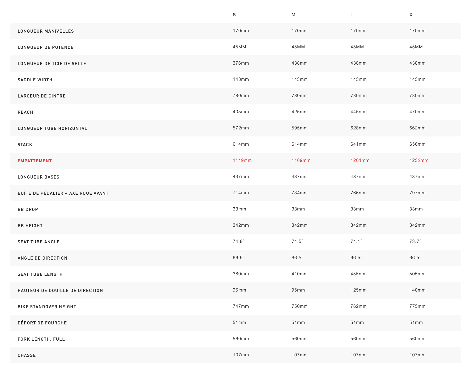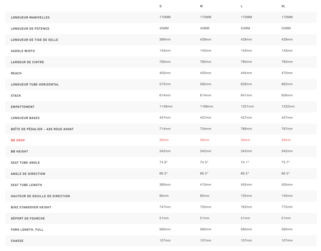 Specialized est souvent cité comme référence pour la qualité de ses géométries et surtout leur capacité à faire des vélos qui conviennent à un large spectre de pratiquants sans non plus être trop passe-partout. Les ST et LT ont une géométrie assez classique, surtout au vu des dernières évolutions en la matière. Cela se voit notamment au niveau du reach qui n’est franchement pas long (425 en M/445 en L sur le 140/150). Corollaire, le déport de fourche reste sur du 51mm contre 44 sur la plupart des derniers vélos sortis, car il n’y a pas ici de grande longueur de cadre à compenser.
