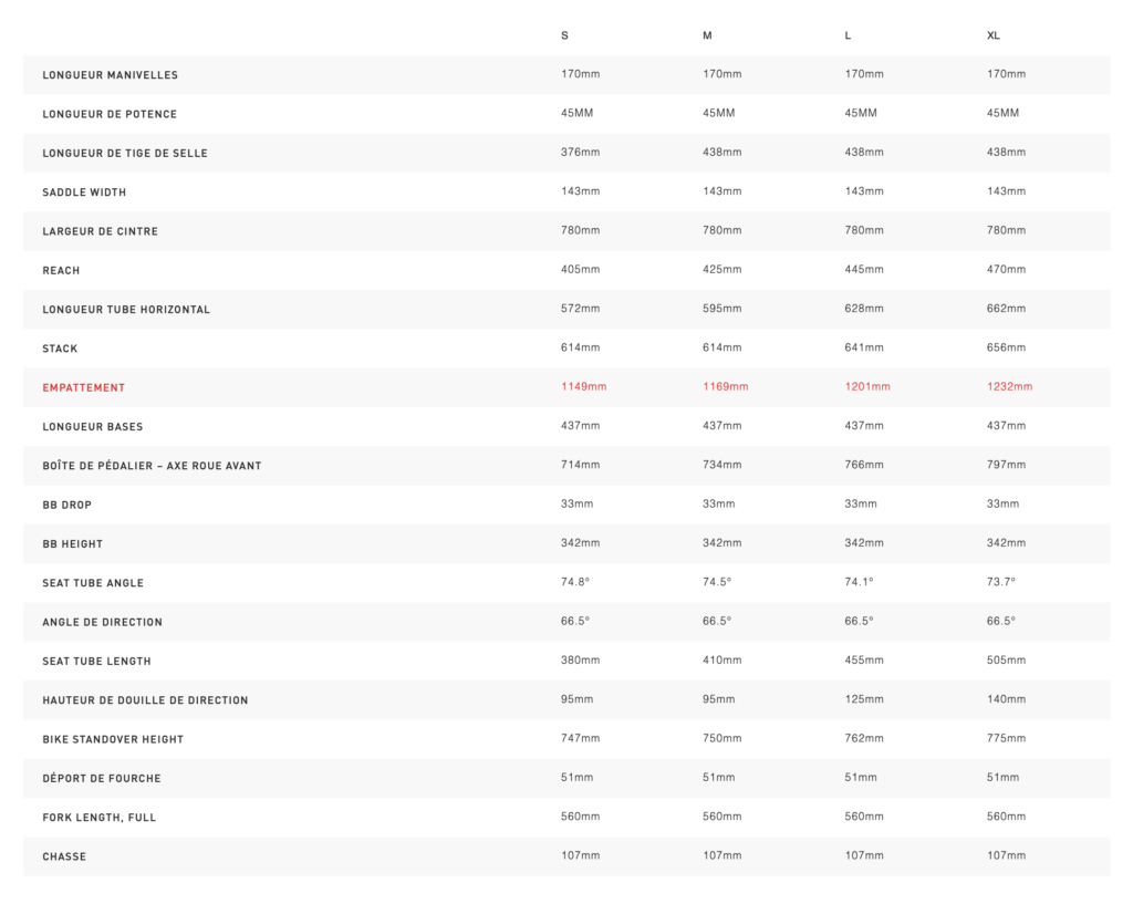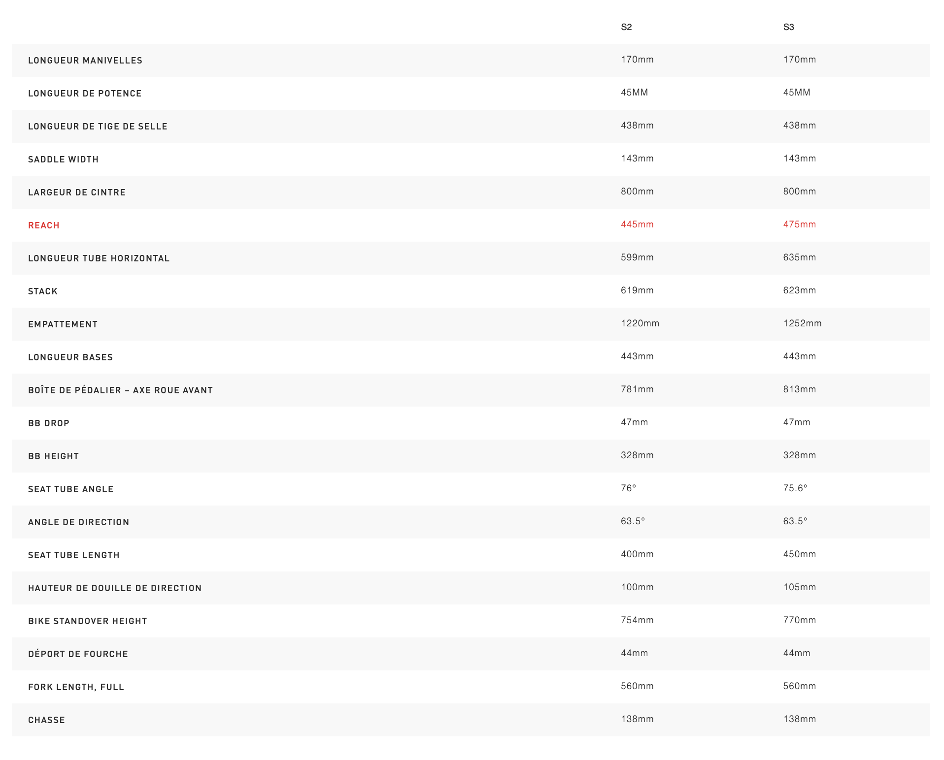 Par contre il y a peu de points communs en géométrie avec l’Evo. Logique, il s’agit d’un cadré spécifique. On ne retrouve que deux tailles au catalogue, qui perdent leur dénomination classique (s, m, l et xl) pour une plus en rapport avec leur caractère, selon qu’on cherche un vélo long ou… très long ! En gros, le S2 correspond à un L et le S3 à un XL, mais c’est clairement un vélo qui, contrairement à ses deux frères, joue dans la catégorie des géométries osées pour ce débattement.