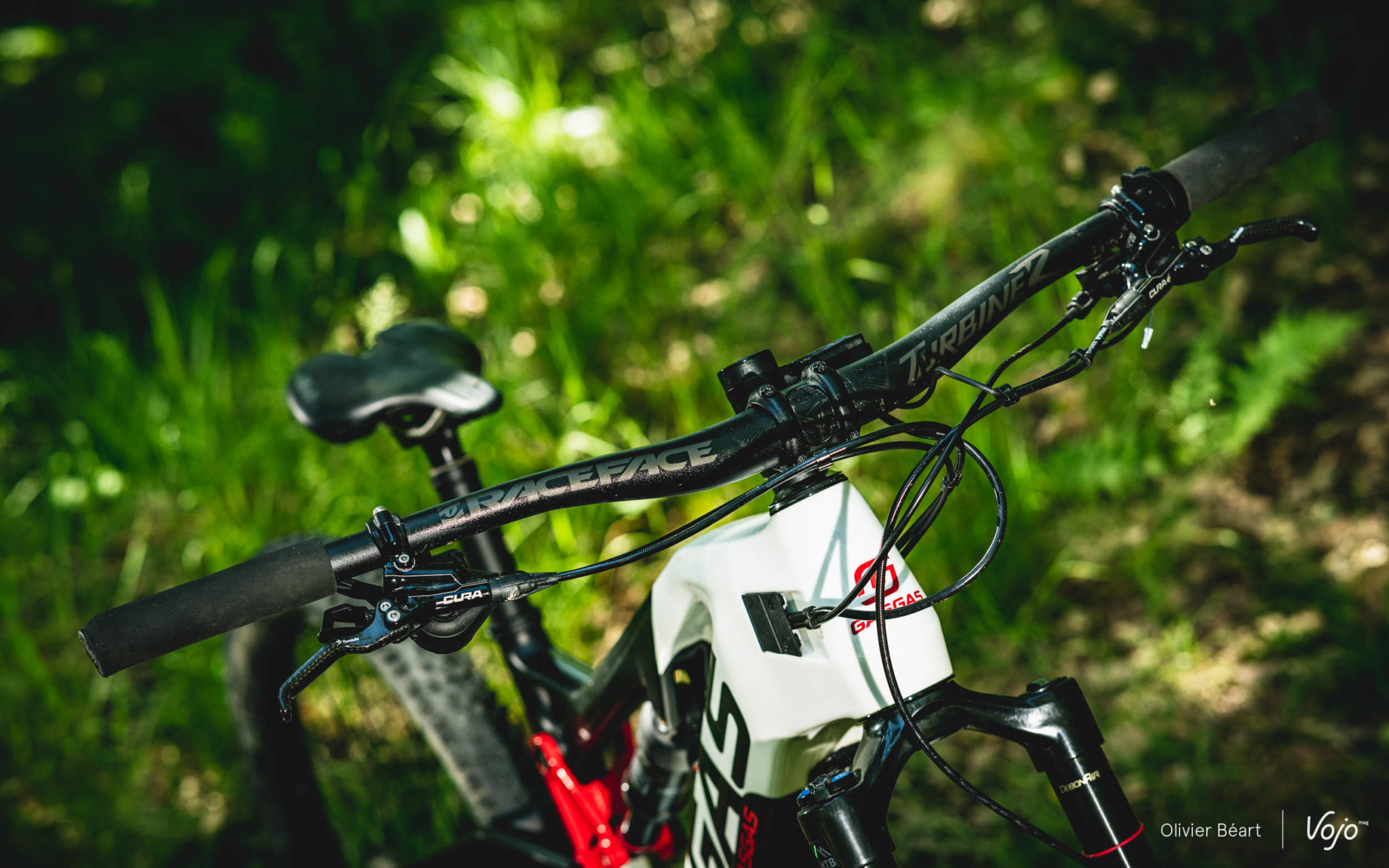 Le poste de pilotage provient de chez RaceFace avec une potence Aeffect de 35 mm de long et un cintre Turbine de 780 mm de large. Les grips silicone sont plus fréquents sur des vélos de XC que sur des ebikes, mais on a apprécié d’en retrouver sur ce GasGas. En plus d’être confortables, ils permettent aussi de gratter pas mal de grammes par rapport à des grips classiques. Le reste des composants sont maison, avec notamment cette tige de selle en provenance de chez GasGas de 150 mm de débattement.