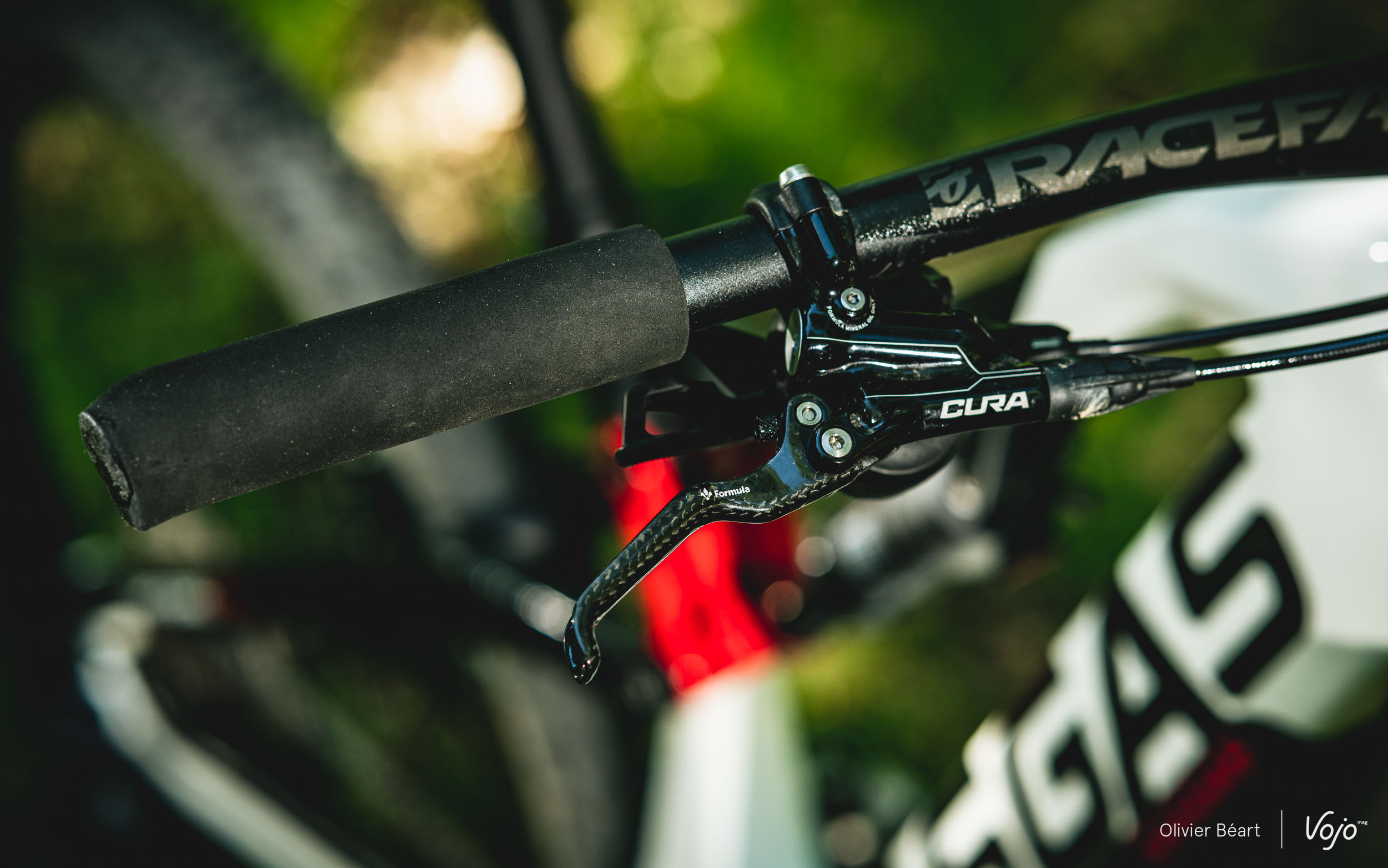 Côté freinage, on passe chez Formula, avec des Cura 4 pistons à l’avant et 2 pistons seulement à l’arrière, associés à des disques de 203 mm à l’avant et 180 mm à l’arrière. Petit détail peu fréquent sur des vélos à ce prix : c’est la version haut de gamme avec leviers en carbone qui est montée sur ce modèle ! Alors, clairement, cela ne change pas vraiment le fonctionnement, mais c’est toujours agréable de constater ce genre de petite attention valorisante pour le vélo.