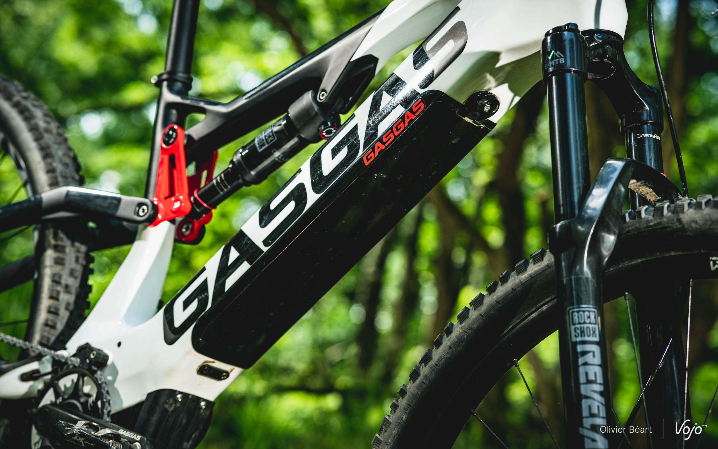 Tout comme Shimano ou Brose, Yamaha permet l’utilisation de batterie provenant de fabricants tiers. GasGas s’est ainsi tourné vers Simplo, géant taïwanais de la batterie, et a opté pour un modèle d’une capacité de 500 Wh. La batterie est amovible et peut être retirée par le bas du tube diagonal. Cependant, il est important de noter que l’interface de recharge diffère selon que la batterie est rechargée en étant directement branchée ou si elle reste sur le vélo et est rechargée via la prise située en bas du tube vertical. Il convient également de noter que le modèle plus haut de gamme est doté d’une plus petite batterie de 400 Wh dans le but de gratter encore un peu de poids.