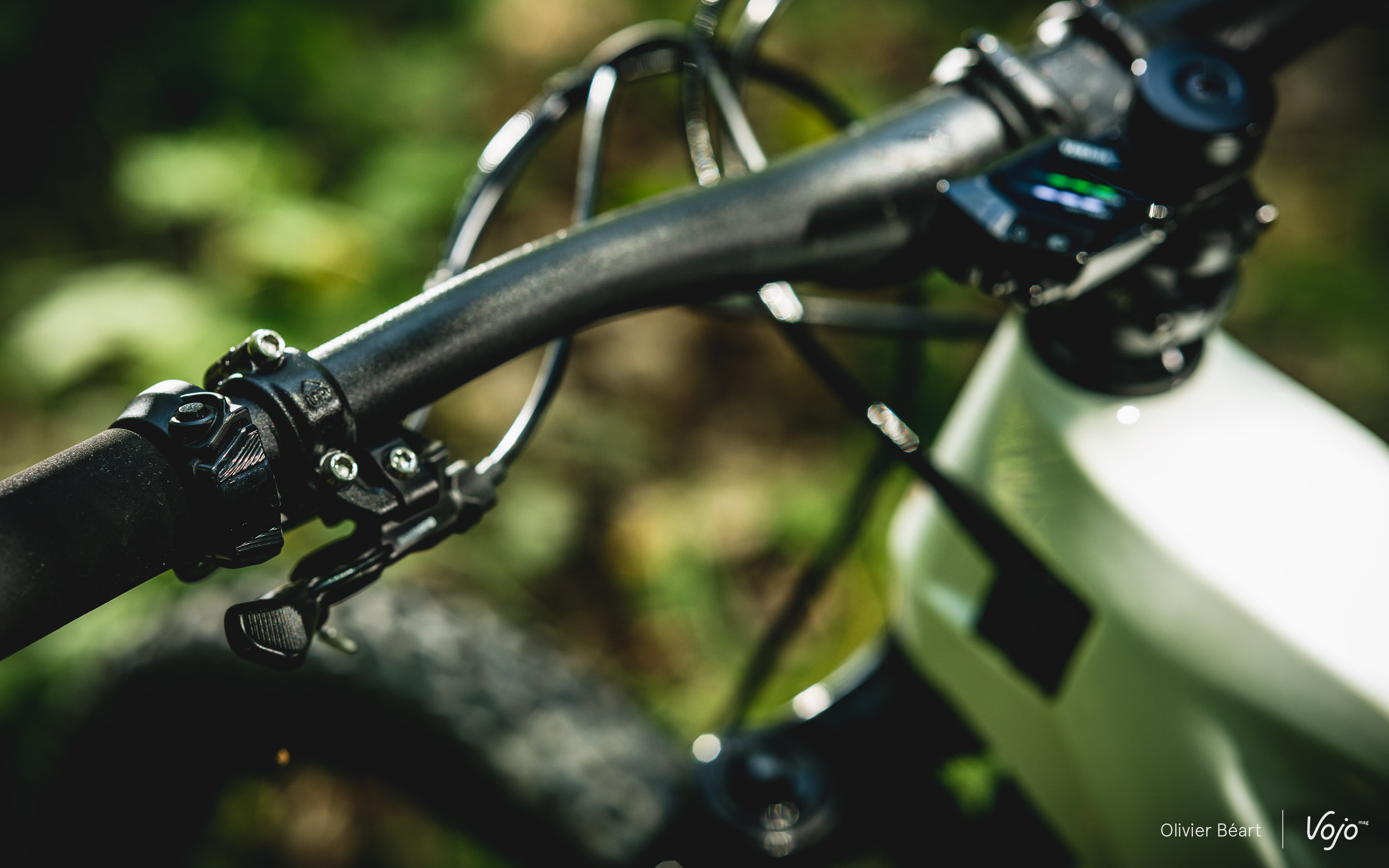 La navigation entre les différents modes s’effectue grâce à une discrète commande au guidon, couplée à un écran placé à côté de la potence. Celui-ci permet de connaitre le mode d’assistance choisi (diodes de différentes couleurs) mais également le niveau de charge de la batterie. Un petit bouton sur le coin inférieur gauche permet de contrôler un éclairage et fait varier la luminosité des diodes de l’écran entre deux niveaux. Qu’importe le niveau choisi, nous avons eu tendance à trouver que ces diodes étaient trop lumineuses, au point d’être dérangeantes une fois la pénombre tombée ou lors d’une virée de bon matin avant la levée du soleil. Mais, bien que basique et souffrant de ce défaut lié à la luminosité, cet afficheur reste plutôt fonctionnel.