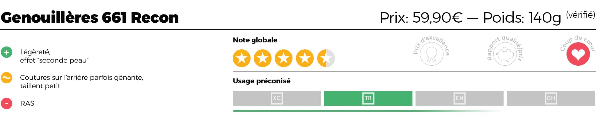 Après de longs mois d’essai, nous trouvons un excellent challenger pour la Bliss Minimalist. Une fois encore, on enfile une paire de genouillères là on aurait rechigné à « s’équiper » auparavant. Notre coup de coeur va même un petit peu plus loin car on s’habitue à porter ces protections ultra-légères qui offrent une sécurité supplémentaire. À défaut de nous protéger réellement, elles permettent de limiter la casse efficacement. Pour les pratiques les plus engagées, il faudra vous forcer à utiliser un modèle plus adapté. Les 661 Recon sont devenus notre « minimum syndical » et si elles pourront encore être un tout petit peu améliorées, elles représentent déjà une très bonne entrée en matière. Sachez également que des coudières Recon sont disponibles et utilisées par le Specialized Gravity Team de Loïc Bruni.